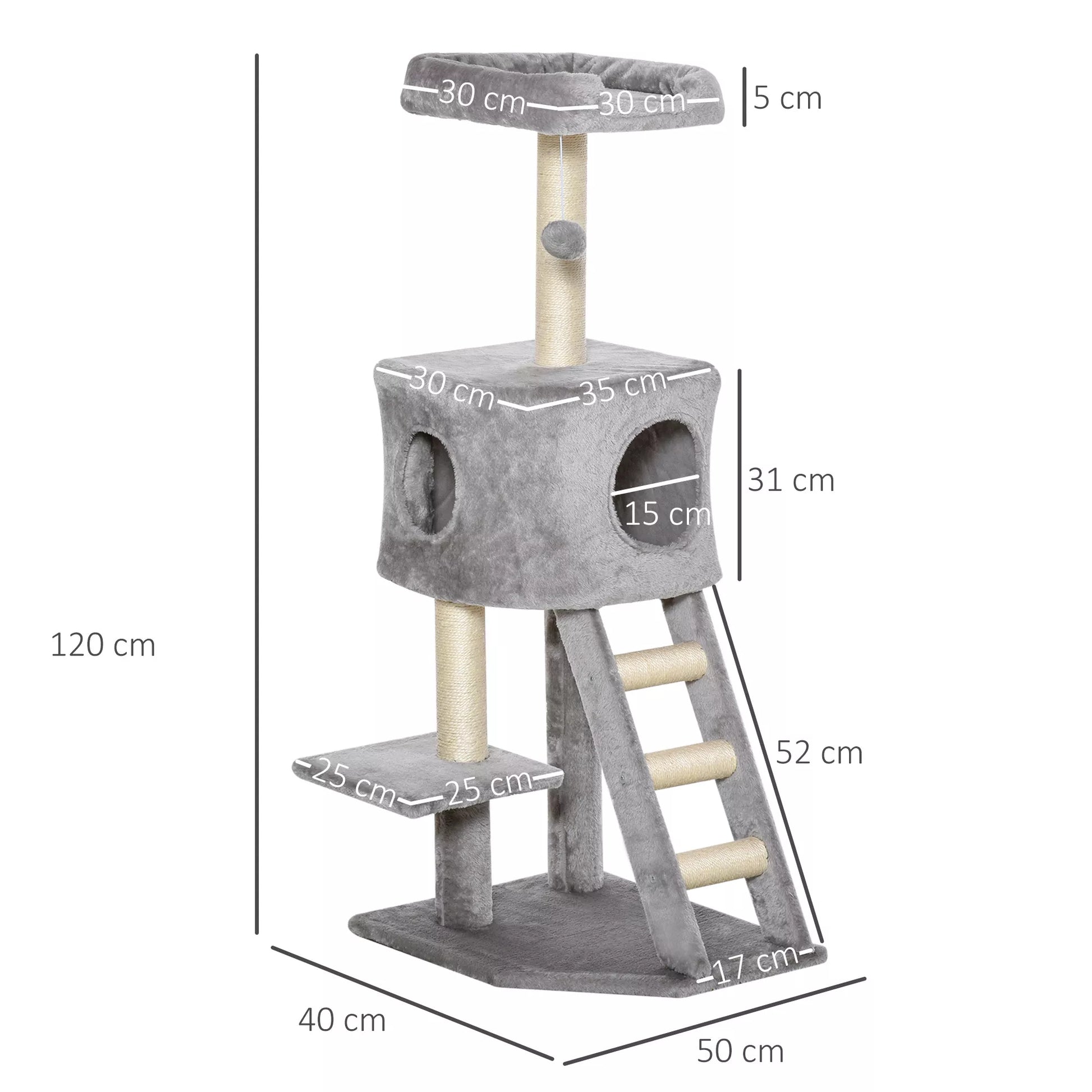 Cat tree 120 cm, Cat tower with cave, toy ball, sisal poles, platform, steps, multi-level cat scratching post, climbing tree for cats, light gray