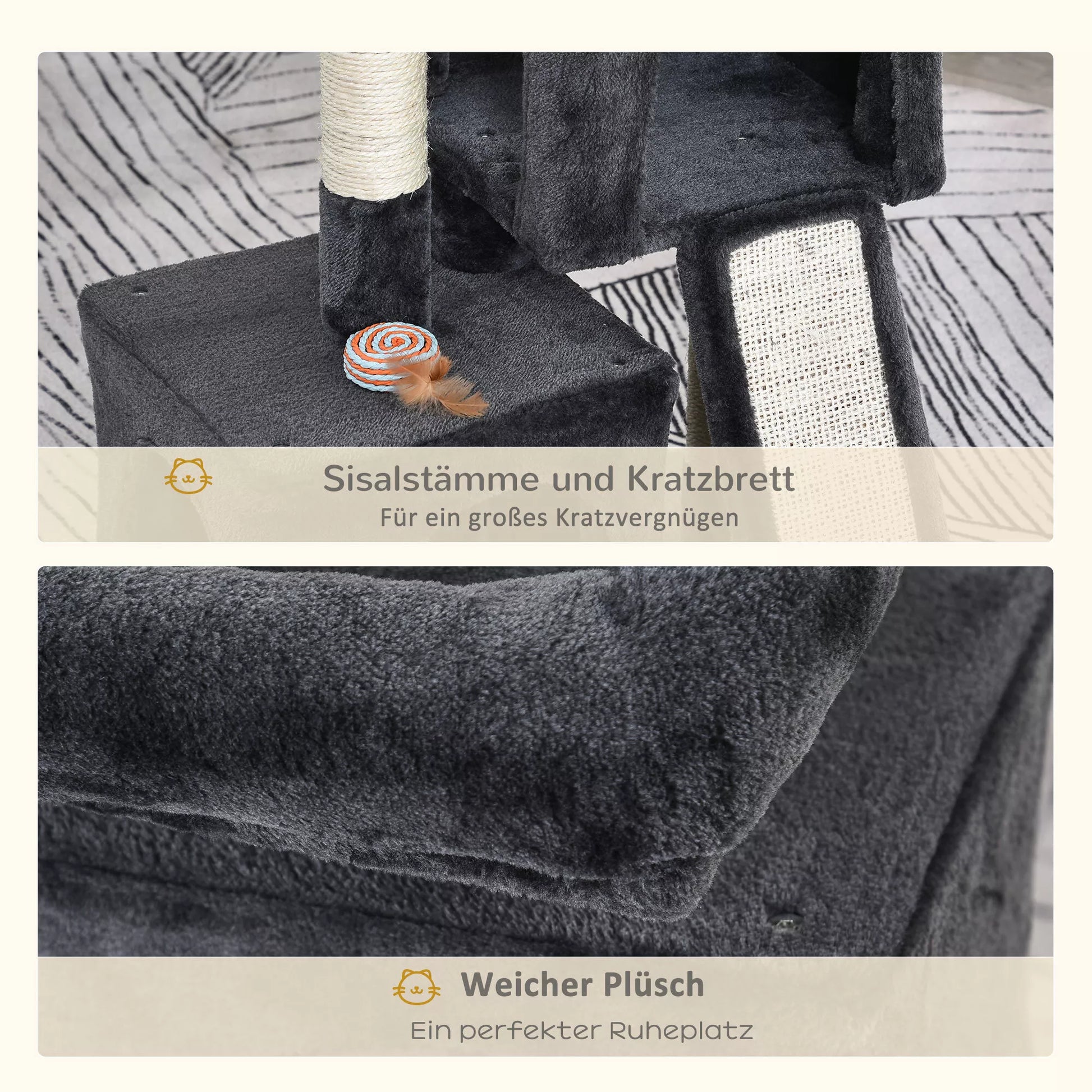 This cat scratching post will keep your pets occupied for hours. It offers a place to play, rest and sharpen their claws. The cat scratching post consists of two niches and several resting platforms, all covered in soft plush. There is a sisal post for sharpening claws and a scratching board. Your pets will be able to sniff until they are full on this sturdy cat furniture.