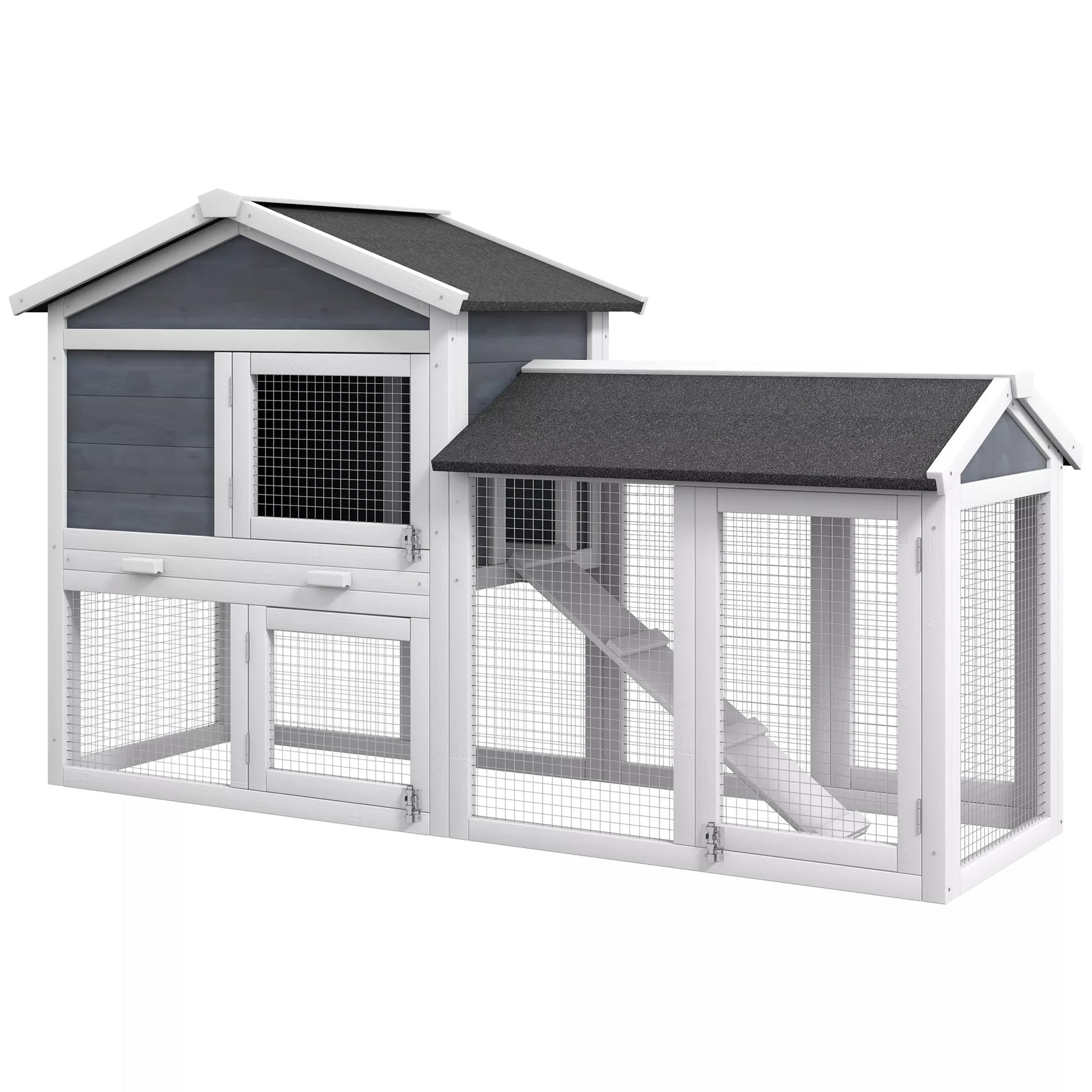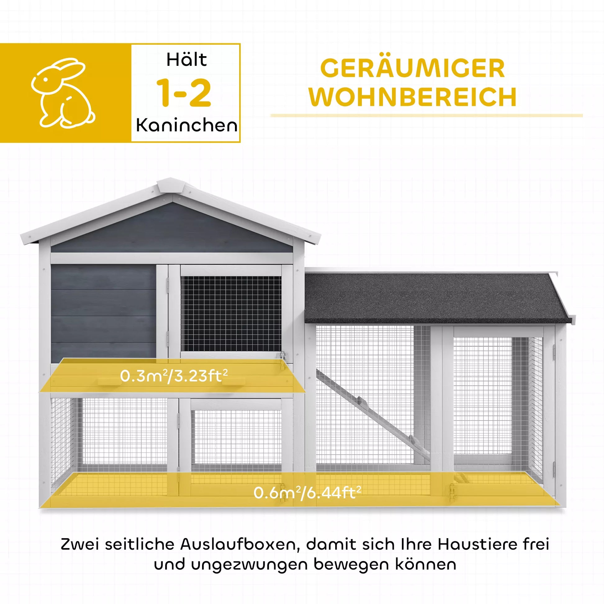 Whether it's dwarf rabbits or other small animals, this versatile rabbit hutch is the perfect home! Two lockable front doors and a small animal enclosure bottom tray provide easy access for feeding and cleaning. The pitched roof with bitumen coating is weatherproof and prevents precipitation from accumulating. Give joy to yourself and your animals with this beautiful and cozy home!