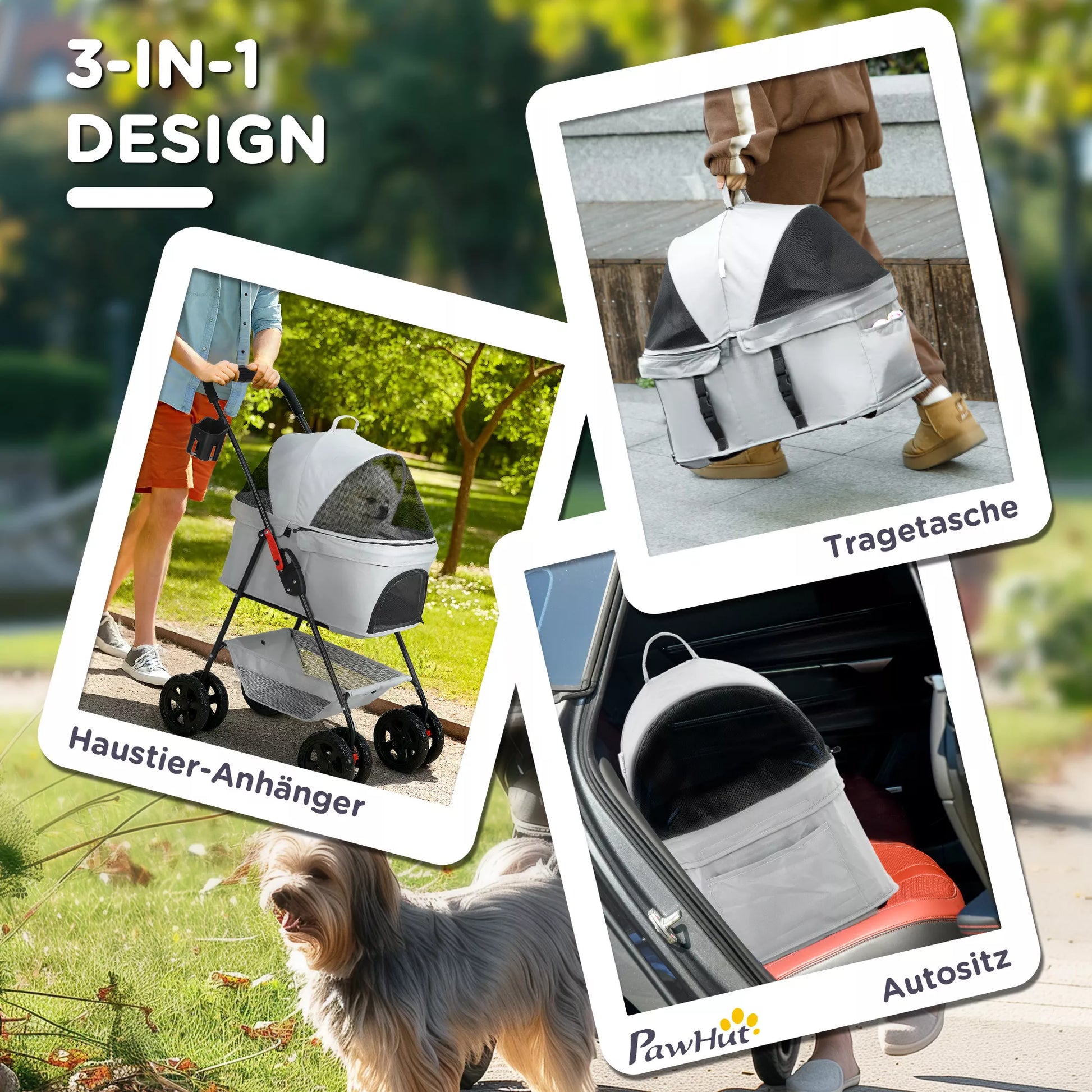 - ✔ 3-in-1 šunų vežimėlio dizainas, kuris virsta automobiline kėdute arba nešyne