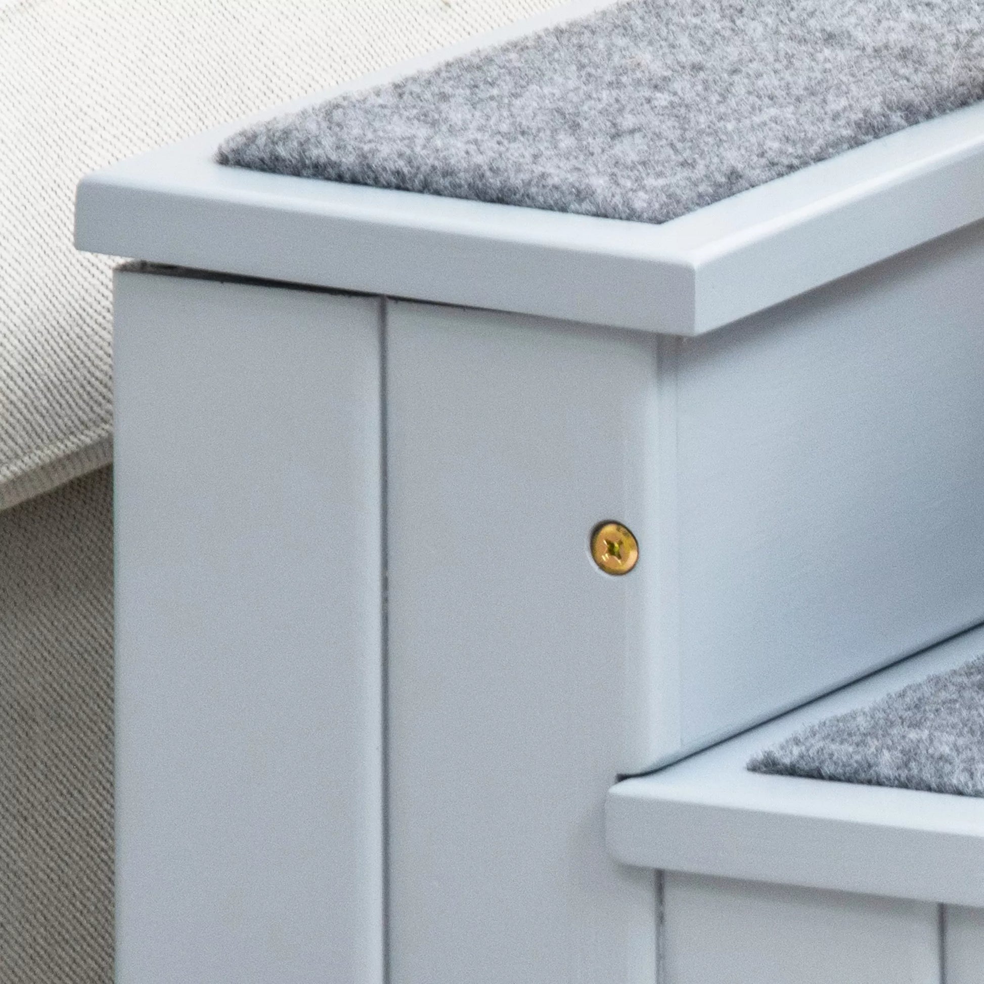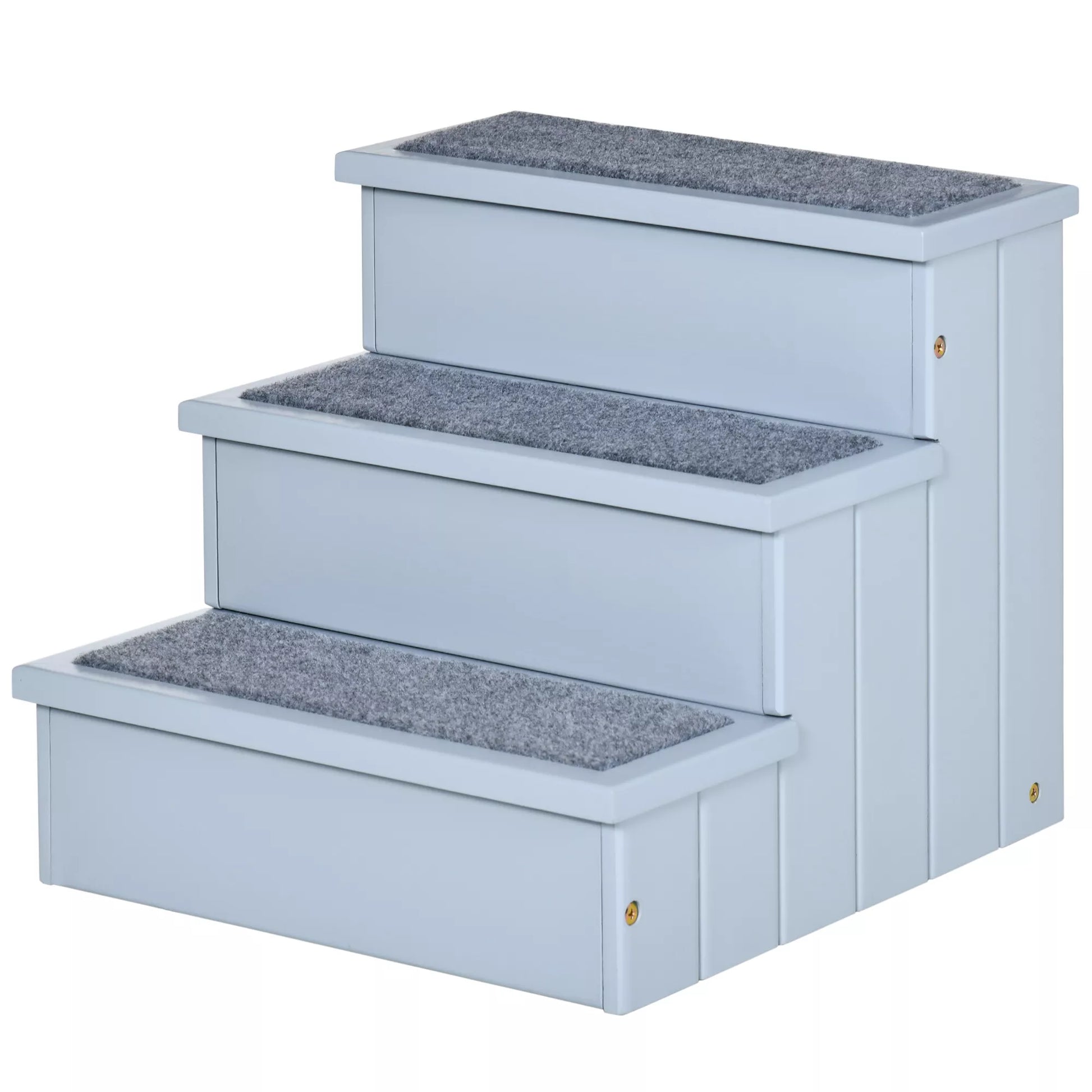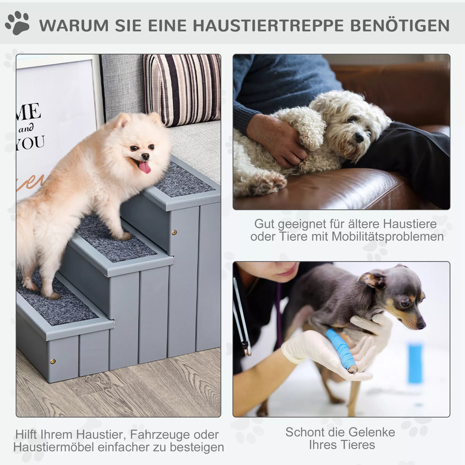 Da vyresni augintiniai dažnai kenčia nuo judrumo problemų, naminių gyvūnėlių laipteliai gali padėti. Su jais seni ar ypač maži šunys gali lengvai užlipti ant sofos ar į automobilį. Po pakopomis taip pat yra daug vietos daiktams laikyti, kur galėsite sutalpinti bet kokio tipo reikmenis jūsų augintiniui. Laipteliai pagaminti iš tvirto eglės medienos, o atskiros pakopos padengtos neslystančiu adatinio veltinio kilimu.
