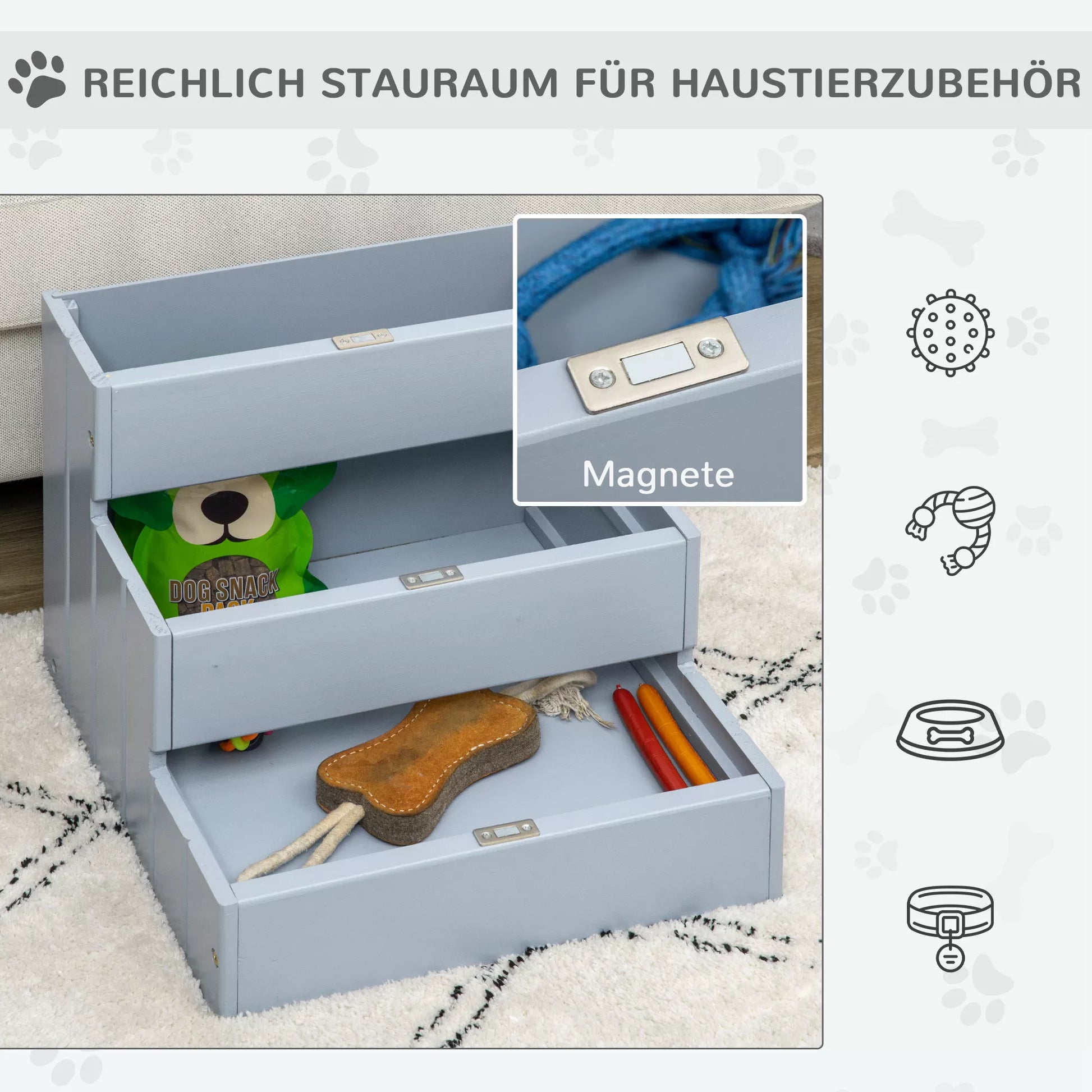 - ✔ Su daiktų laikymo vieta reikmenims jūsų augintiniui