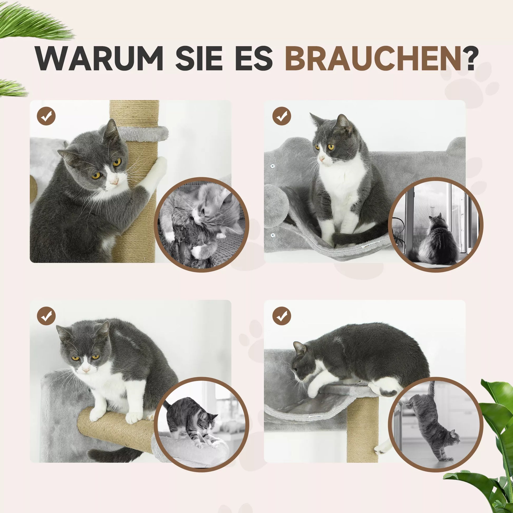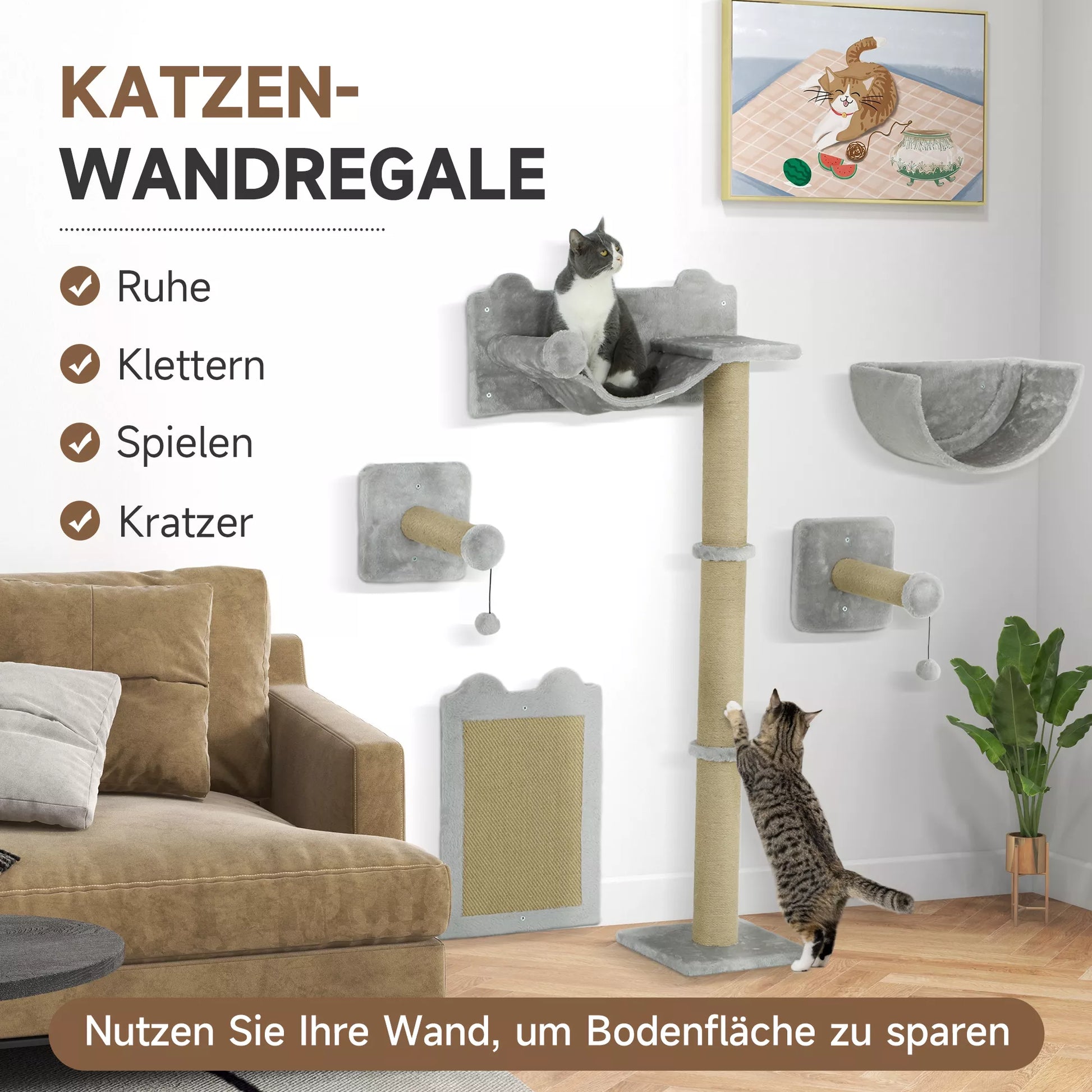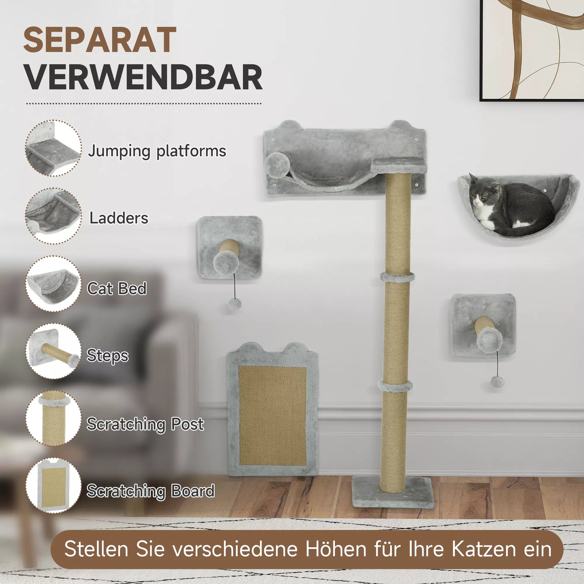 5 dalių sieninis laipiojimo komplektas naminiams kačiams su draskykle, draskymo kilimėliu, kačių lova, žaisliniais kamuoliukais, šviesiai pilkos spalvos