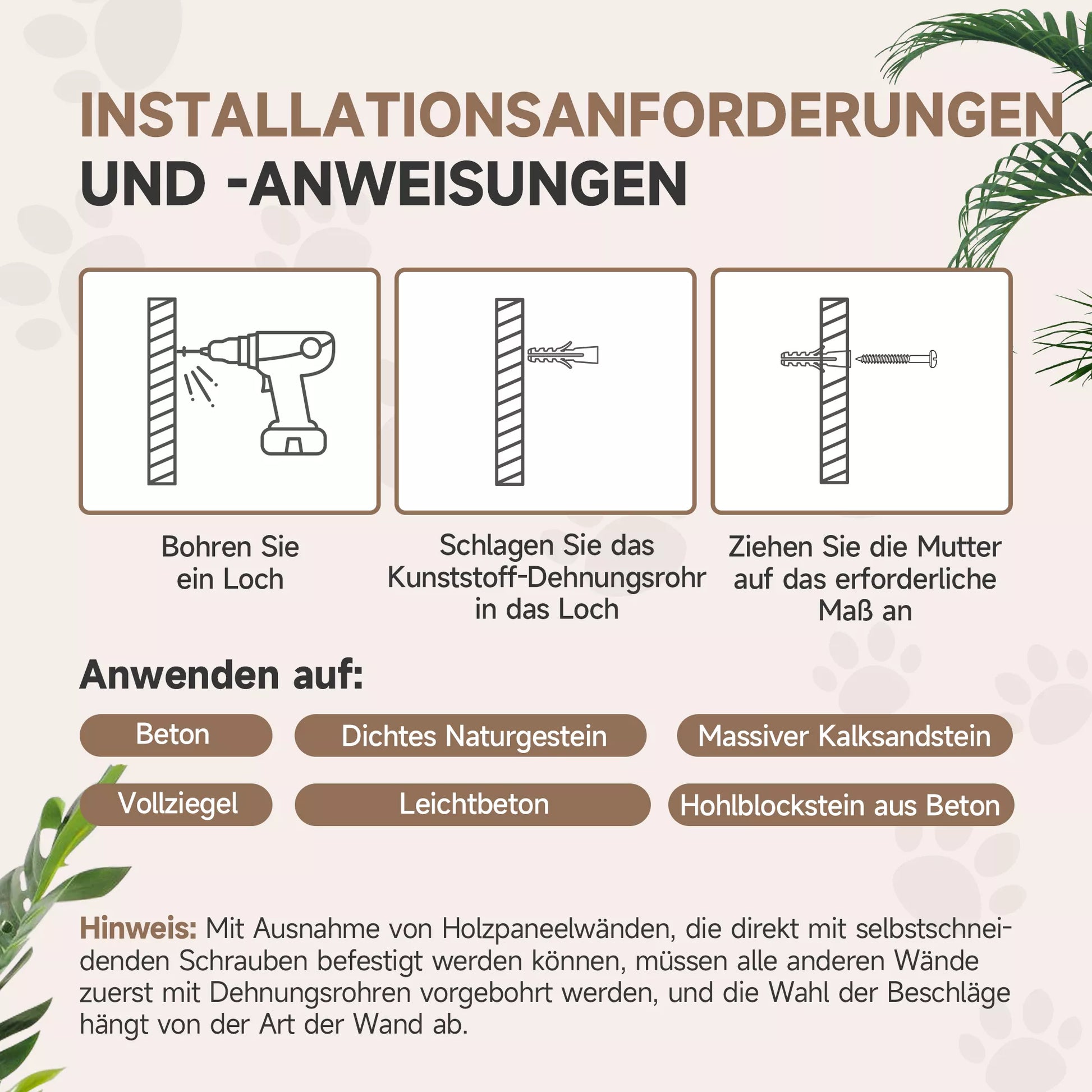 Paverskite savo namus kačių rojus su Kačių laipiojimo sienelės komplektu! Šis 5 dalių sieninės draskyklės komplektas katėms apima du draskymo stulpelius ir jaukų pusapvalį guolį, puikiai tinkantį žaidimams ir poilsiui. Idealiai vietą taupanti sieninė draskyklė katėms, suteikianti jūsų katėms norimą privatumą ir apsauganti jūsų baldus nuo subraižymo. Tinka namų ūkiams, kuriuose gyvena viena arba dvi katės.