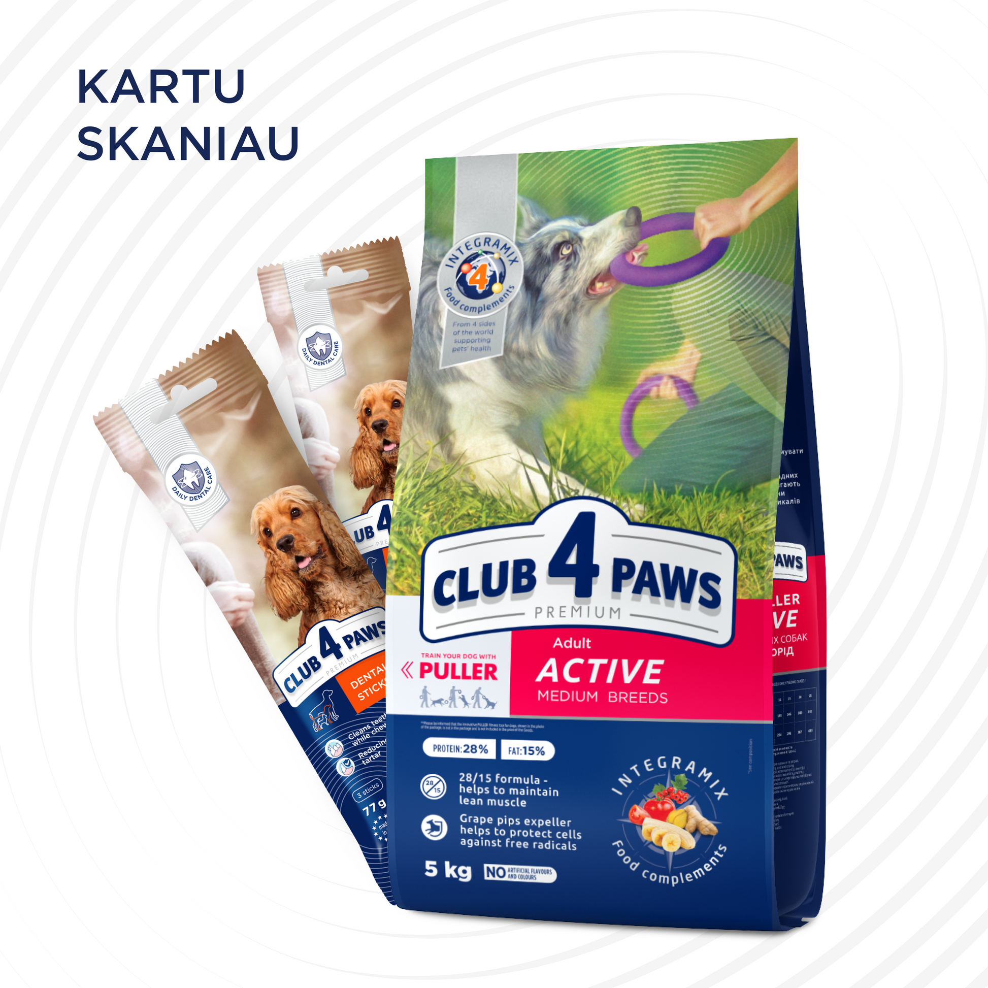CLUB 4 PAWS PREMIUM „AKTYVAS“. VISAVERTIS PAŠARAS SUAUGUSIEMS AKTYVIEMS VIDUTINIŲ VEISLIŲ ŠUNIMS.