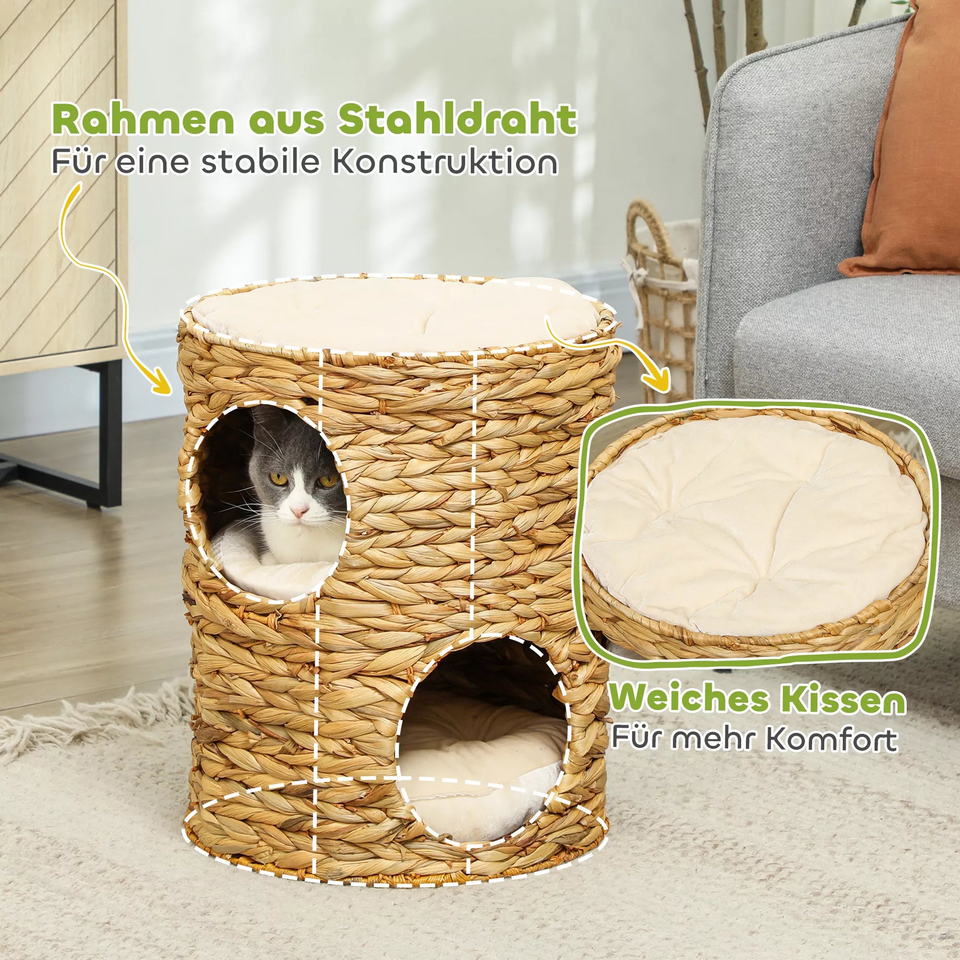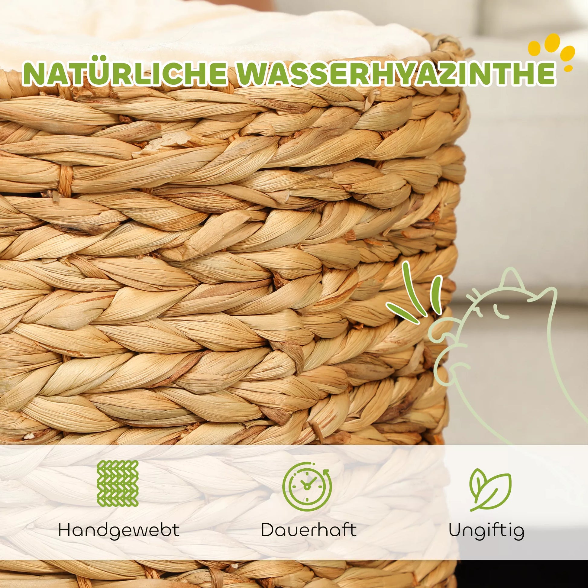 Draskyklė statinės formos, 50 cm, 2 urvai, pagalvėlė, draskyklė su katės guoliu, katės bokštas iš vandens hiacinto, šviesiai ruda