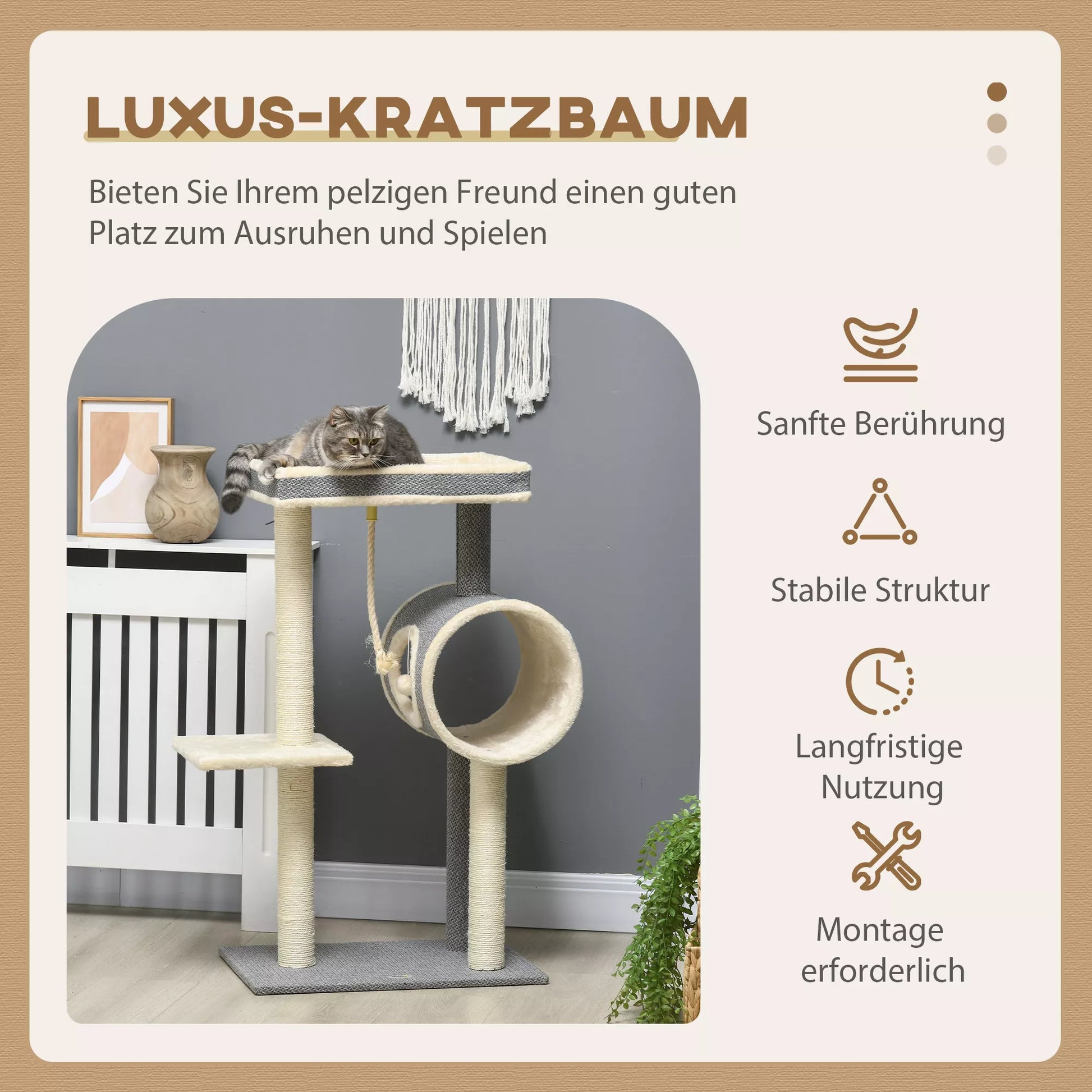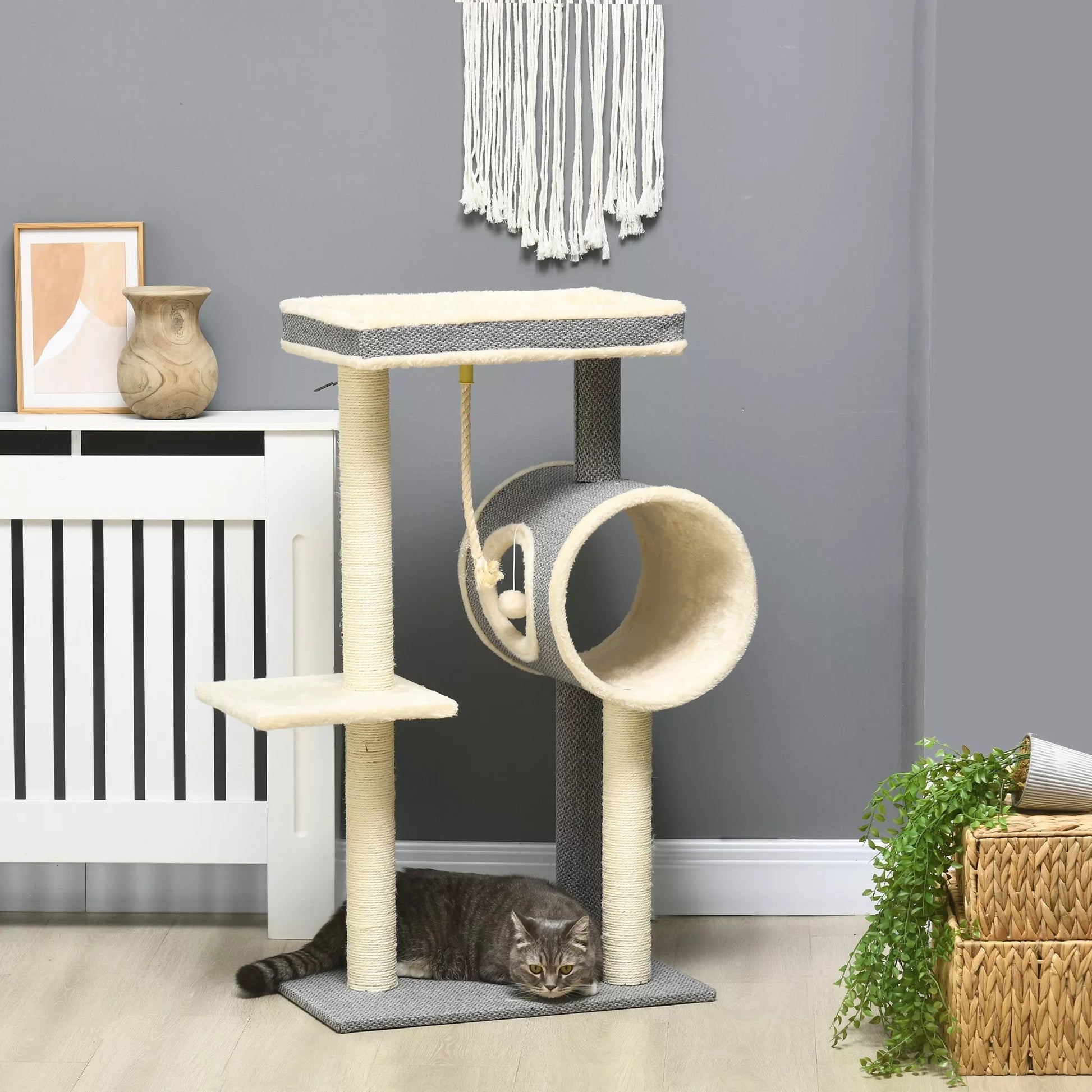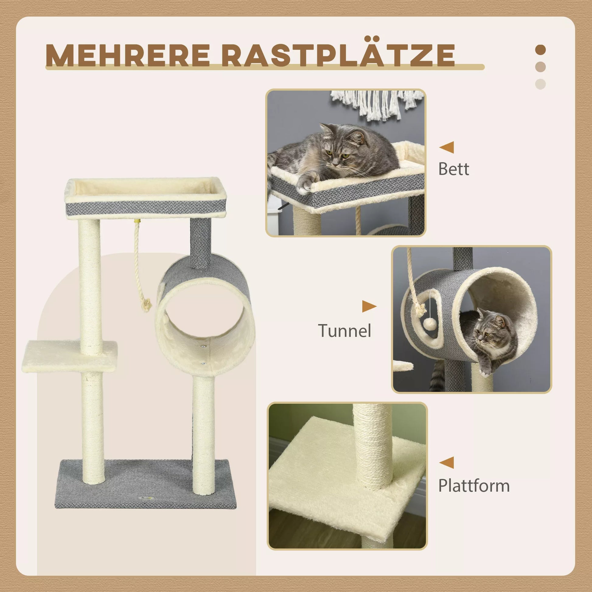 Kačių draskyklė, 1 katės urvelis, 2 gulimosios vietos, 60 cm x 40 cm x 104 cm, Pilka + Natūrali