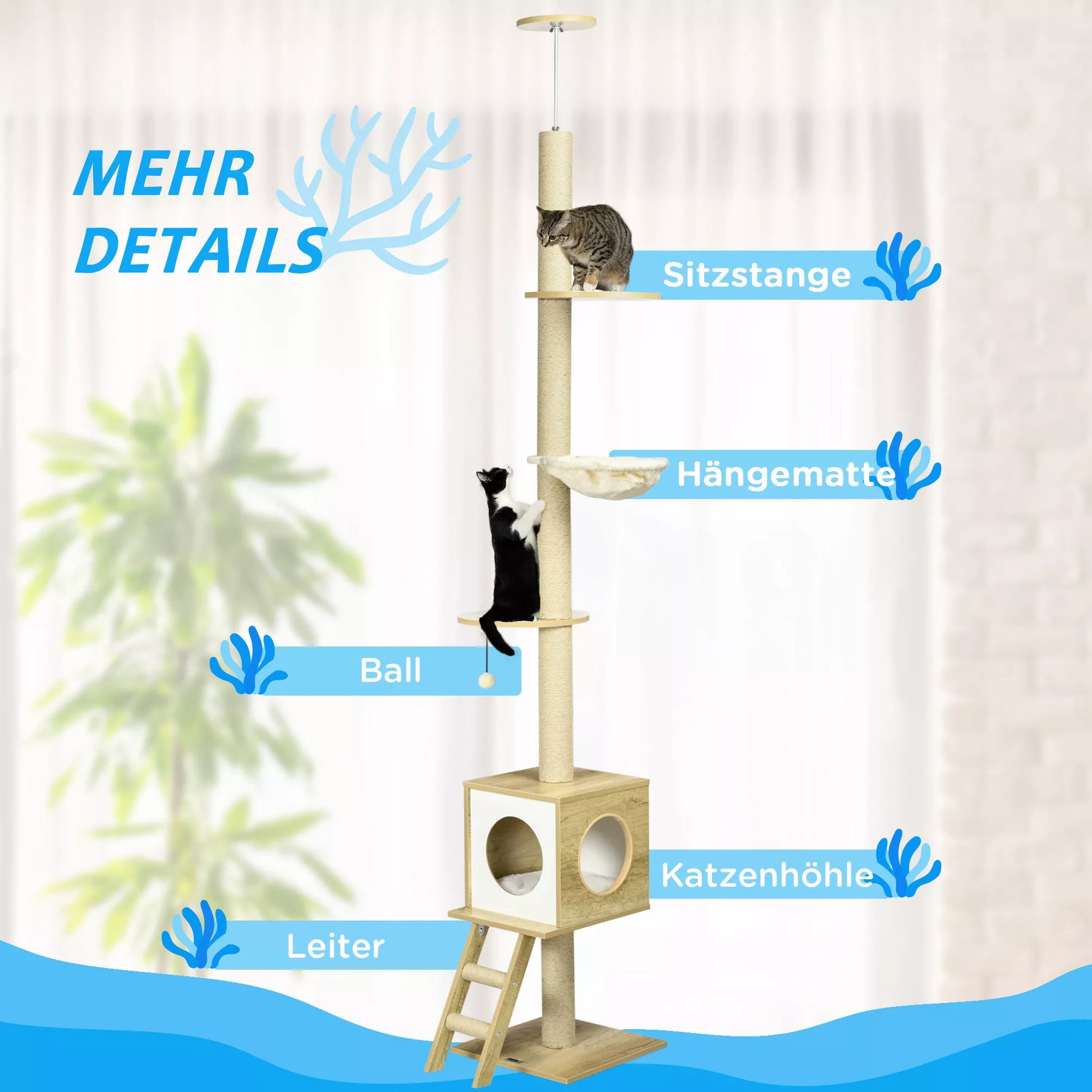 Šis iki lubų siekiantis namelis su draskykle yra ideali žaidimų ir poilsio vieta jūsų augintiniui. Kelios platformos leidžia katėms smagiai laipioti ir siūlo įvairias poilsio vietas jaukiam atsipalaidavimui. Namelis su draskykle pagamintas iš ilgaamžės medžio drožlių plokštės ir turi apsaugą nuo apsivertimo, todėl jūsų augintiniai gali draskyti ir žaisti nesijaudindami. Atsiradus nuoboduliui, kabantis žaidimų kamuoliukas suteiks pramogų.