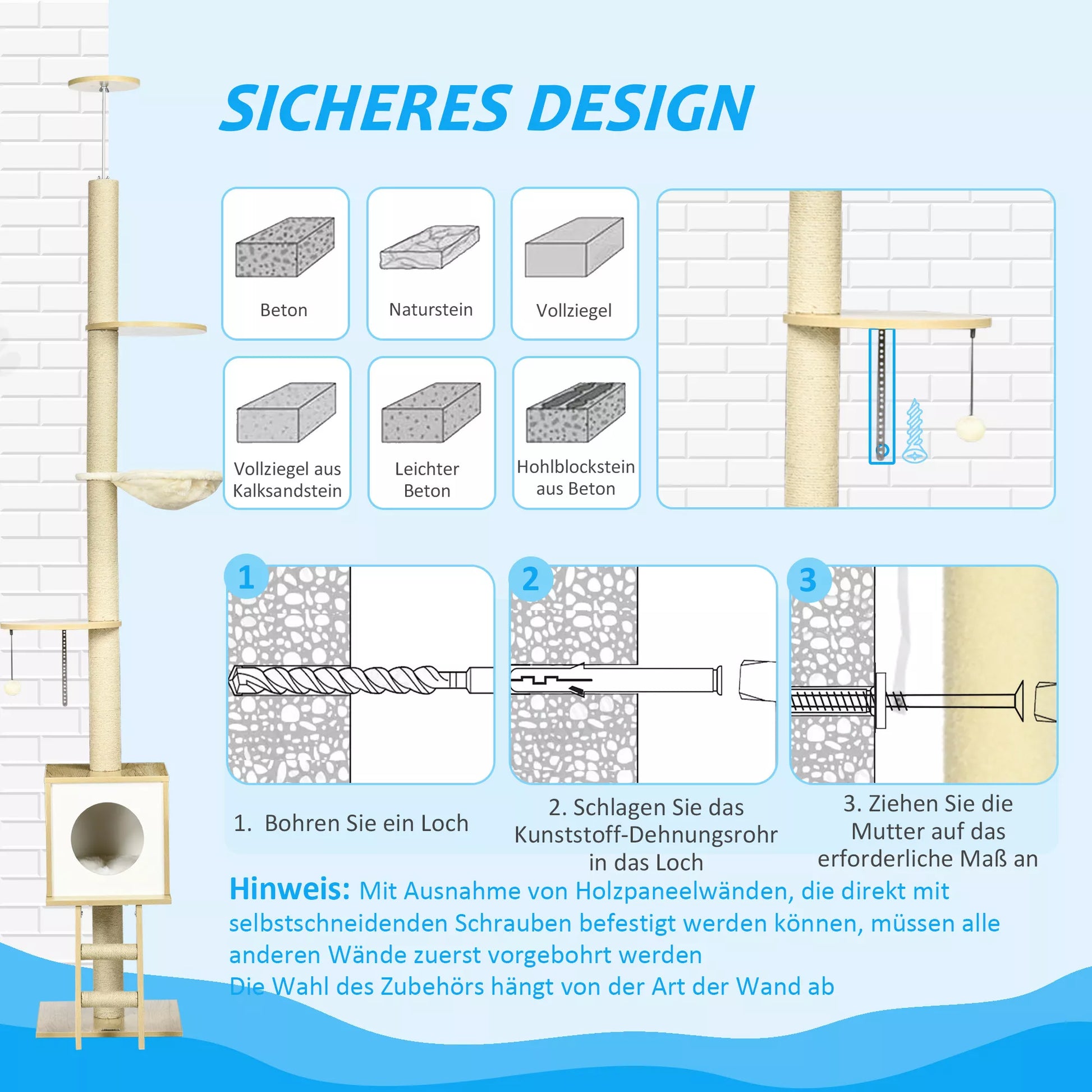 Kačių draskyklė iki lubų, su kačių nameliu, dviem platformomis, hamaku, apsauga nuo apvirtimo, šviesiai rudos ir smėlio spalvos, 40 x 40 x 260 cm