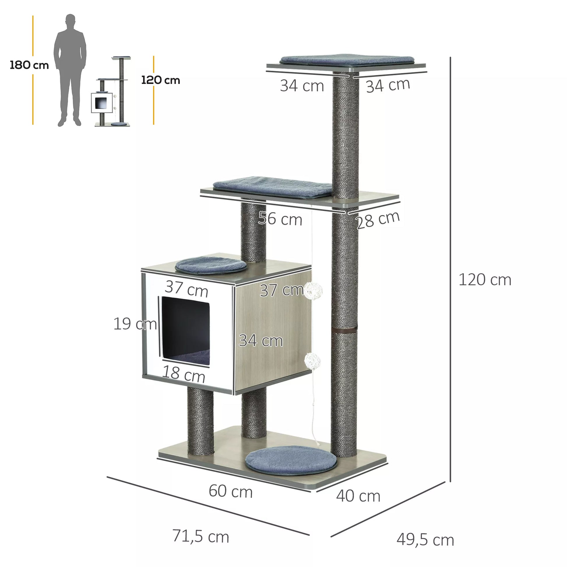 Kačių draskyklė, kačių medis, kačių žaislas, laipynė katėms, sizalis, paminkštinimas, poilsio zona su kamuoliuku, pilka, 71,5 x 49,5 x 120 cm