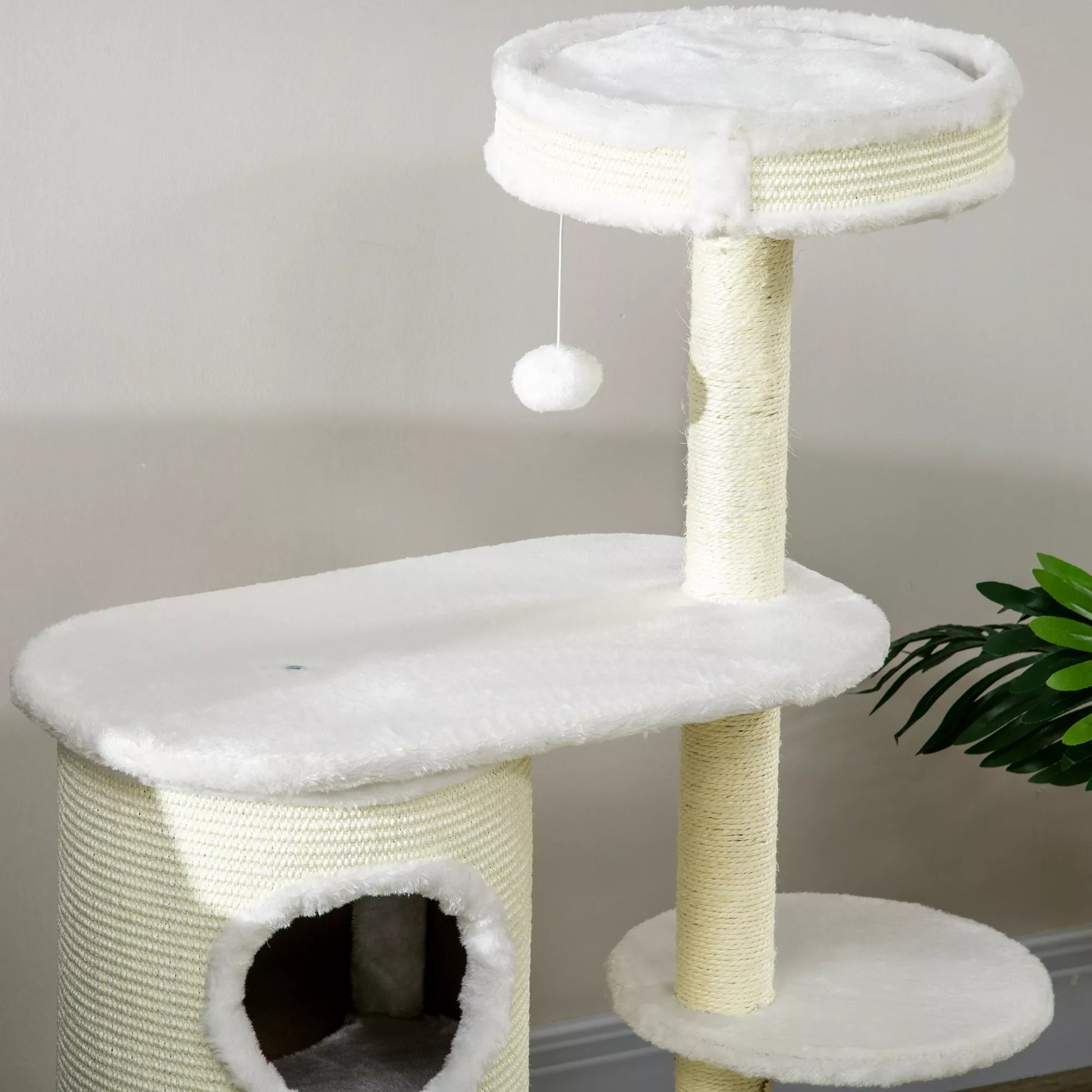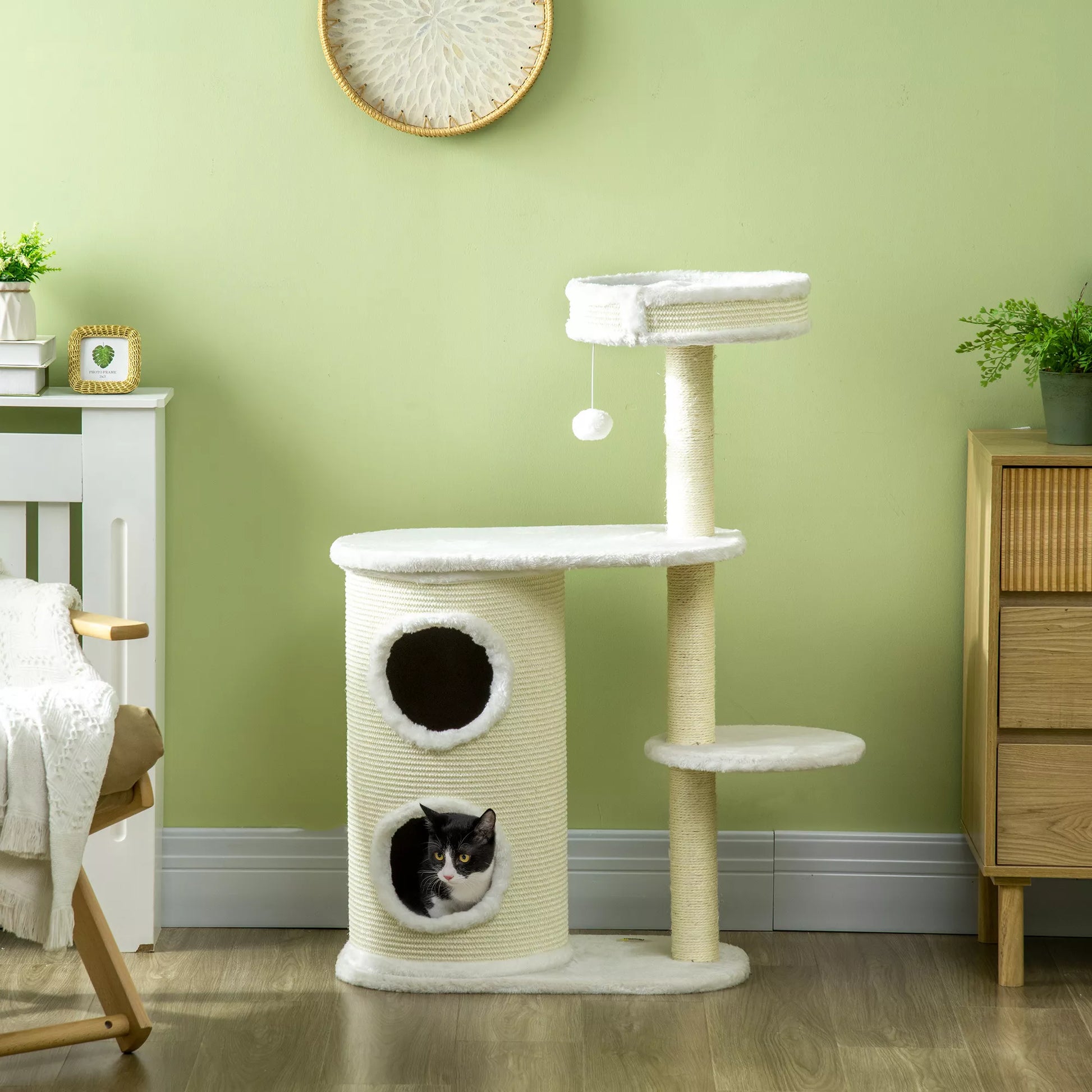 Kačių draskyklė su draskymo statine, 1 katės guoliu ir kačių žaislais, 59 cm x 35 cm x 100 cm, kreminės baltos spalvos