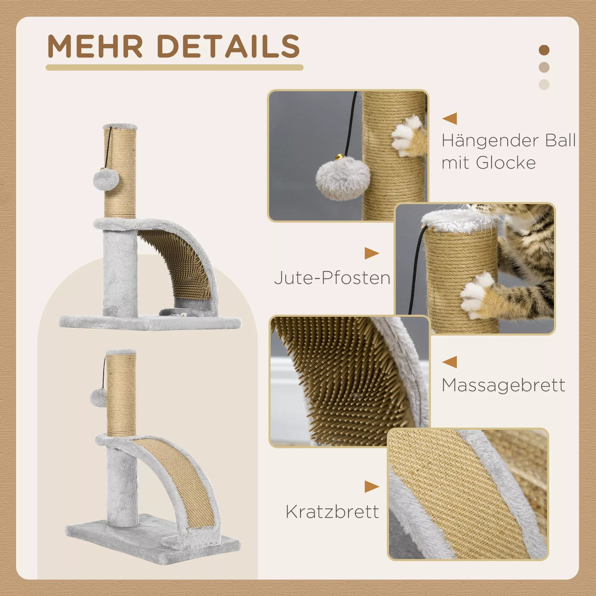 - ✔ Pakabinamas kamuoliukas su skambalu katės draskyklės medyje linksmybėms ir draskymo lenta masažui