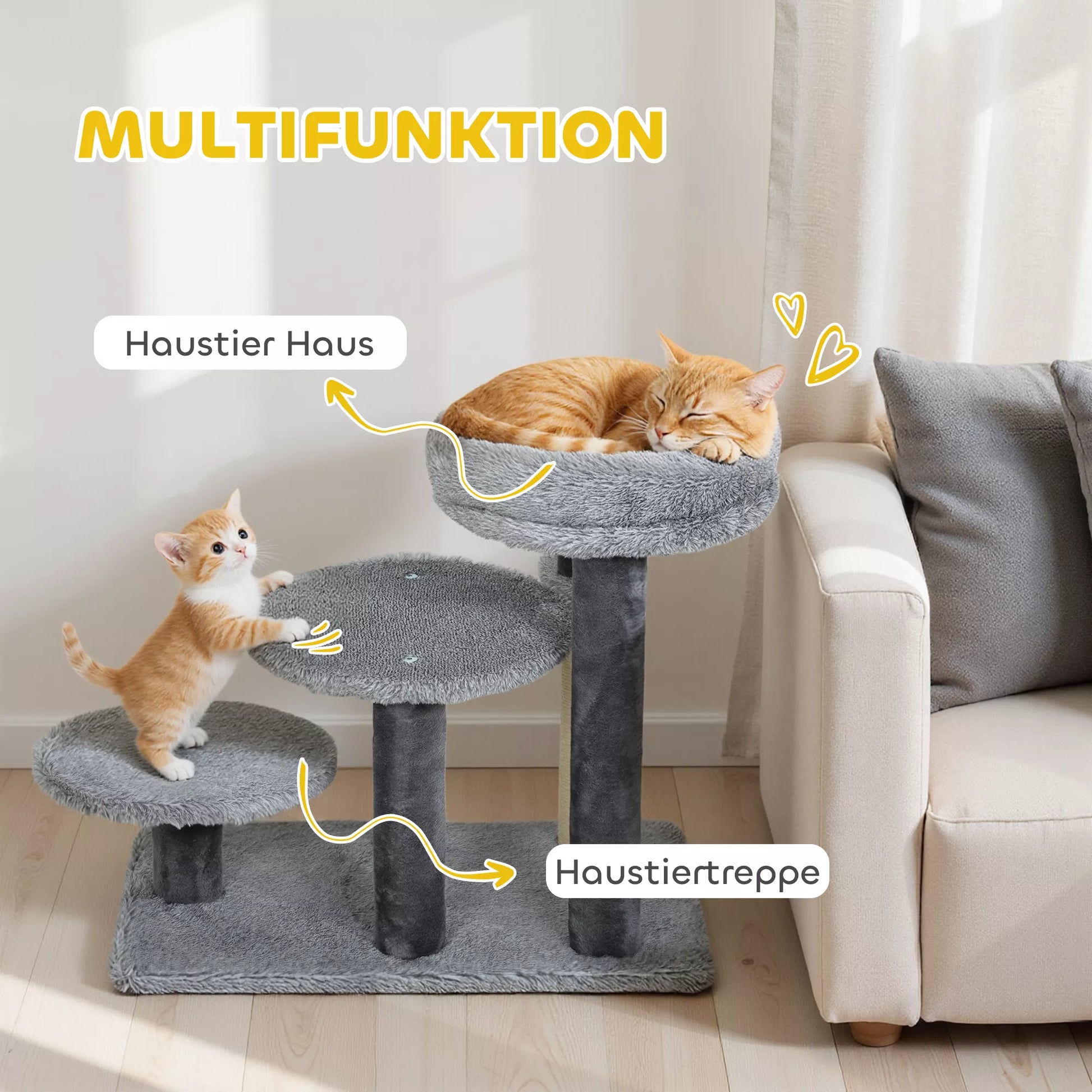 - ✔ Trys laiptelių pakopos skatina aktyvių kačių judėjimą ir laipiojimą