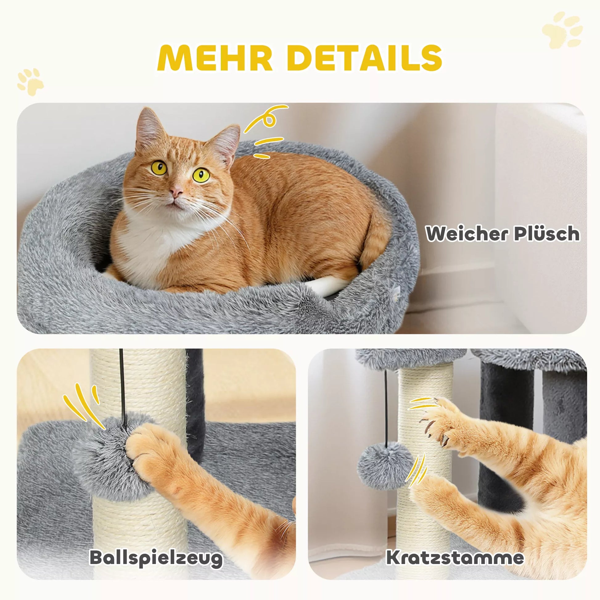 Kačių medis ir laipteliai, plati bazė, pliušinis audinys, sisalio draskyklė, pilkos spalvos