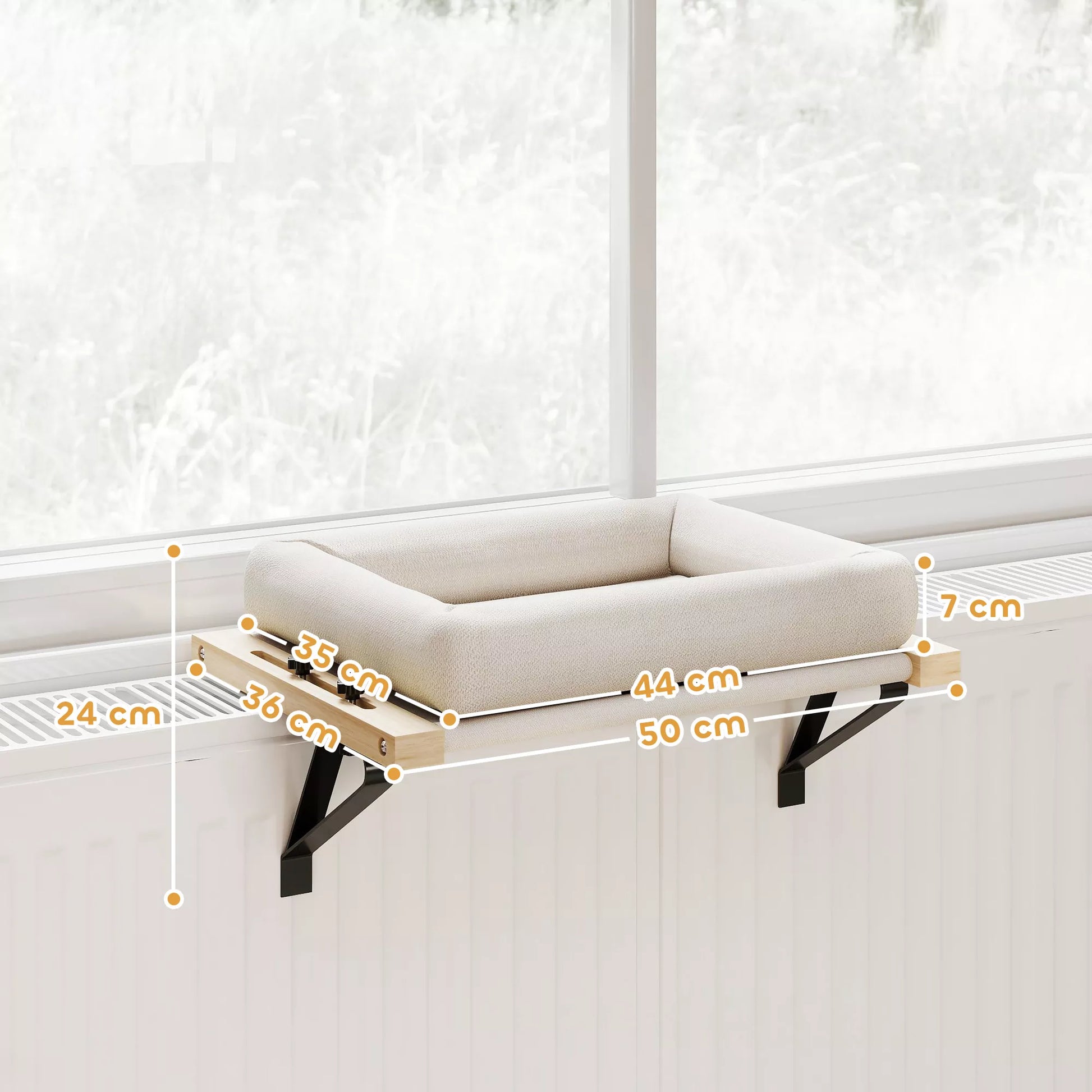 Kačių namelis su tvirtinimu ant palangių ir radiatorių, su pagalvėle, mediniu rėmu, baltas