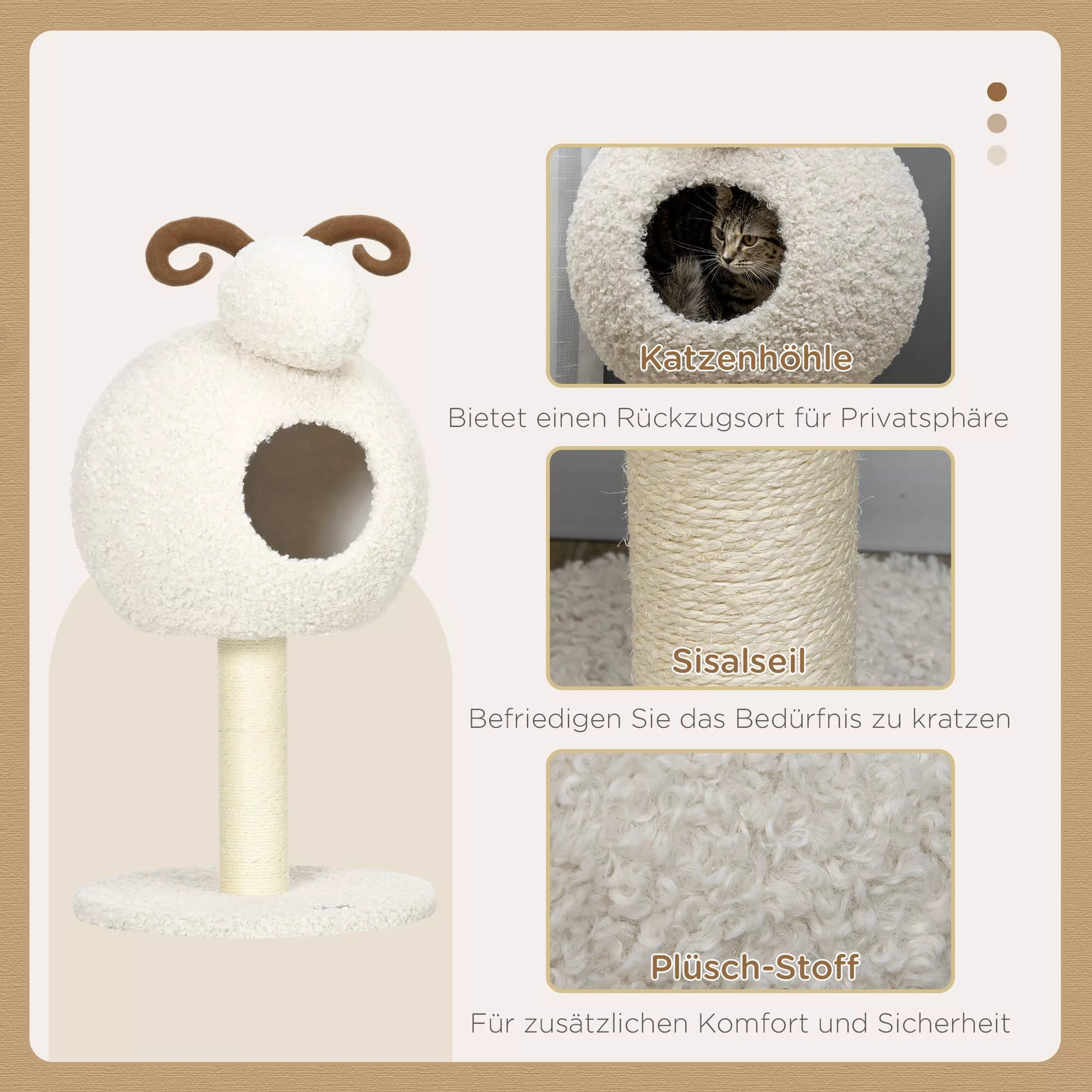 Katės draskyklė, avies dizainas, su katės urveliu ir draskomuoju stulpu, skalbiama pagalvėlė, kreminė balta + ruda