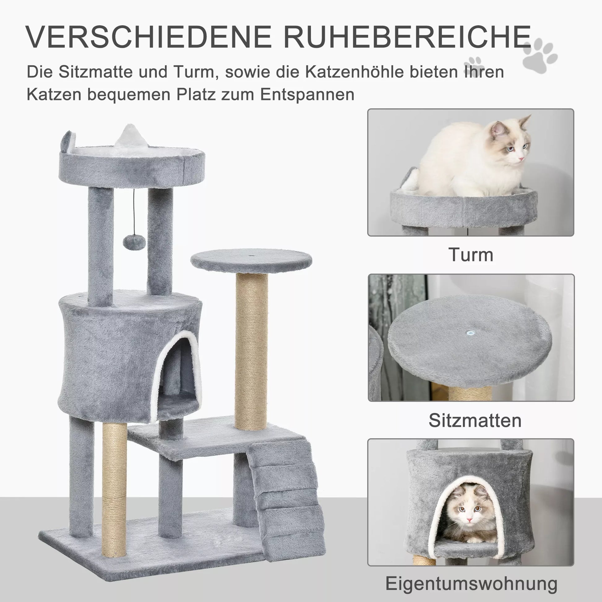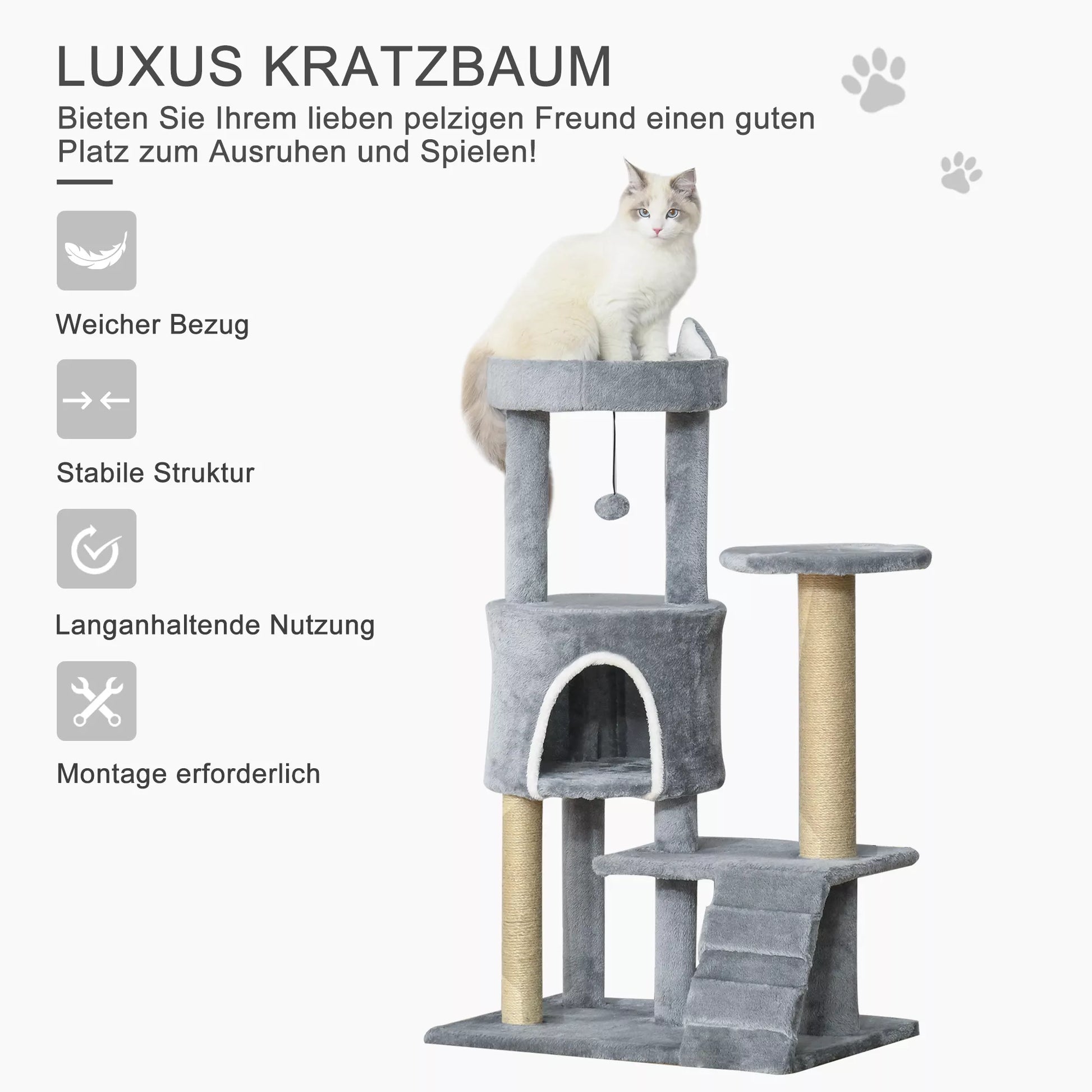 Šis draskomasis namelis yra miego vieta, žaidimų aikštelė ir draskomasis namelis viename. Ant keturių lygių jūsų katė gali laipioti, linksmintis ir žaisti. Minkštas pliušinis viršutinis sluoksnis kviečia jaukiai įsikurti ir miegoti. Sisalo virvės stulpeliai suteikia jūsų katei puikią galimybę galandėti nagus. Integruotas žaislas suteikia daug įspūdžių ir džiaugsmo. Su šiuo draskomuoju nameliu jūsų katė turės viską, kad jaustųsi visiškai patogiai.