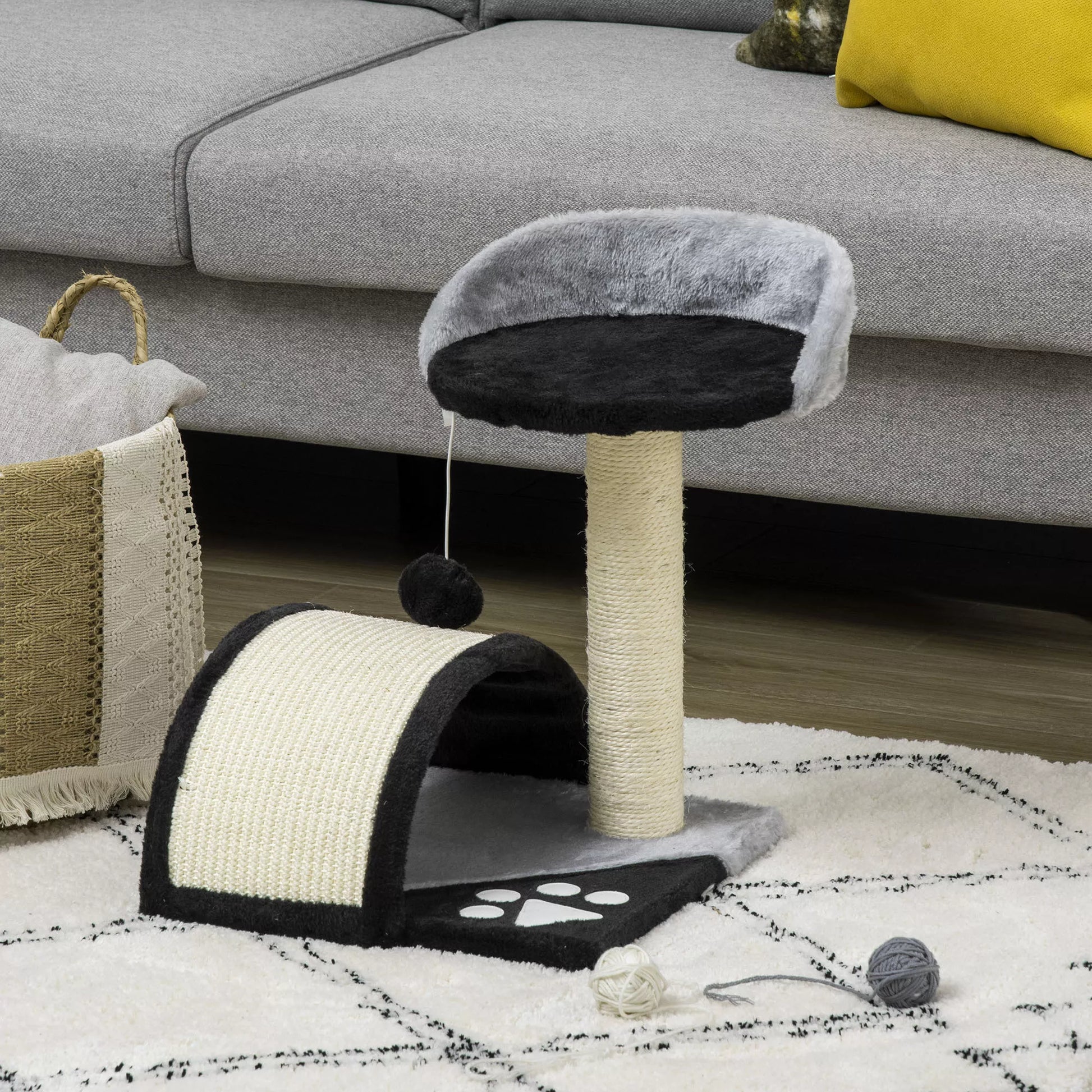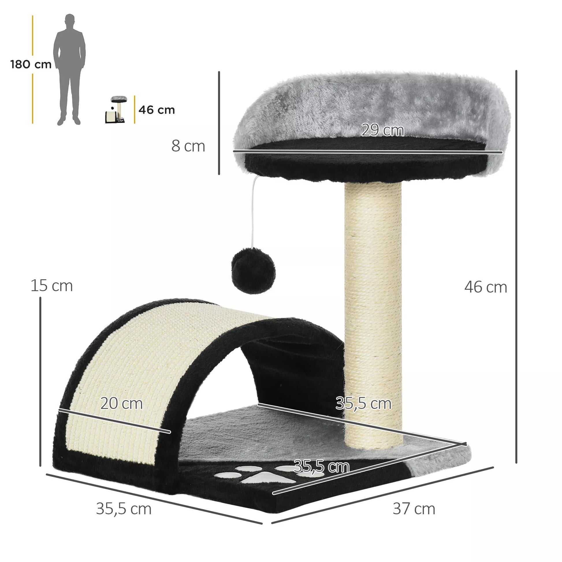 Katės draskyklė su žaidimo kamuoliukais, su sizalinės virvės draskomosiomis atramomis, juoda spalva, 35,5 x 37 x 46 cm