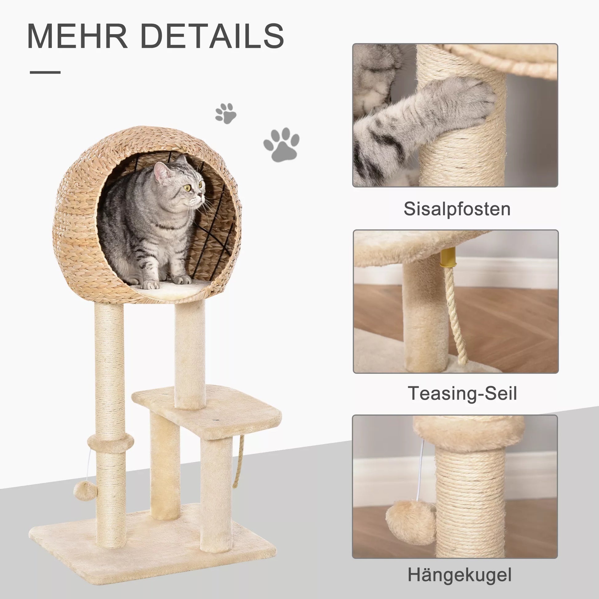 Katės namelis 100 cm, katės bokštelis su urveliu, žaidimo kamuoliuku, sizaliniais stiebais, platforma, daugiaaukštis katės draskymo medis, laipiojimo medis, vidutinio dydžio katėms, smėlio spalvos