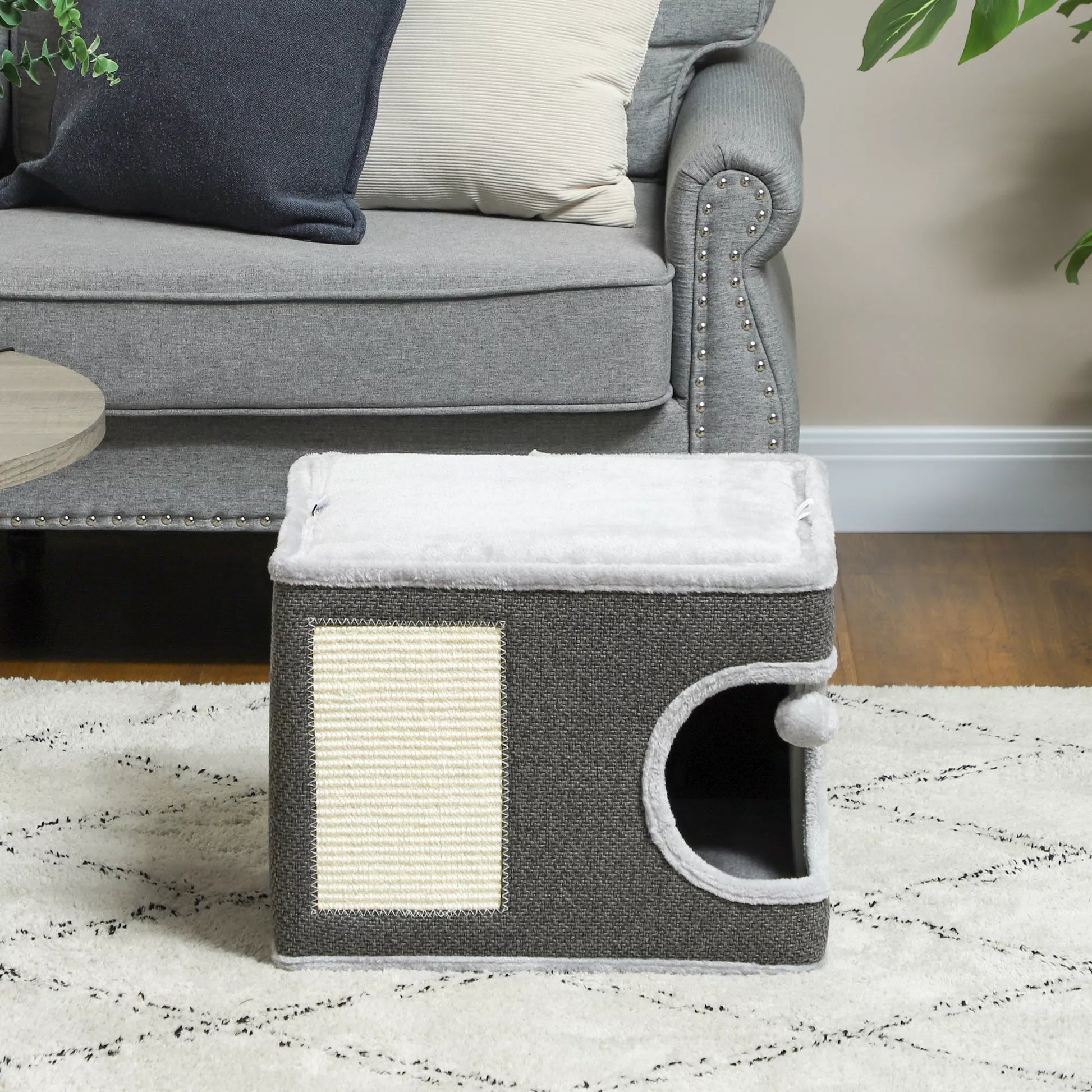 Katės namelis su 2 pagalvėlėmis, lova, guoliu, draskymo kilimėliu, žaisliniu kamuoliuku, mažu draskomuoju medžiu, pilkos spalvos