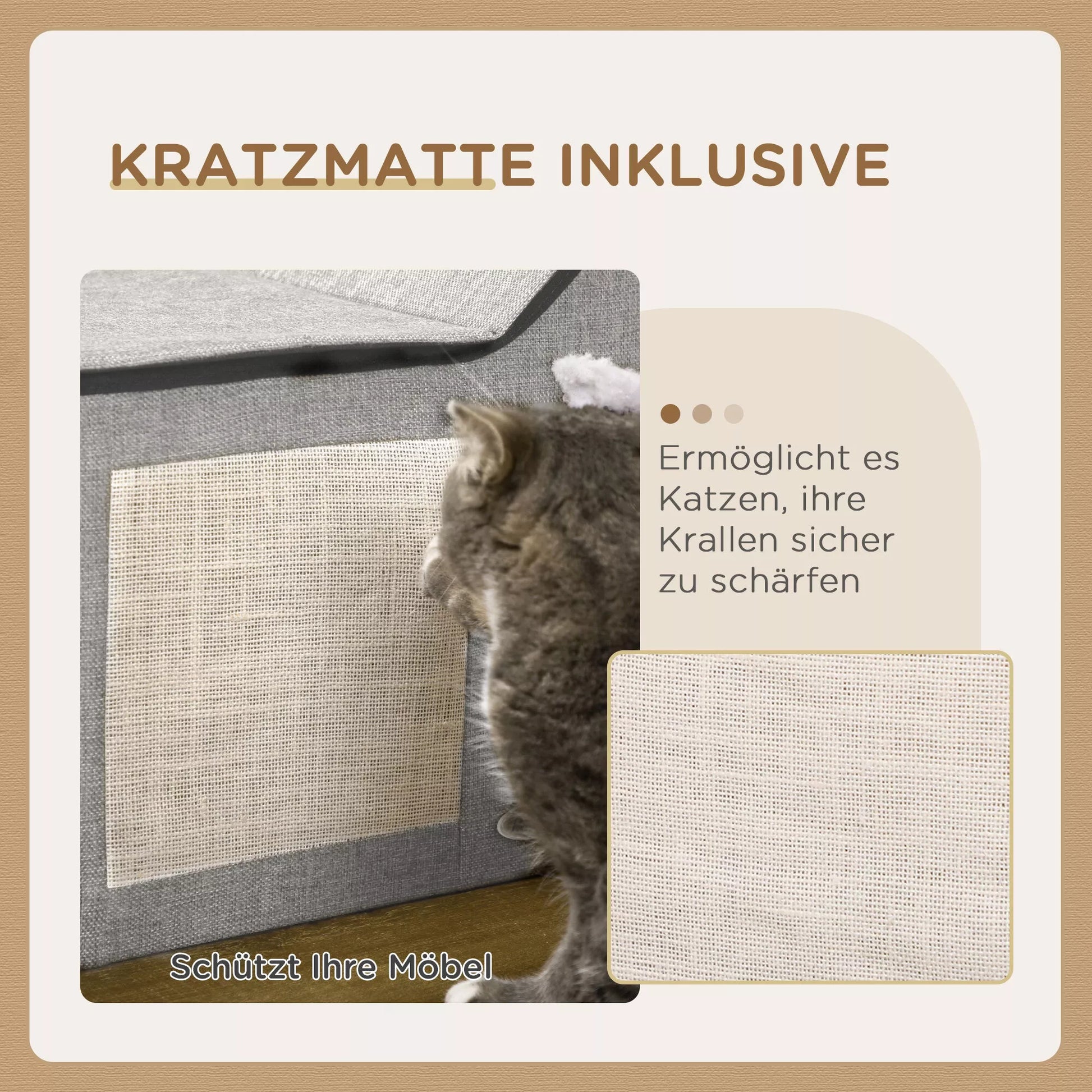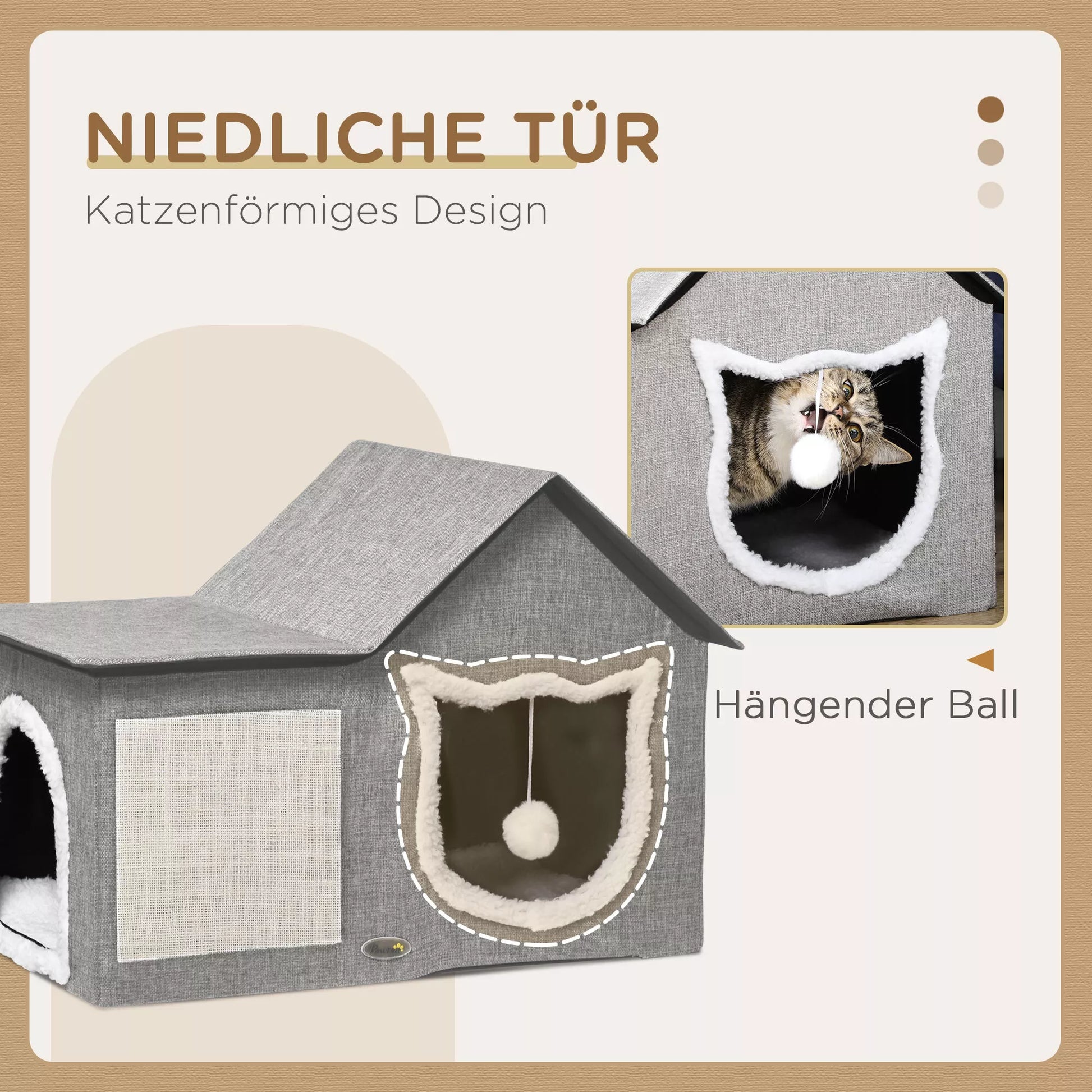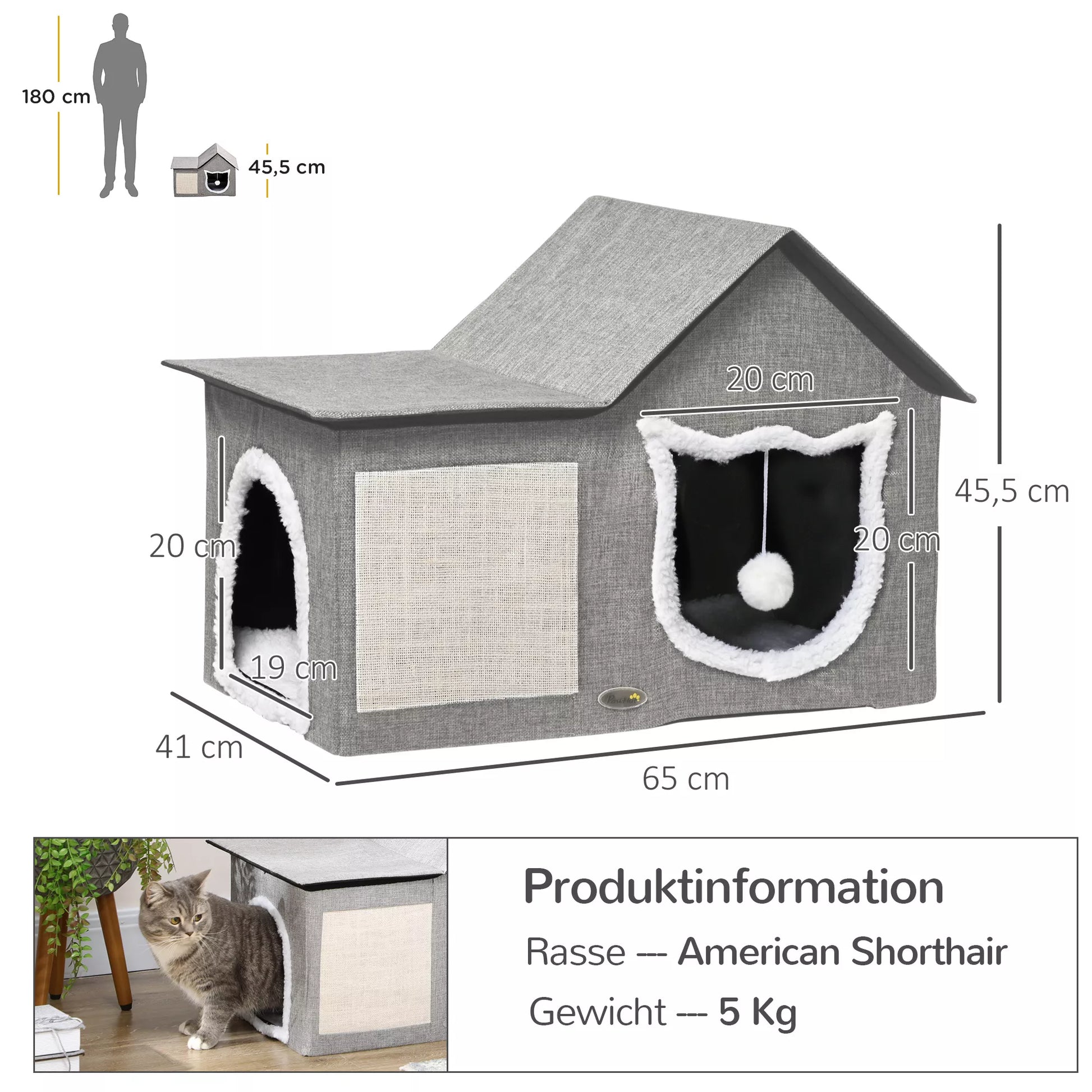 Katės namelis su draskykle, su žaisliniu kamuoliu, katės urvas, 65 cm x 41 cm x 45,5 cm, Ruda + Balta + Bežinė