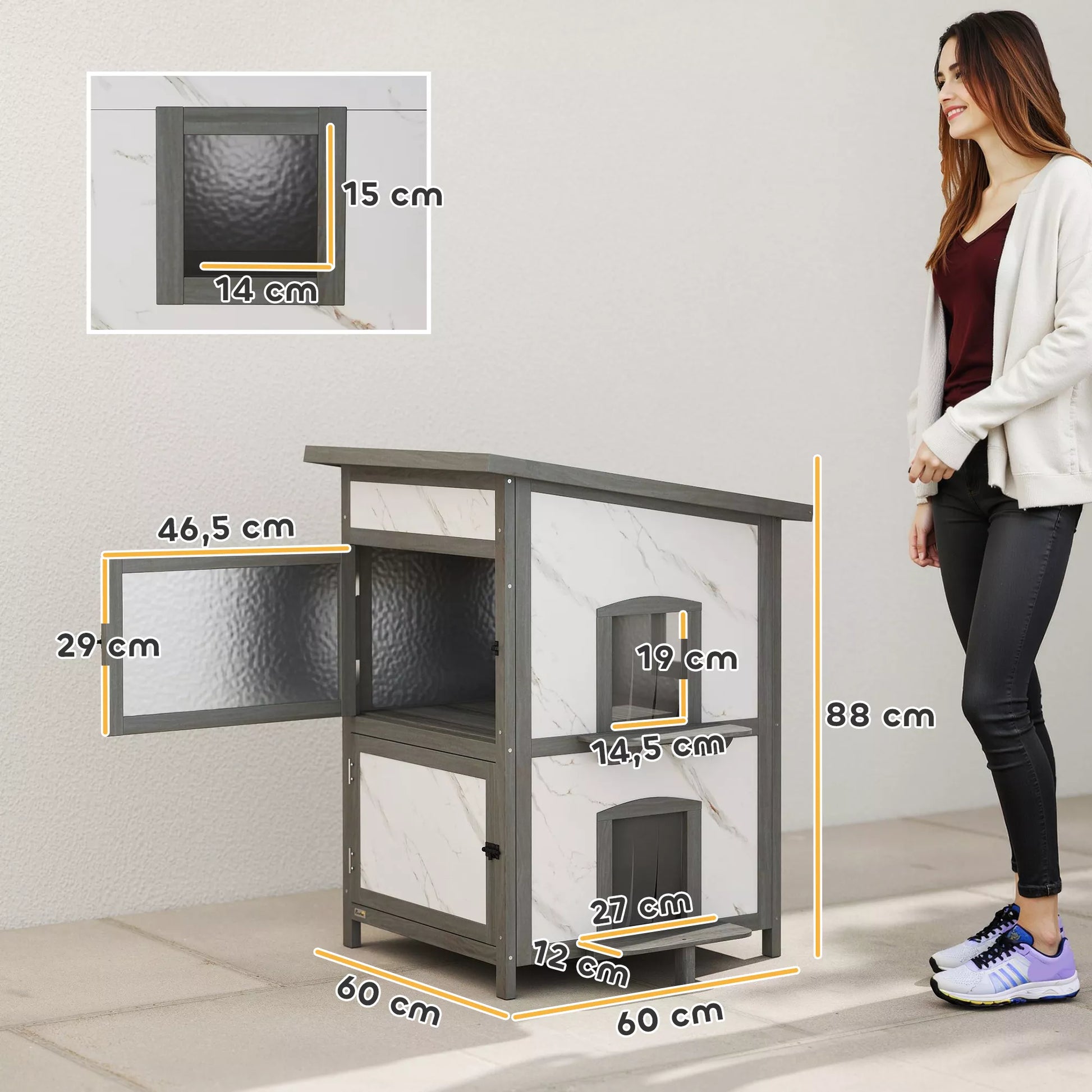 Lauko namelis katėms, medinis namelis katėms, keli įėjimai, langai, atsparus vandeniui, 60 x 60 x 88 cm, baltas