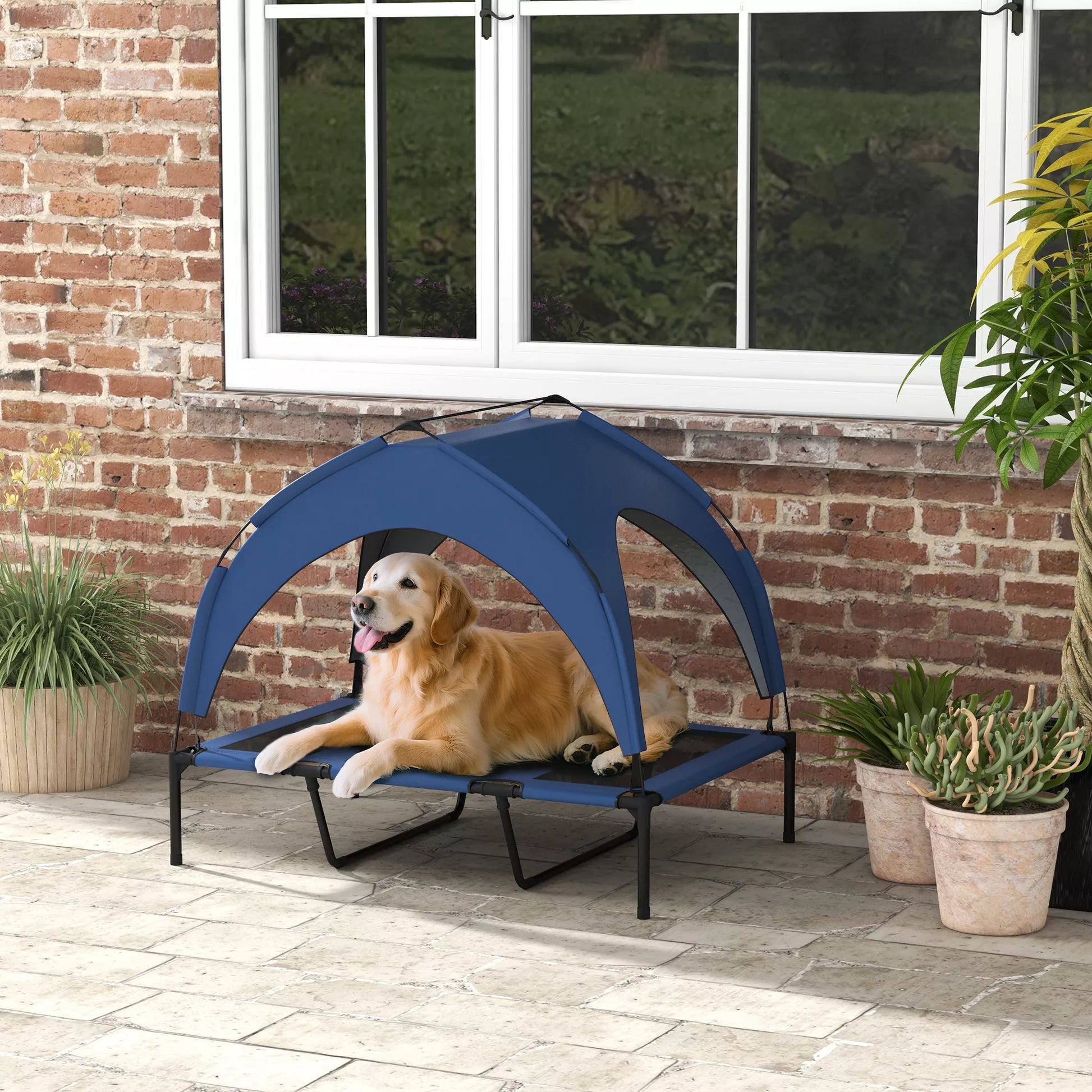 Lauko šunų guolis, atsparus oro sąlygoms, paaukštintas rėmas, 106 x 76 x 94 cm, tamsiai mėlynas