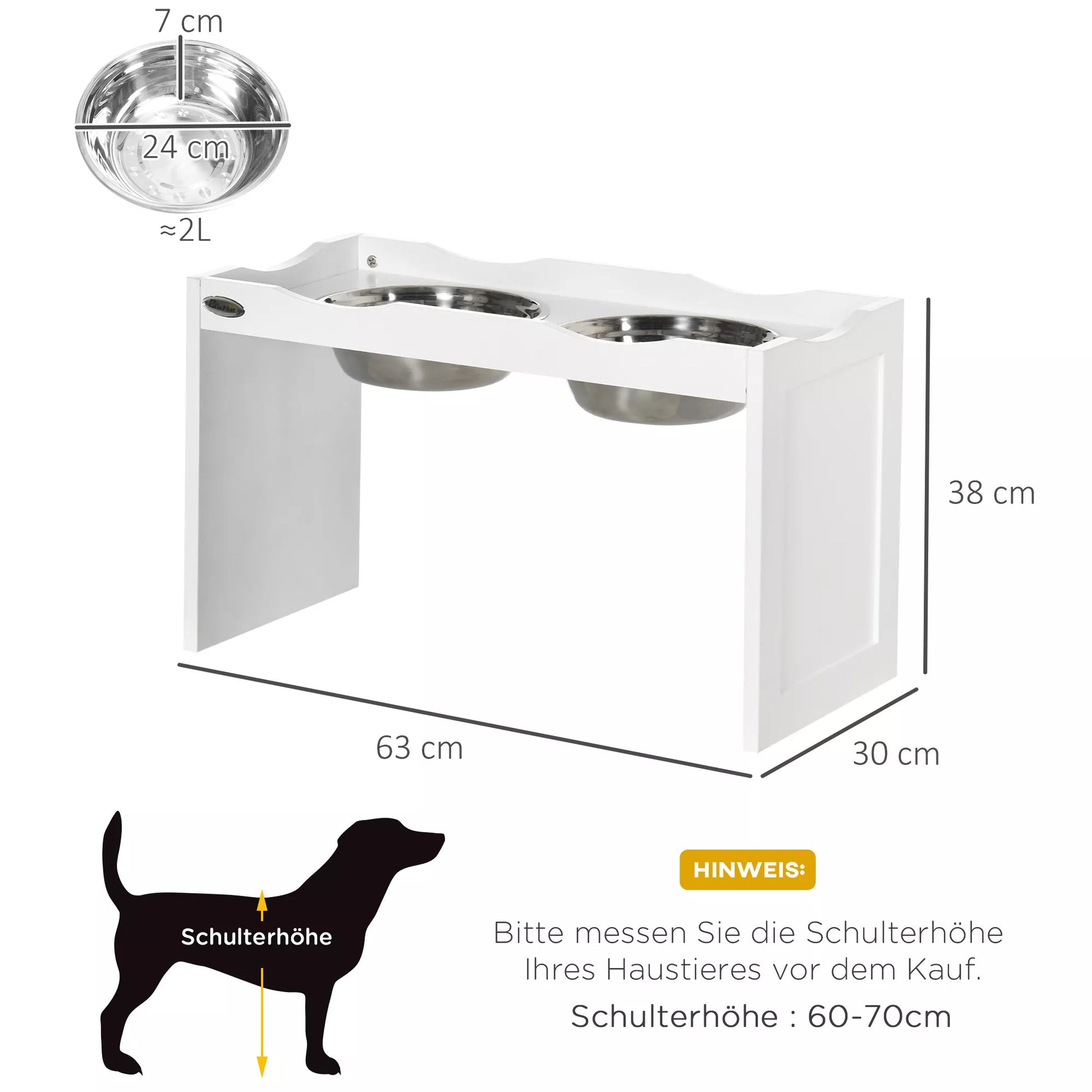 Maitinimo stotelė, stovas dubenėliams, 2 maitinimo dubenėliai po 2 litrus, nerūdijantis plienas, dideliems šunims, balta spalva, 63 x 30 x 24 cm