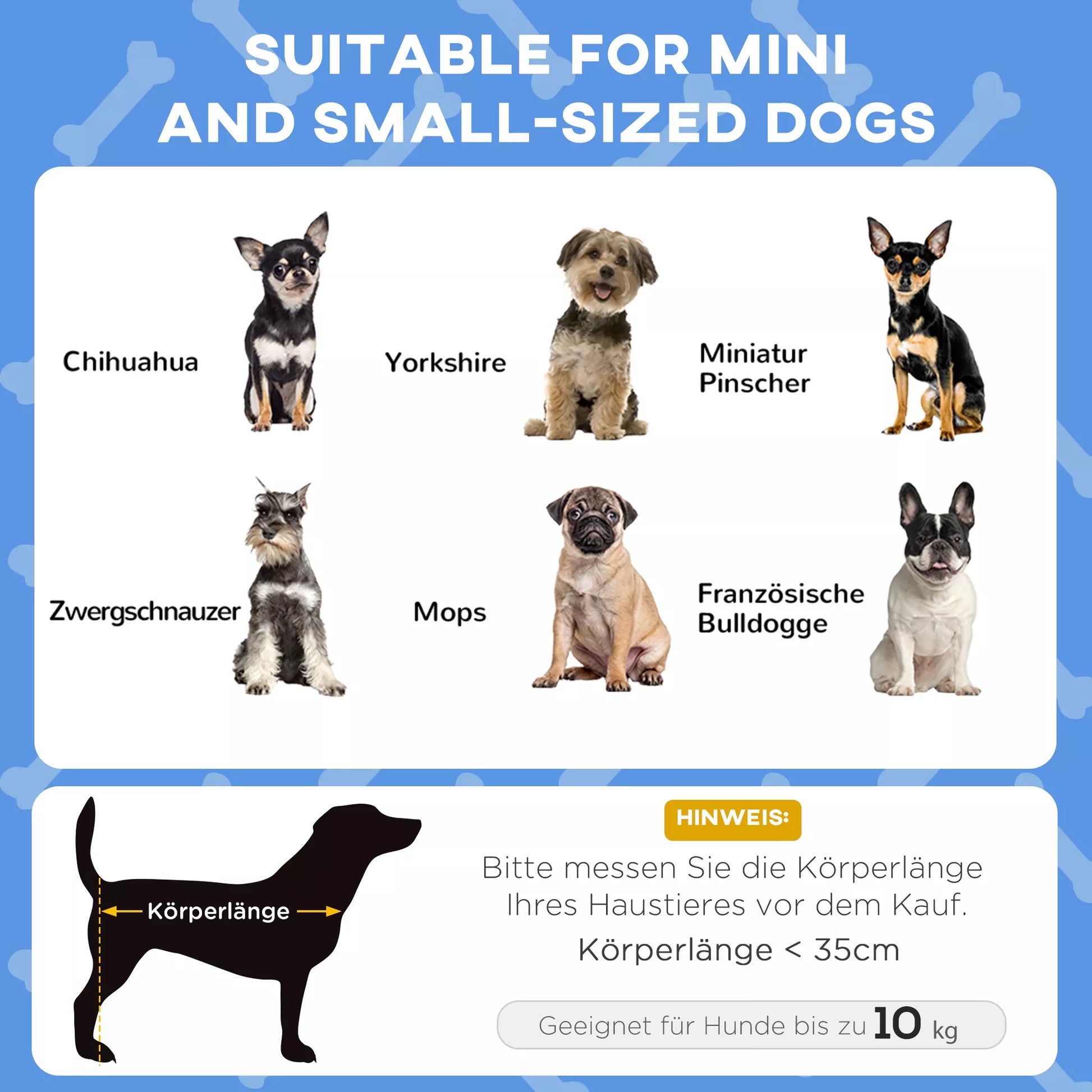 - ✔ Miniatiūriniams ir mažiems šunims, kurių ilgis mažesnis nei 35 cm, o svoris mažesnis nei 10 kg