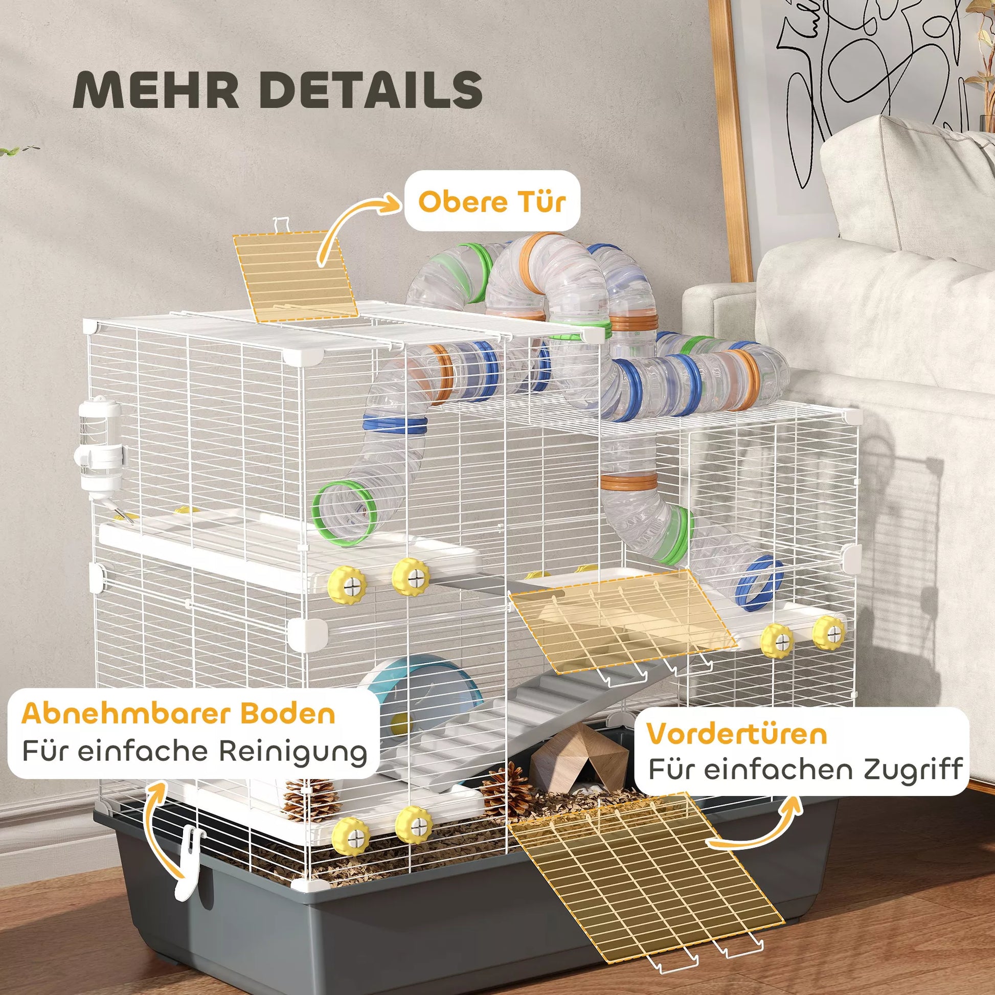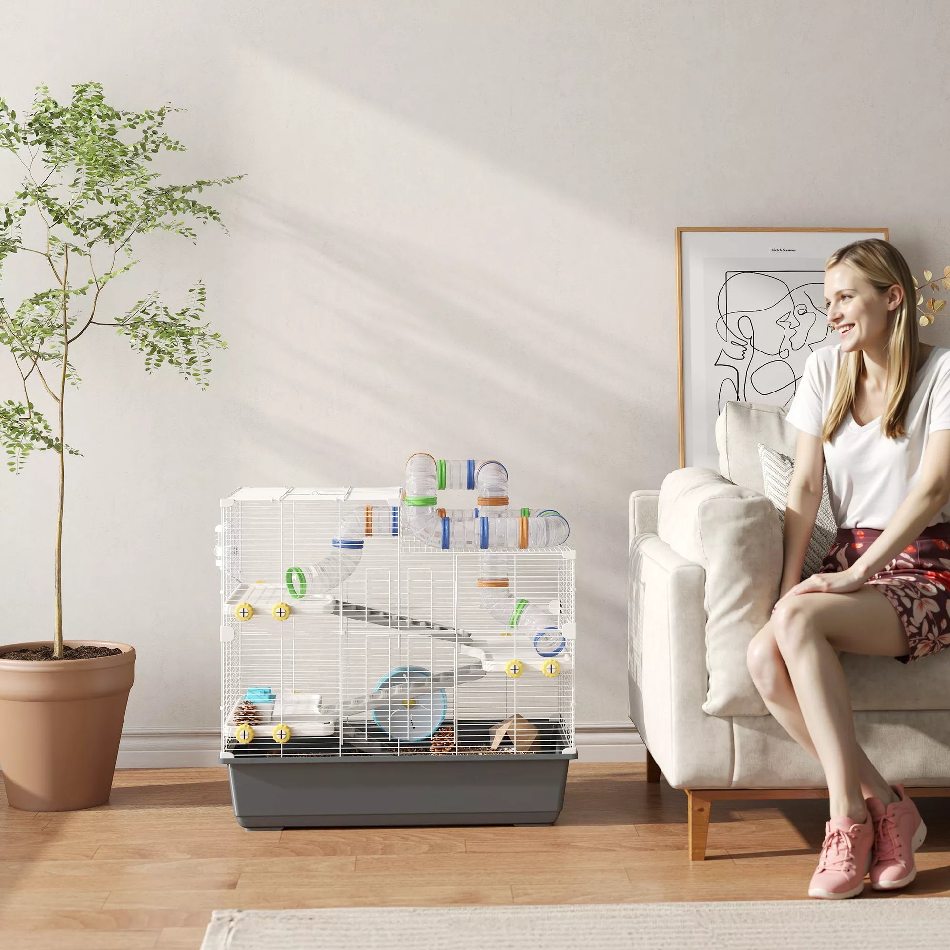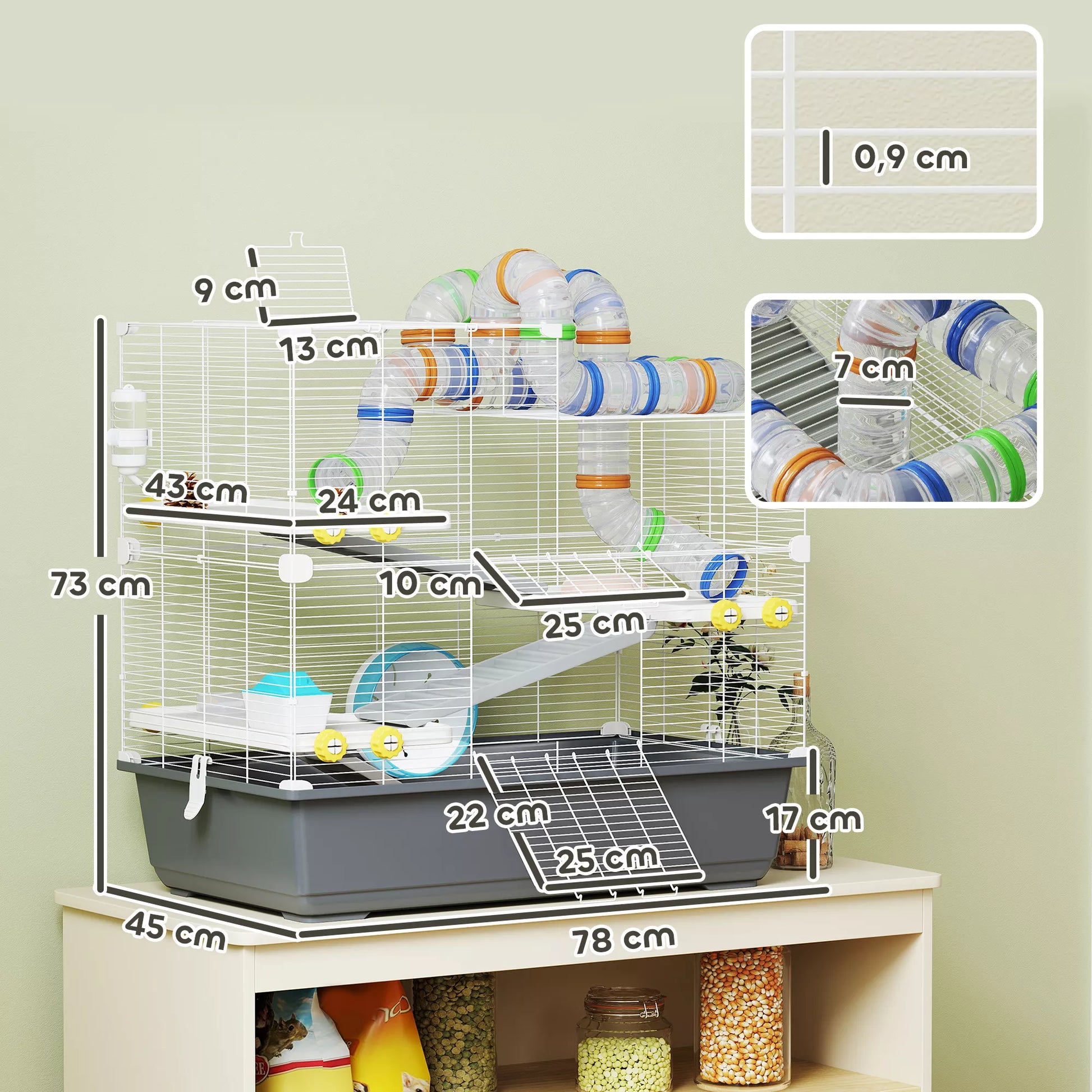 Nykštukinių žiurkėnų narvas, 4 lygiai, tunelių sistema, būdelė, aksesuarai, viršutinis atidarymas, 78 x 45 x 73 cm, Pilkas
