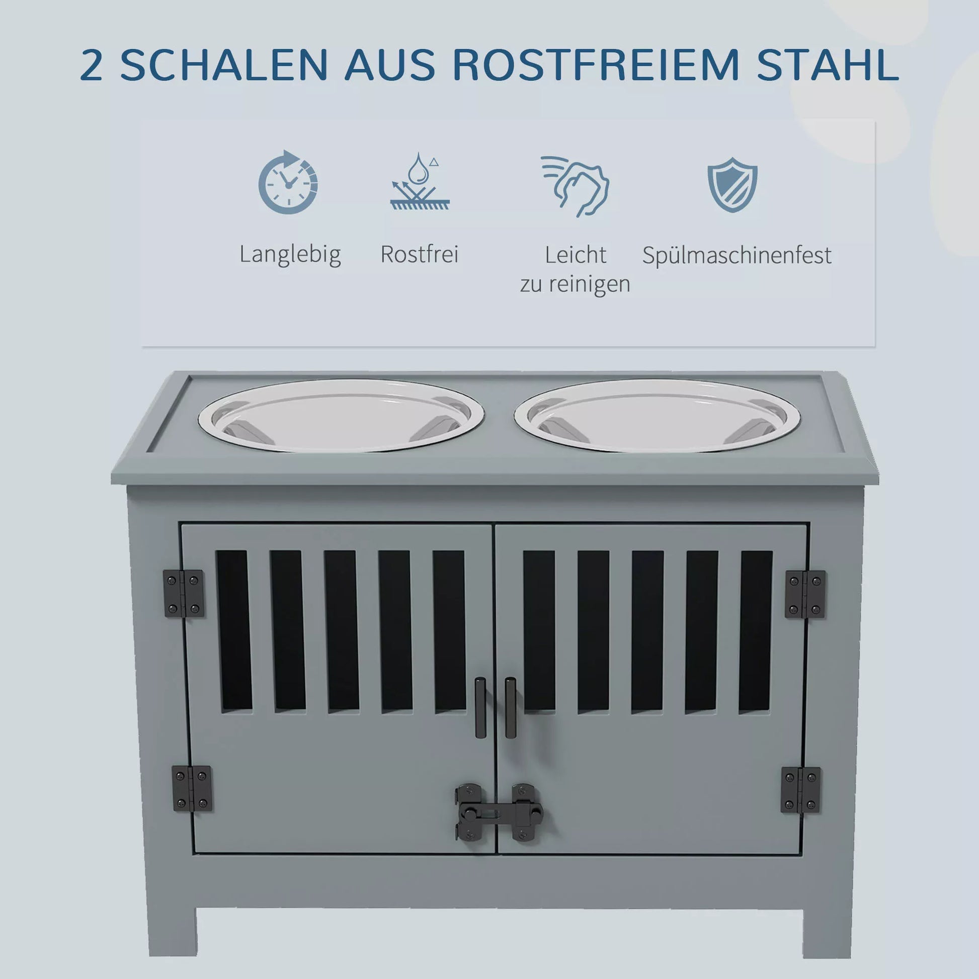 Paaukštinta lesykla dideliems šunims, 2 nerūdijančio plieno dubenėliai, laikymo skyrius, 35,5x60x30 cm, pilka