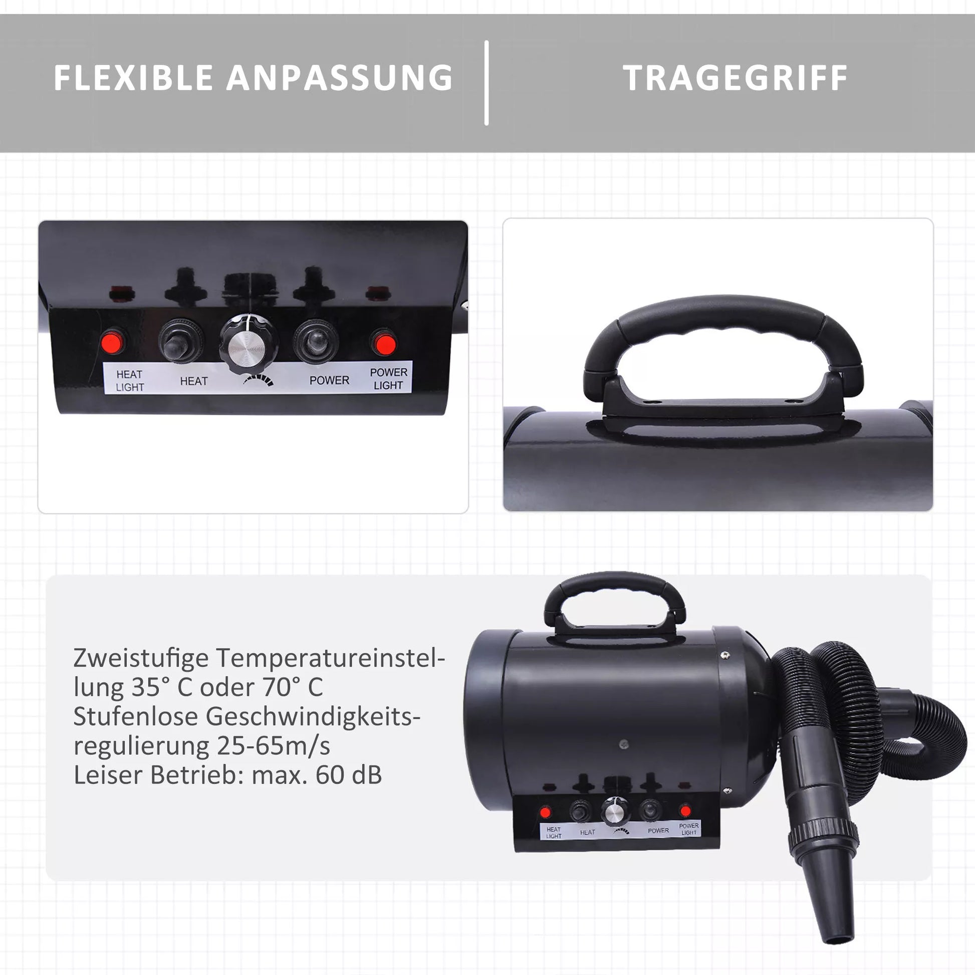 Palepinkite savo augintinius su mūsų „PawHut“ naminių gyvūnėlių džiovintuvu. Dėl galingumo net 2800W dideli šunys bus greitai išdžiovinti. Temperatūrą galima reguliuoti ir pasirinkti vieną iš dviejų lygių: 35° ir 70°. Vėjo stiprumą galite reguliuoti be pakopų – tai puikiai tinka, kad jūsų augintinis priprastų prie džiovintuvo. Nesvarbu, ar naudojate namuose, ar profesionaliai prižiūrite gyvūnus šunų kirpykloje – „PawHut“ šunų džiovintuvas visada yra puikus pasirinkimas.