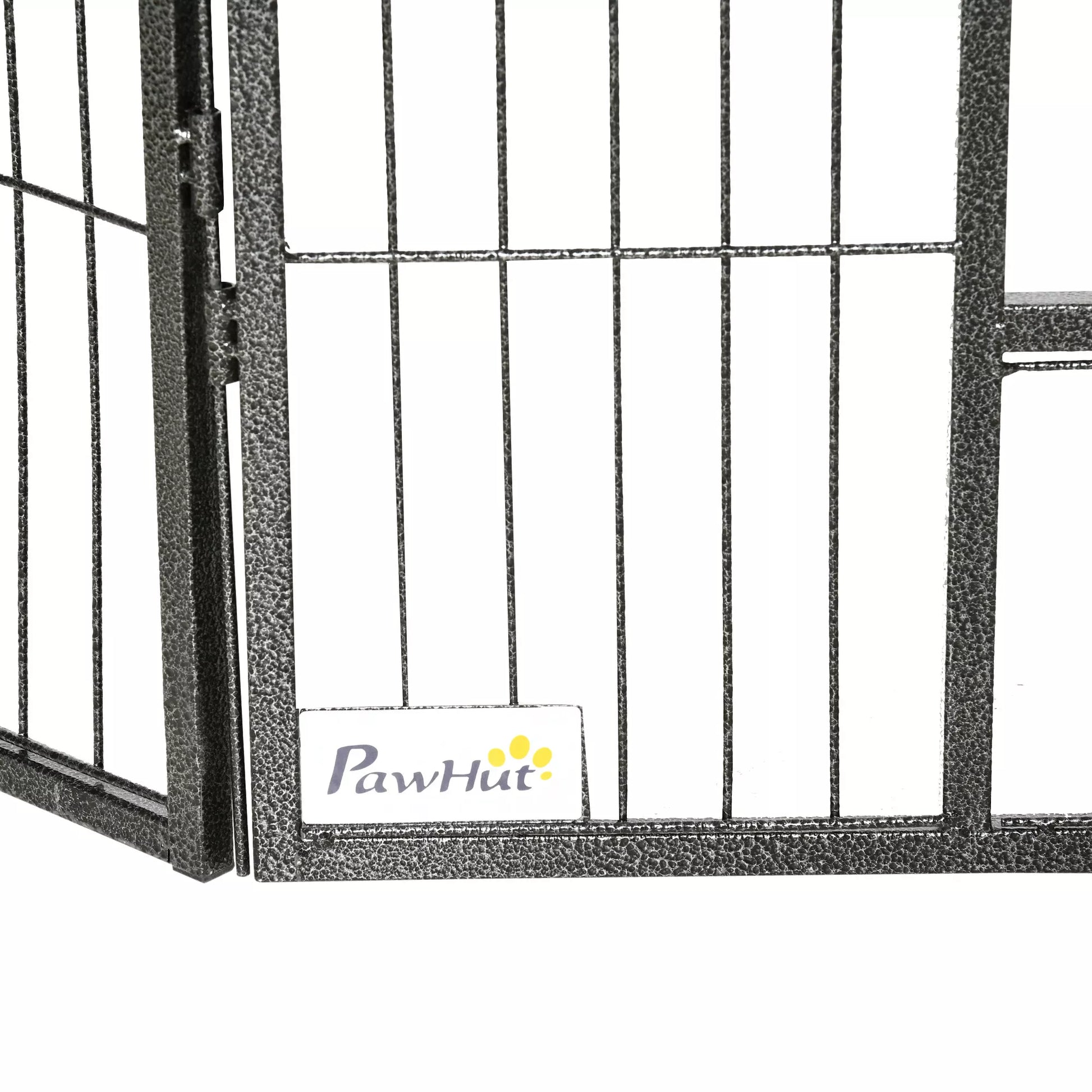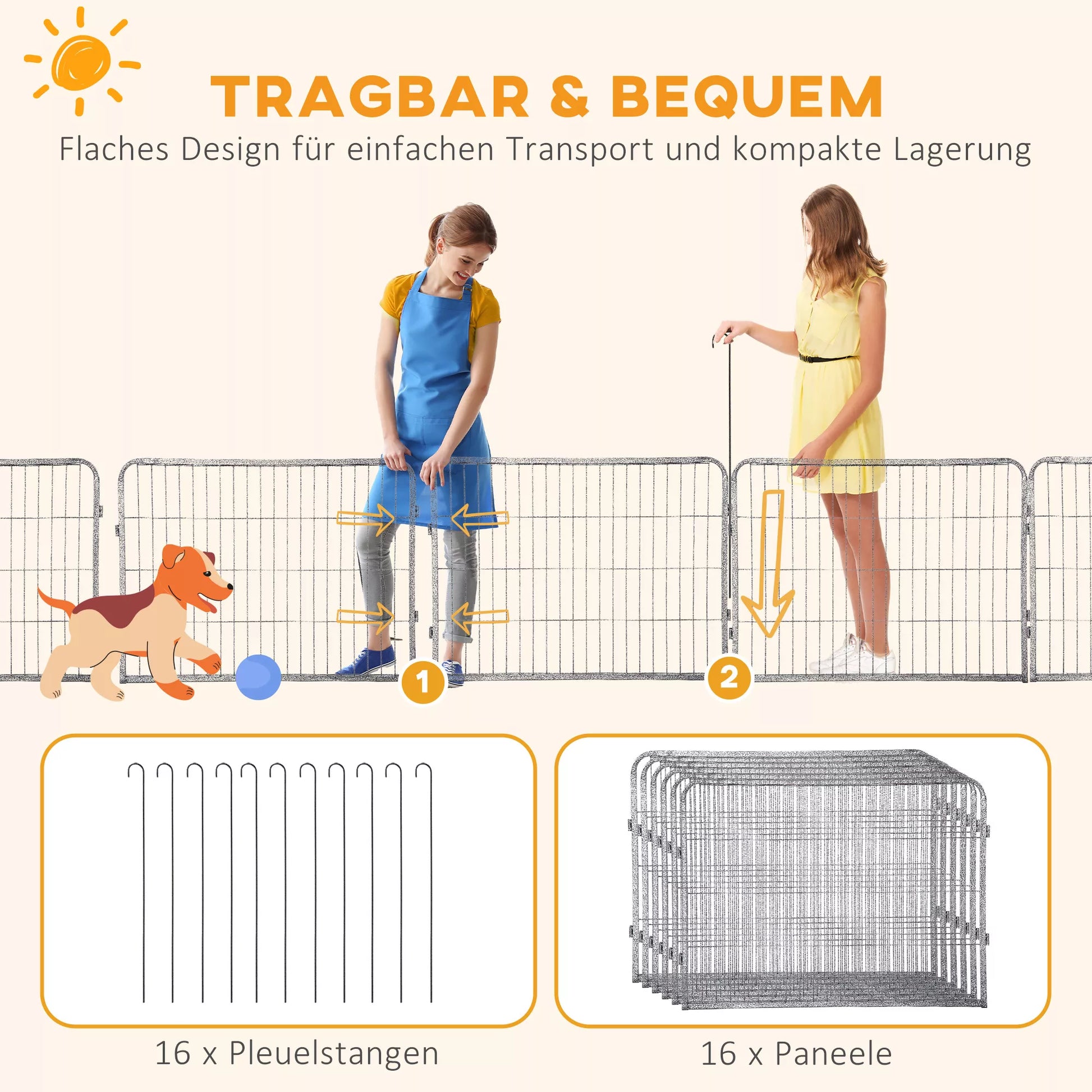 Šis praktiškas PawHut aptvaras suteikia jūsų augintiniams daug saugios erdvės žaisti ir ilsėtis, neleisdamas jiems patekti į pavojų. Aptvaras susideda iš 16 segmentų, kuriuos galima laisvai kombinuoti ir pritaikyti prie jūsų aplinkos. Dvi užrakinamos durys suteikia lengvą prieigą ir užtikrina jūsų gyvūnų saugumą. Pagamintas iš tvirto metalinio rėmo ir tinklo, aptvarą galima naudoti tiek viduje, tiek lauke.