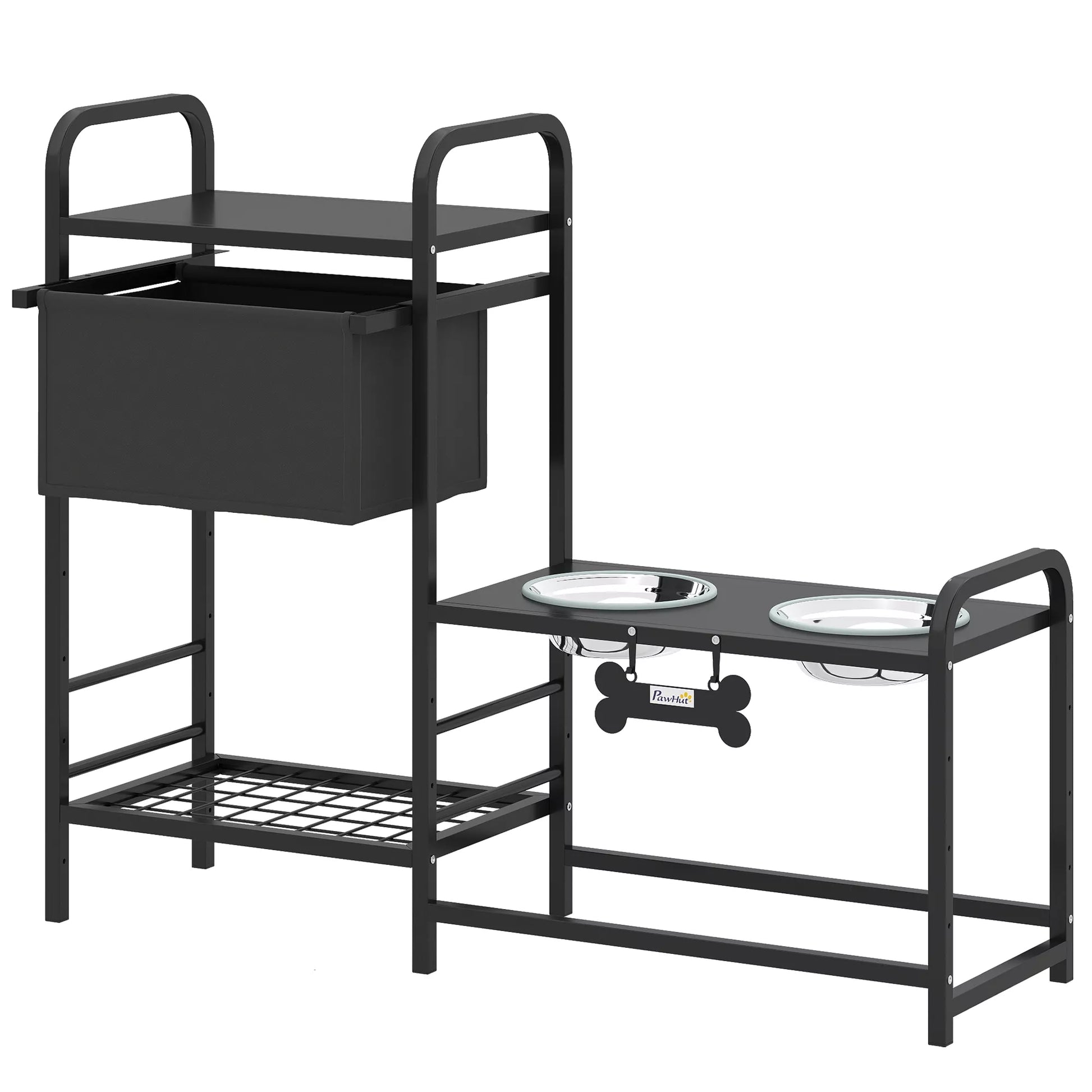 Reguliuojamo aukščio paaukštintas šunų dubenėlių stovas su daiktų laikymo skyriumi, šėrykla su dviem dubenėliais, medis ir nerūdijantis plienas, 89,5 x 27 x 74 cm, juoda