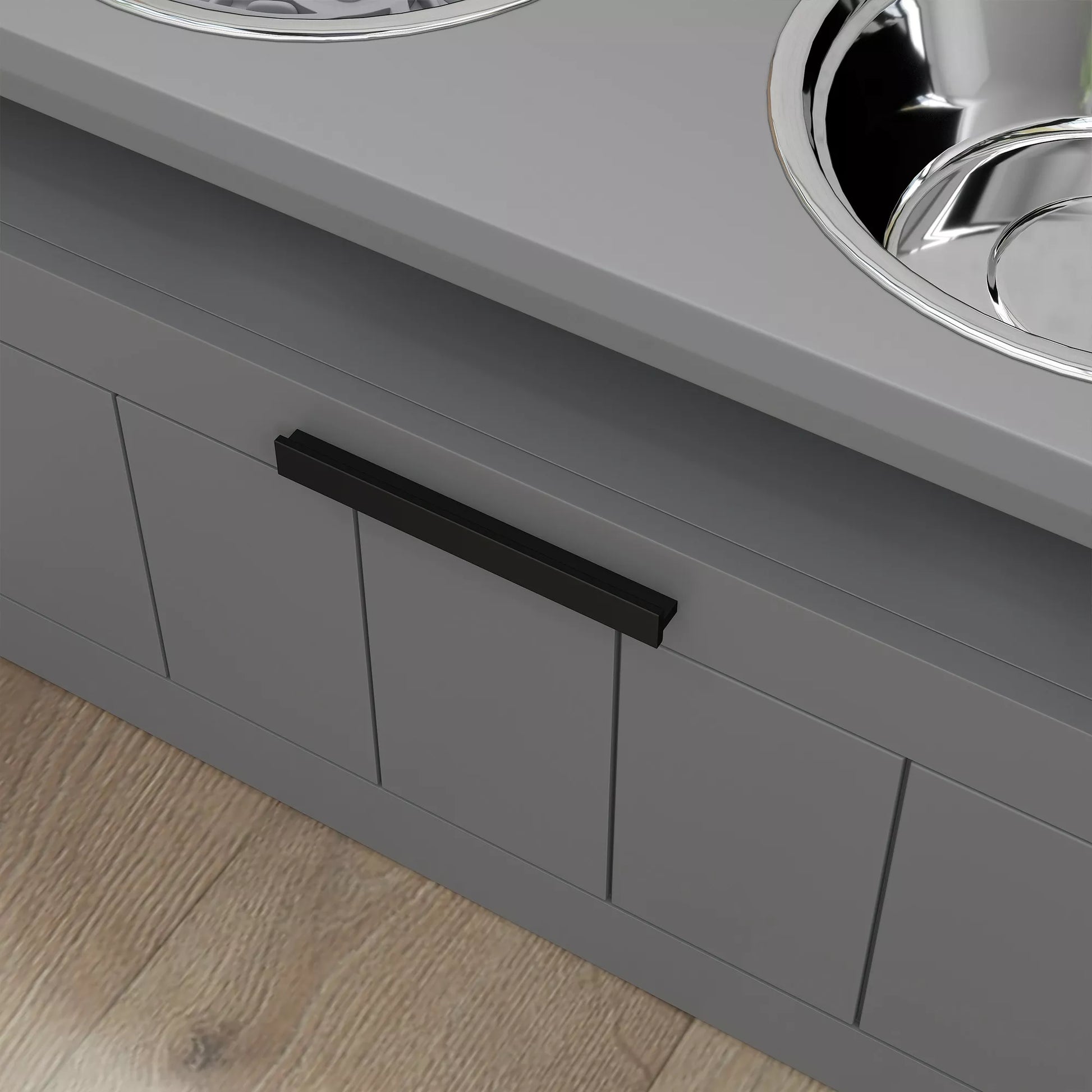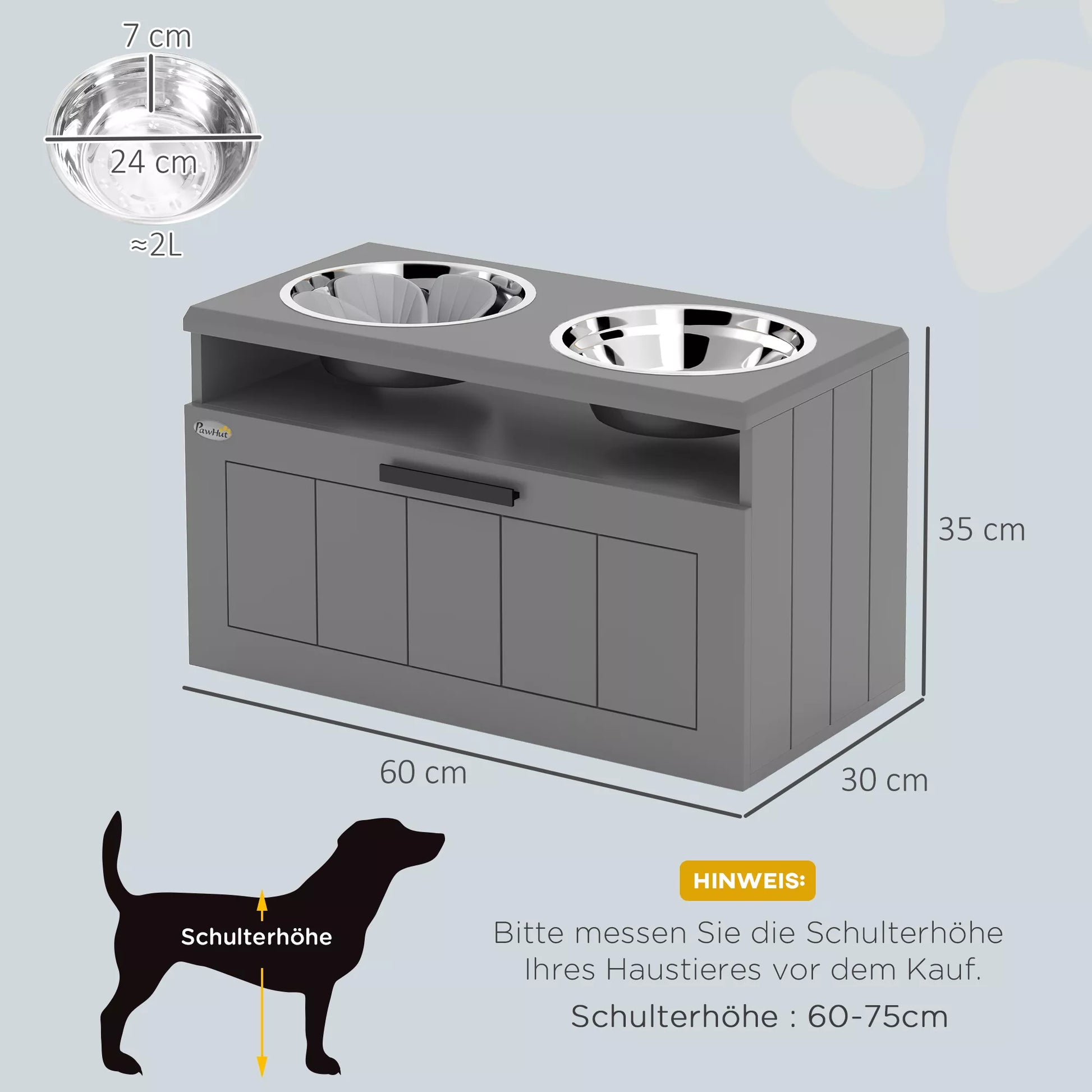Šėrimo stotelė dideliems šunims, su 2 nerūdijančio plieno dubenėliais, stalčius, naminių gyvūnėlių ėdalo dozatorius, MDF, plienas, pilka