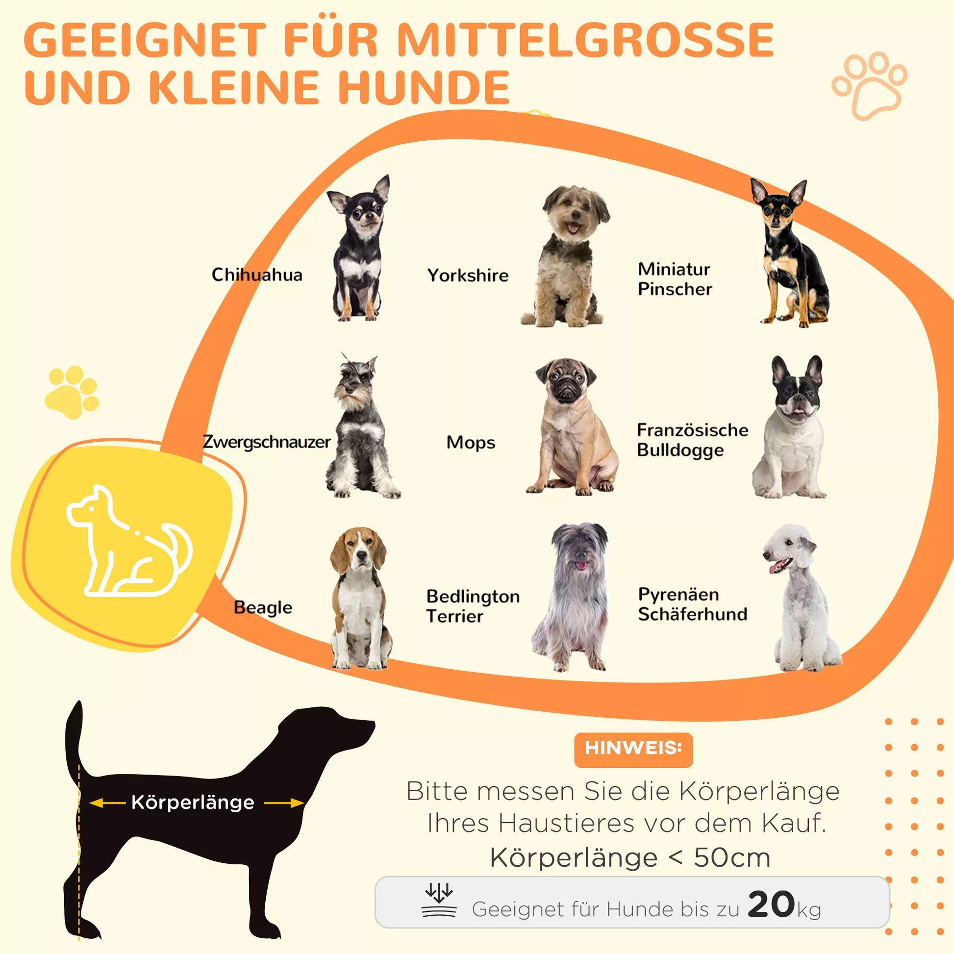 - ✔ Tinka vidutinio dydžio šunims iki 20 kg; rekomenduojama, kad šuo būtų trumpesnis nei 50 cm