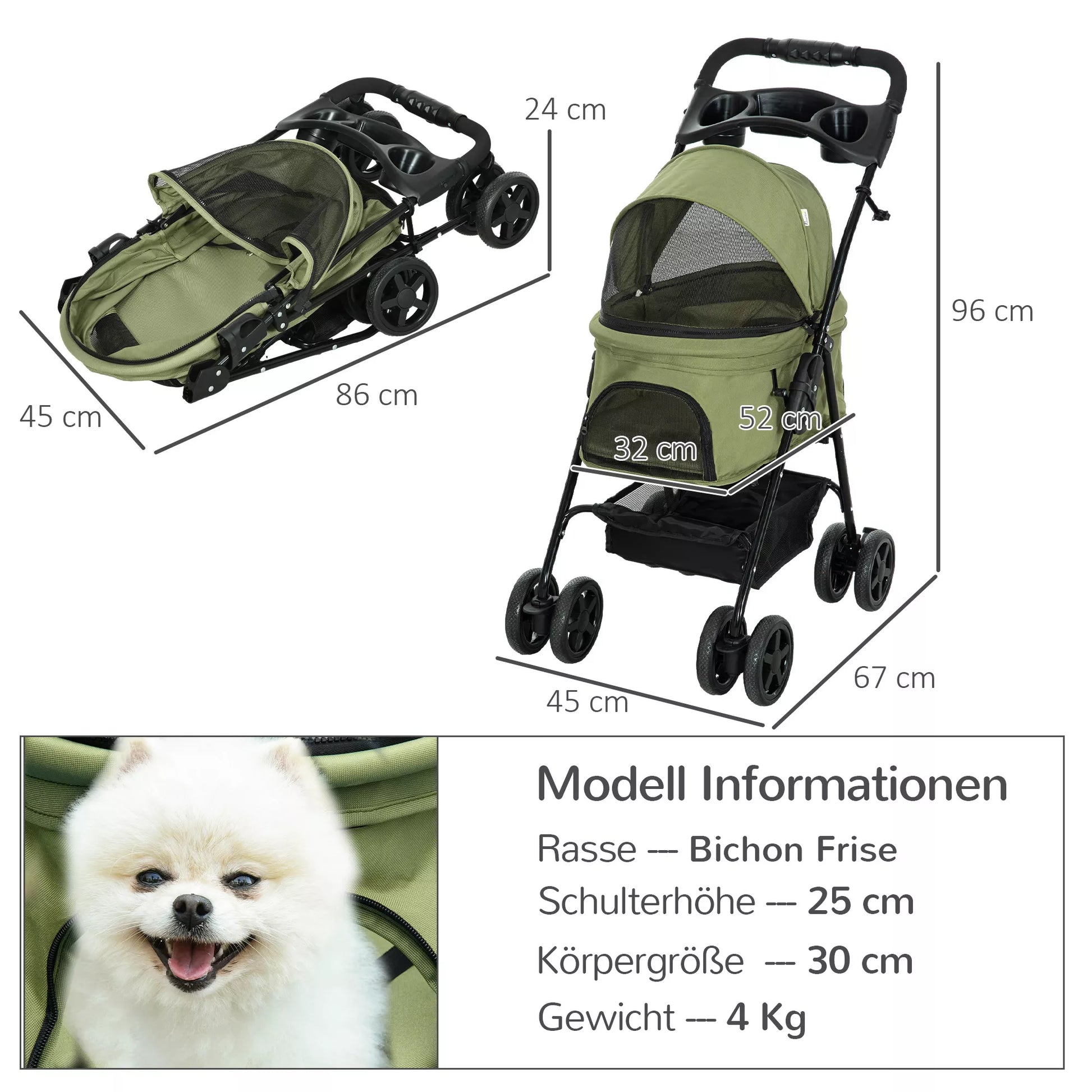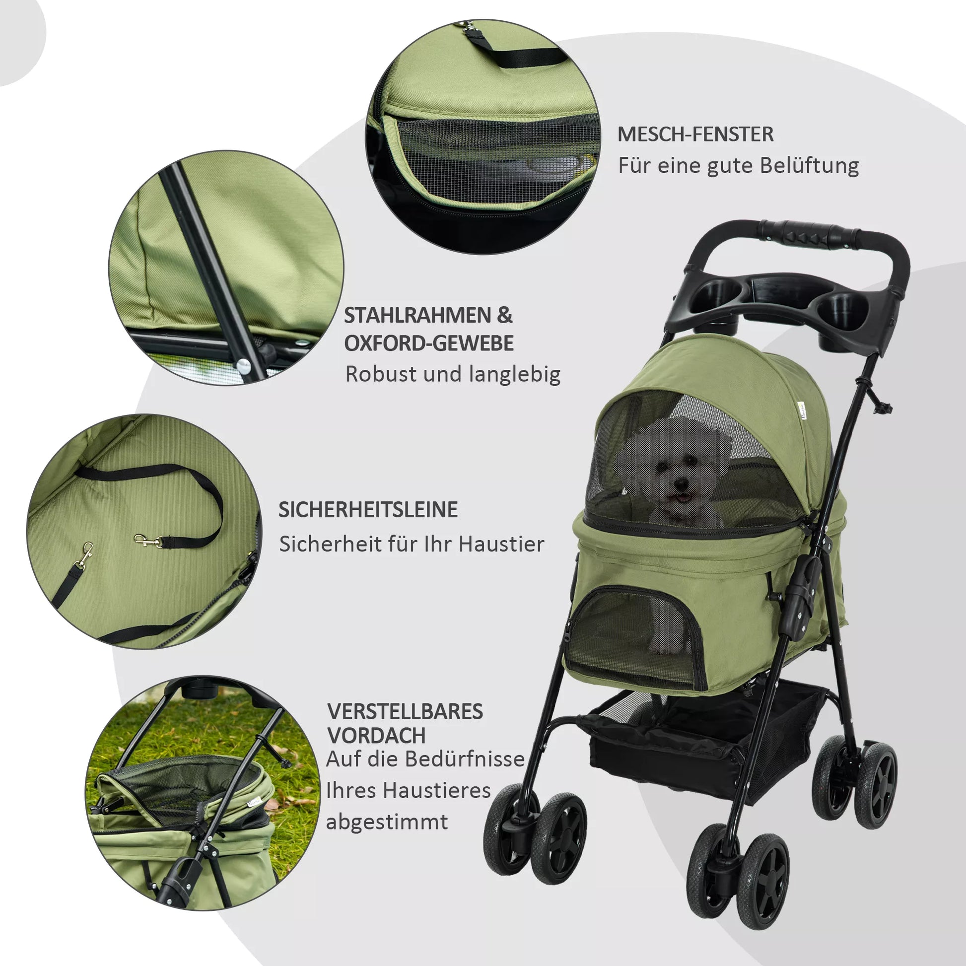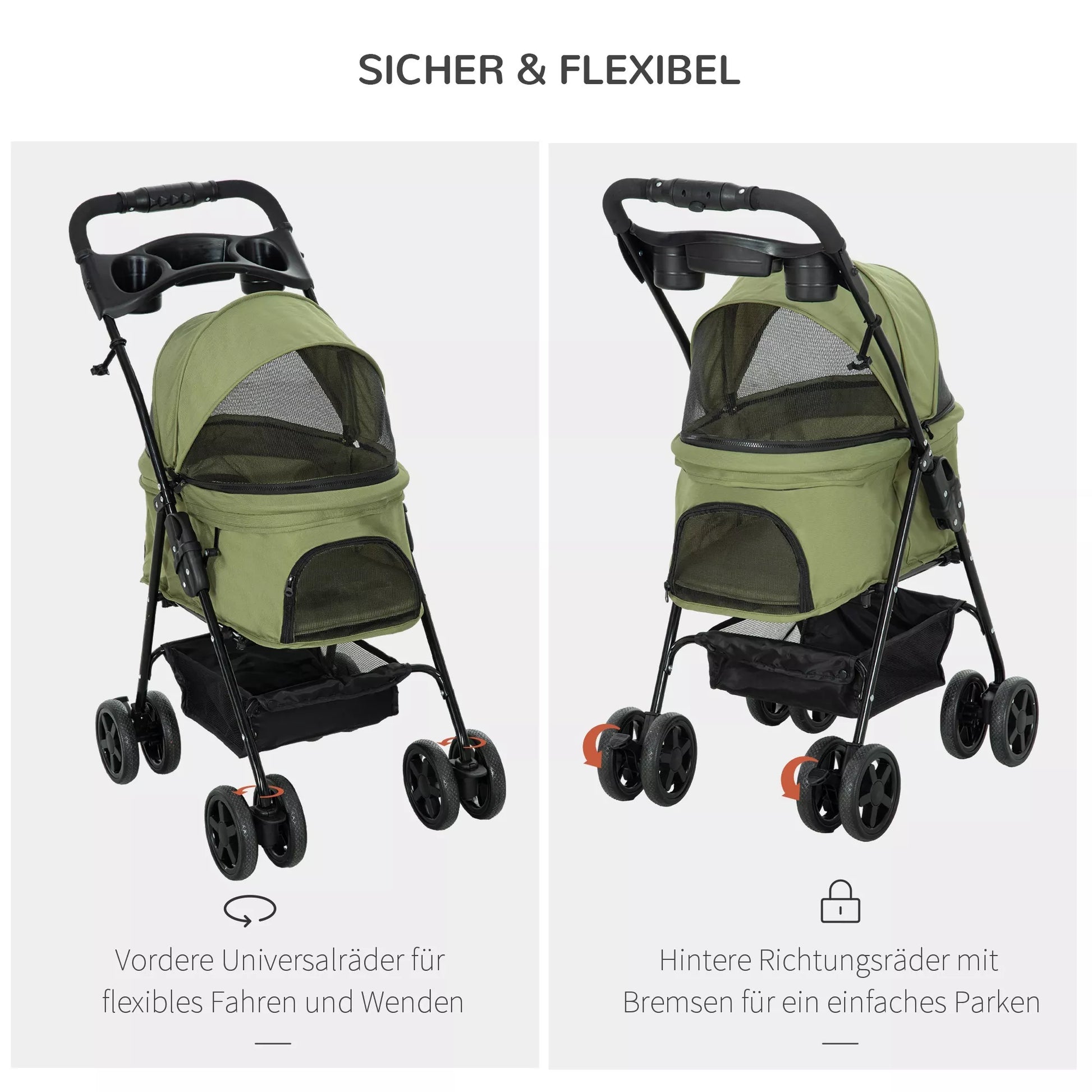 Šunų vežimėlis, sulankstomas, 2 saugos pavadėliai, 2 puodelių laikikliai, 67 x 45 x 96 cm, Chaki