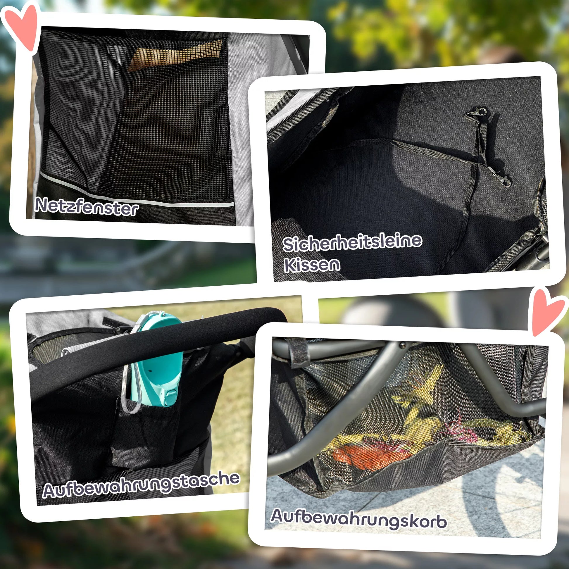 - ✔ Erdvus šunų vežimėlio salonas leidžia augintiniams patogiai sėdėti arba gulėti