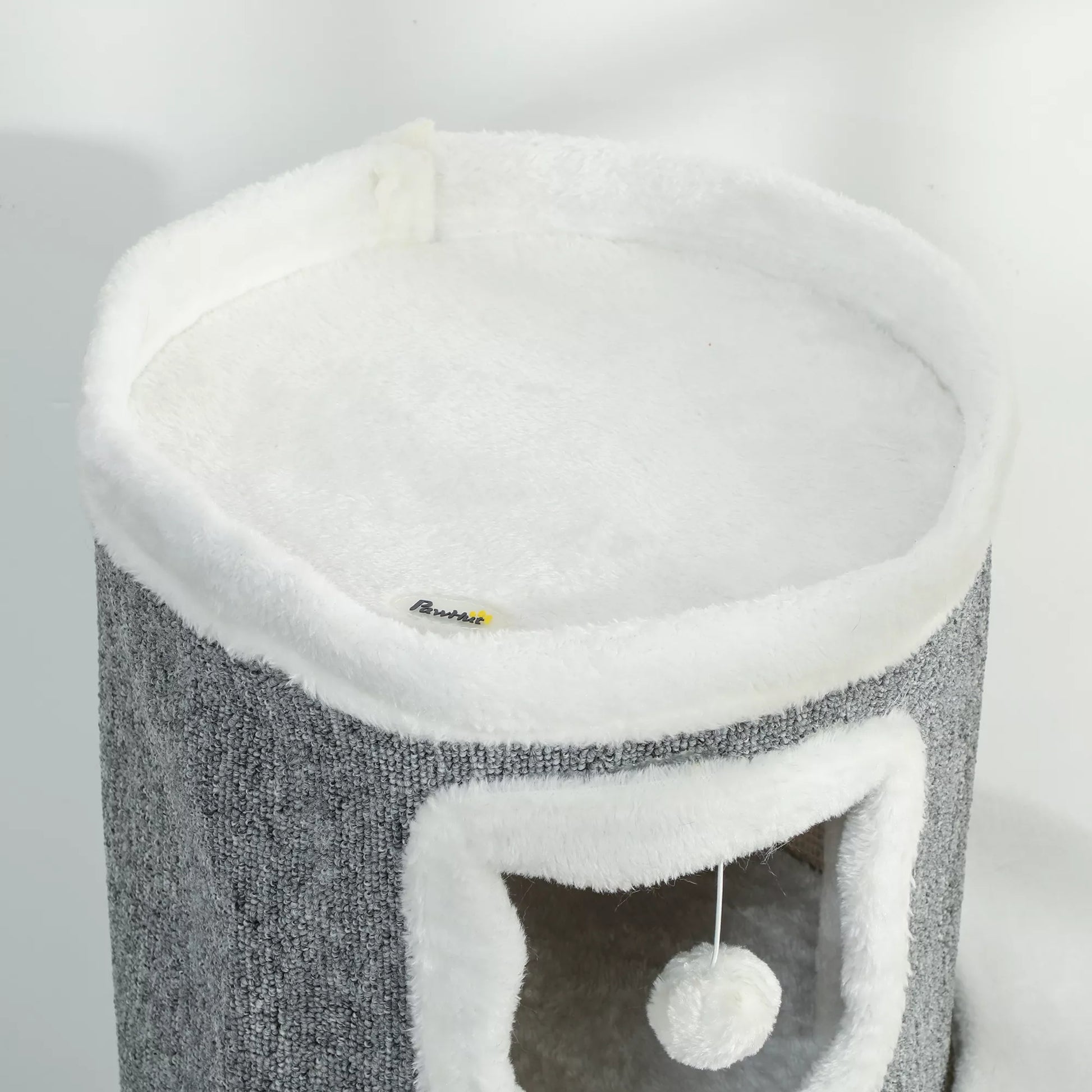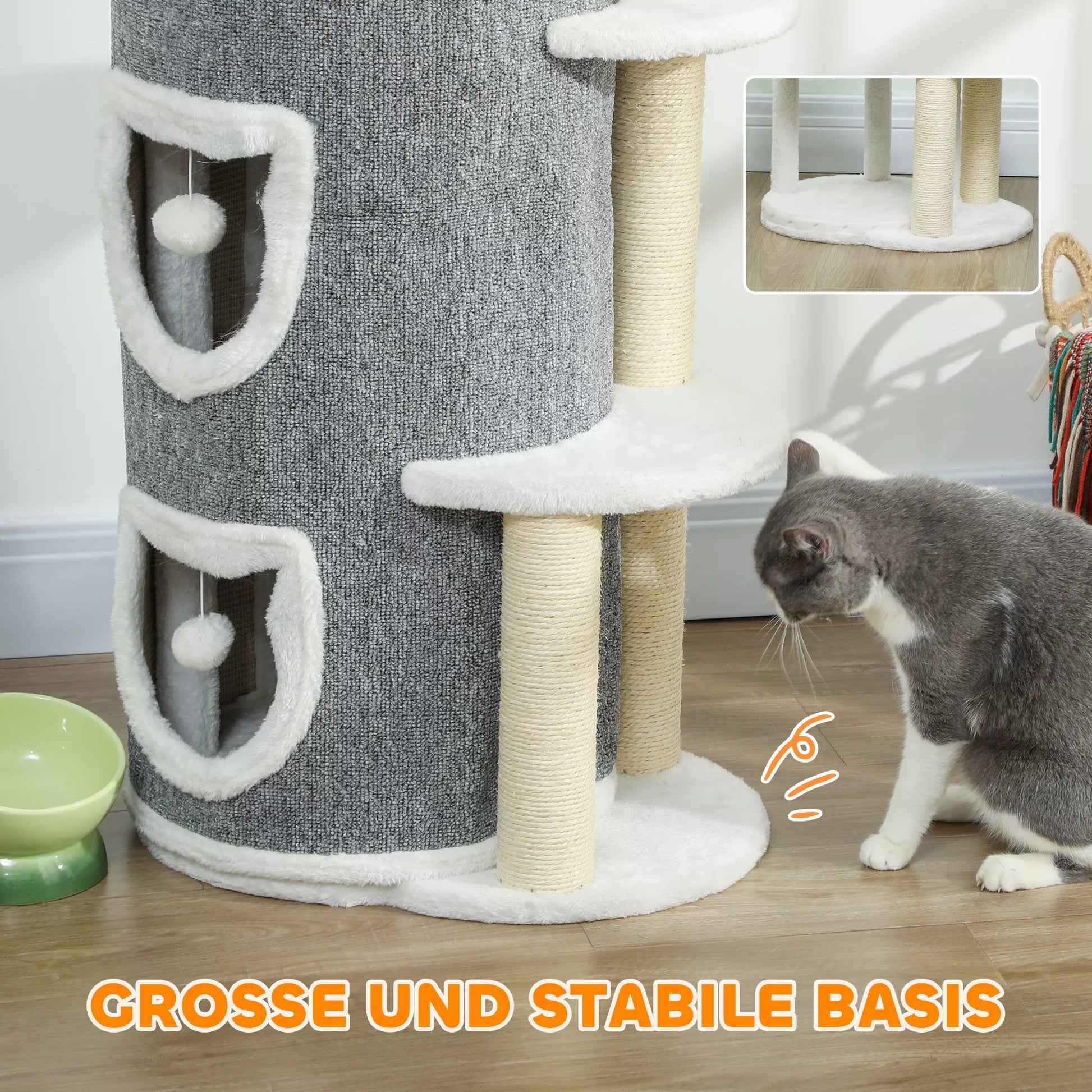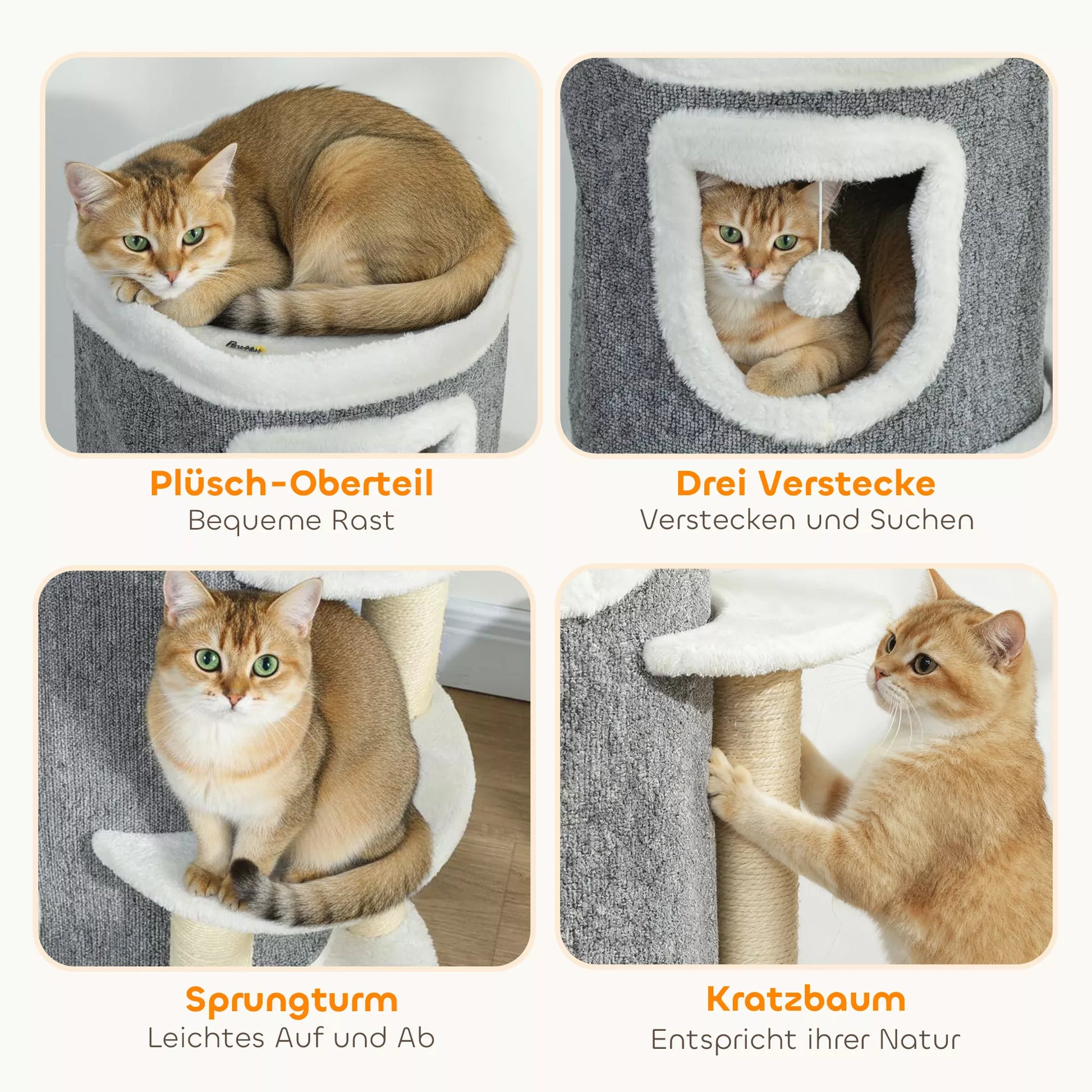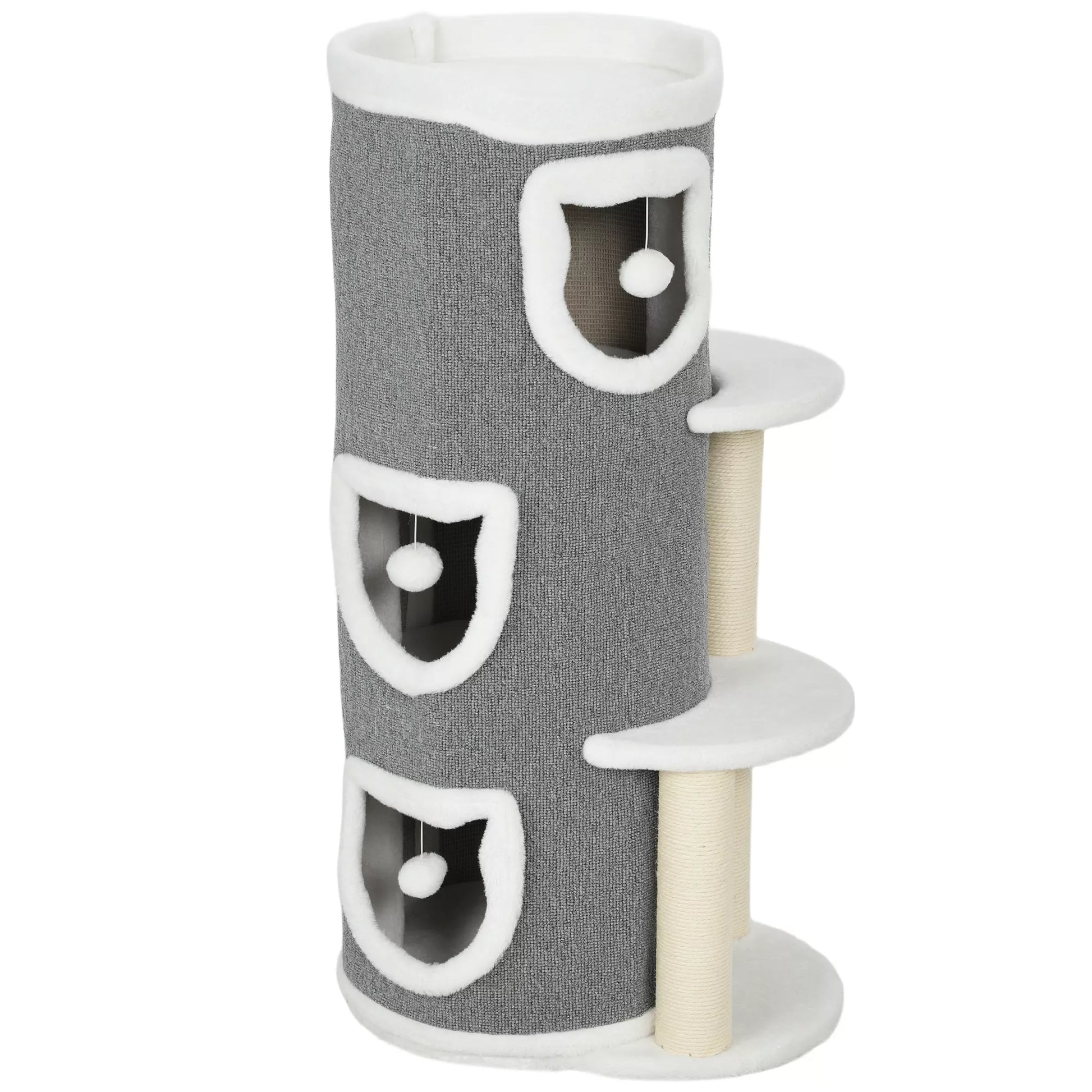 101 cm kaķu tornis, 3 līmeņi, 3 guļamvietas, rotaļu bumbiņas, skrāpējamais stabs, sizala materiāls, skaidu plāksne, pelēks