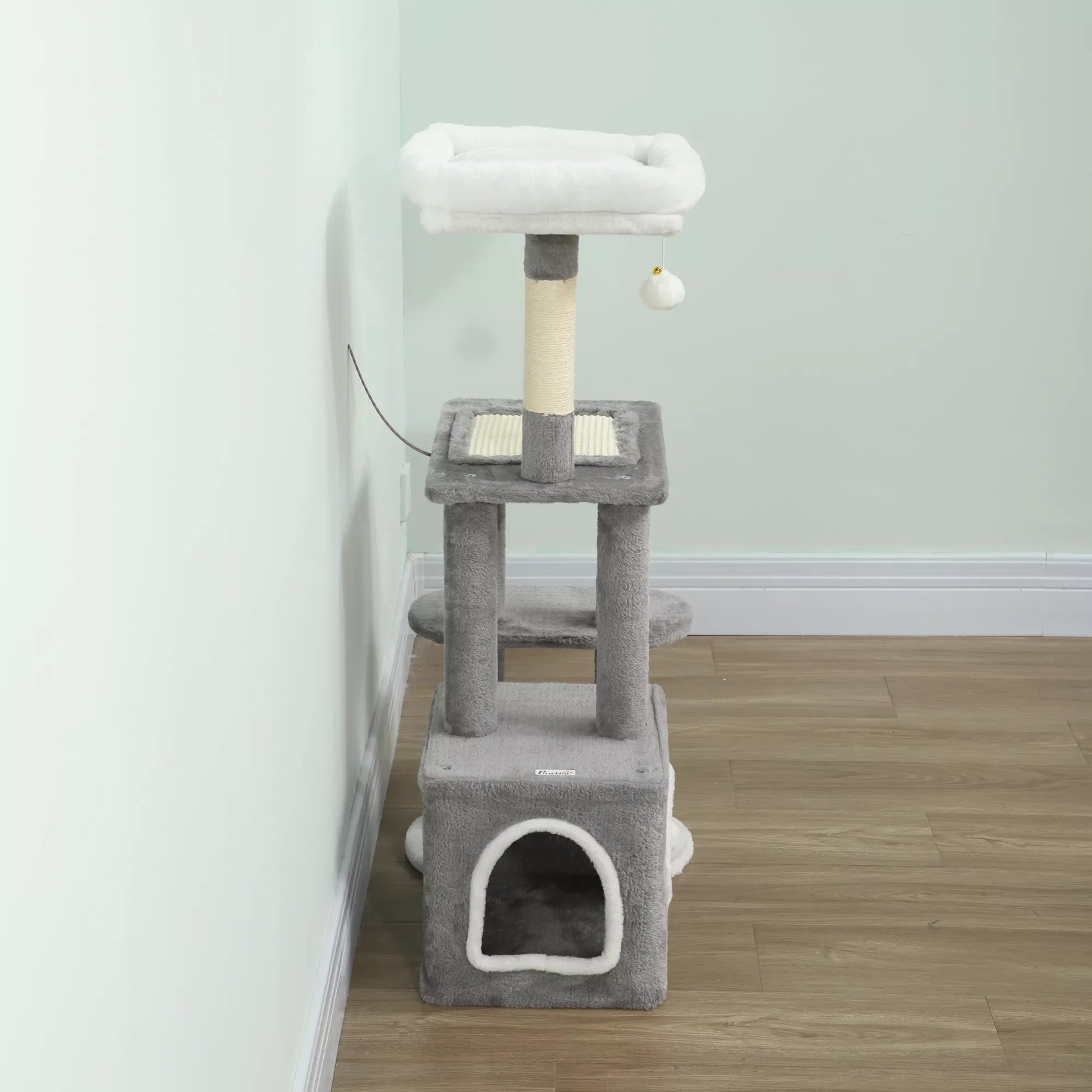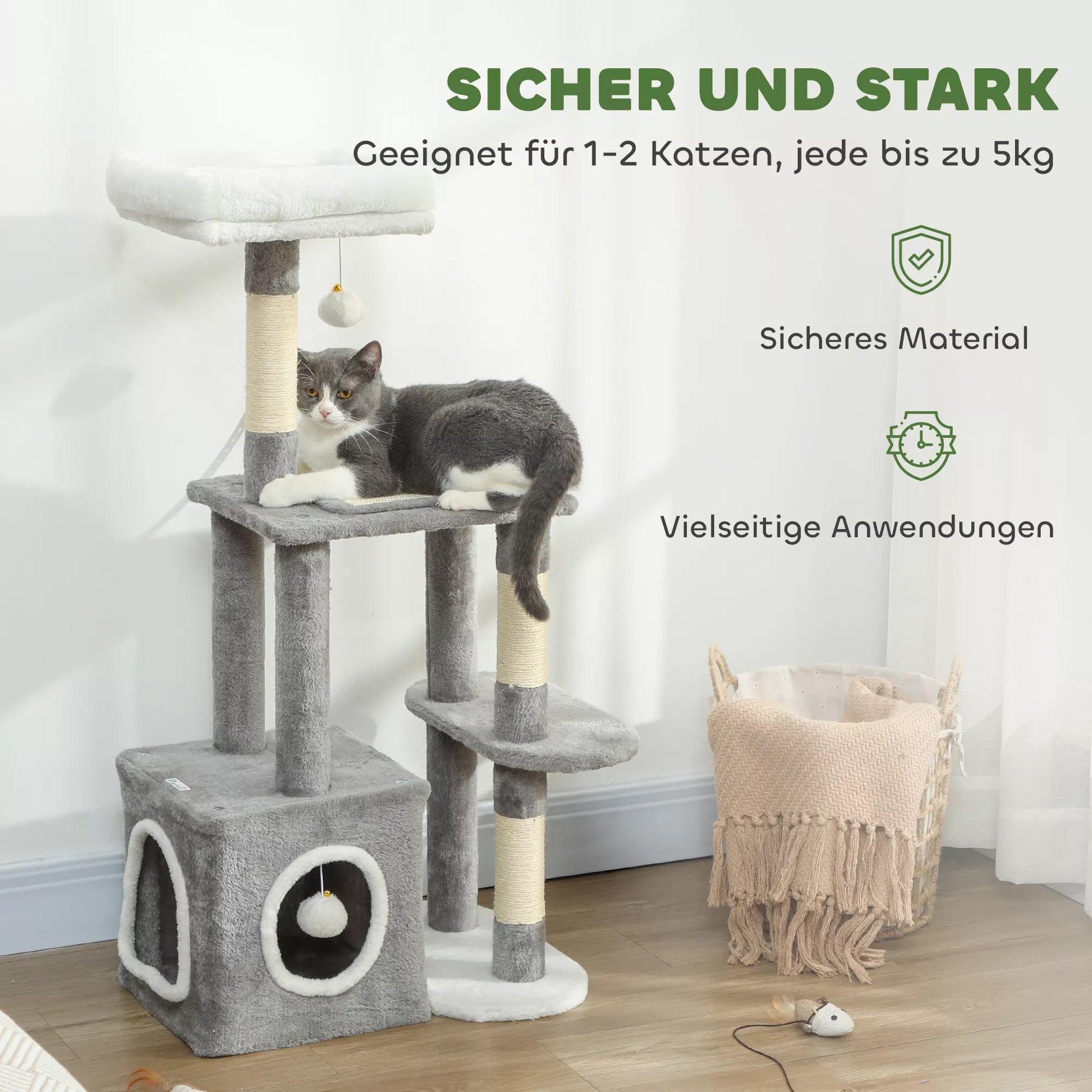 107 cm kaķu māja, kaķu tornis ar alu, 2 plīša bumbiņas, sizala stieņi, liela platforma, 55x40x107 cm, pelēka