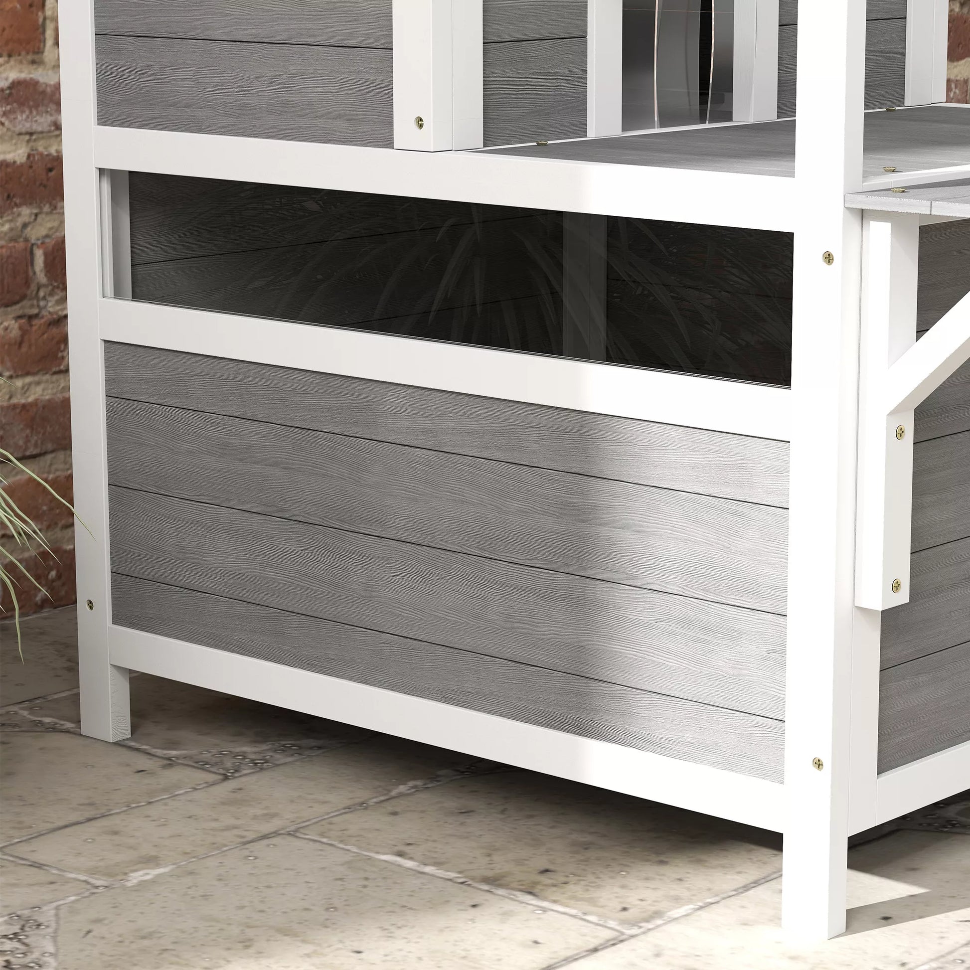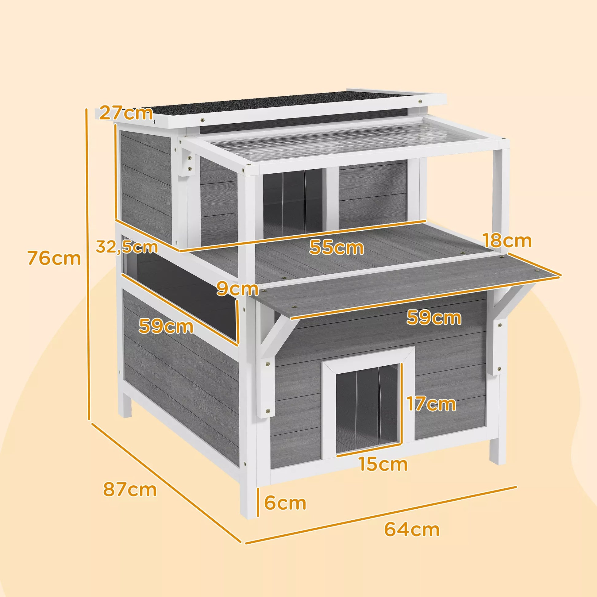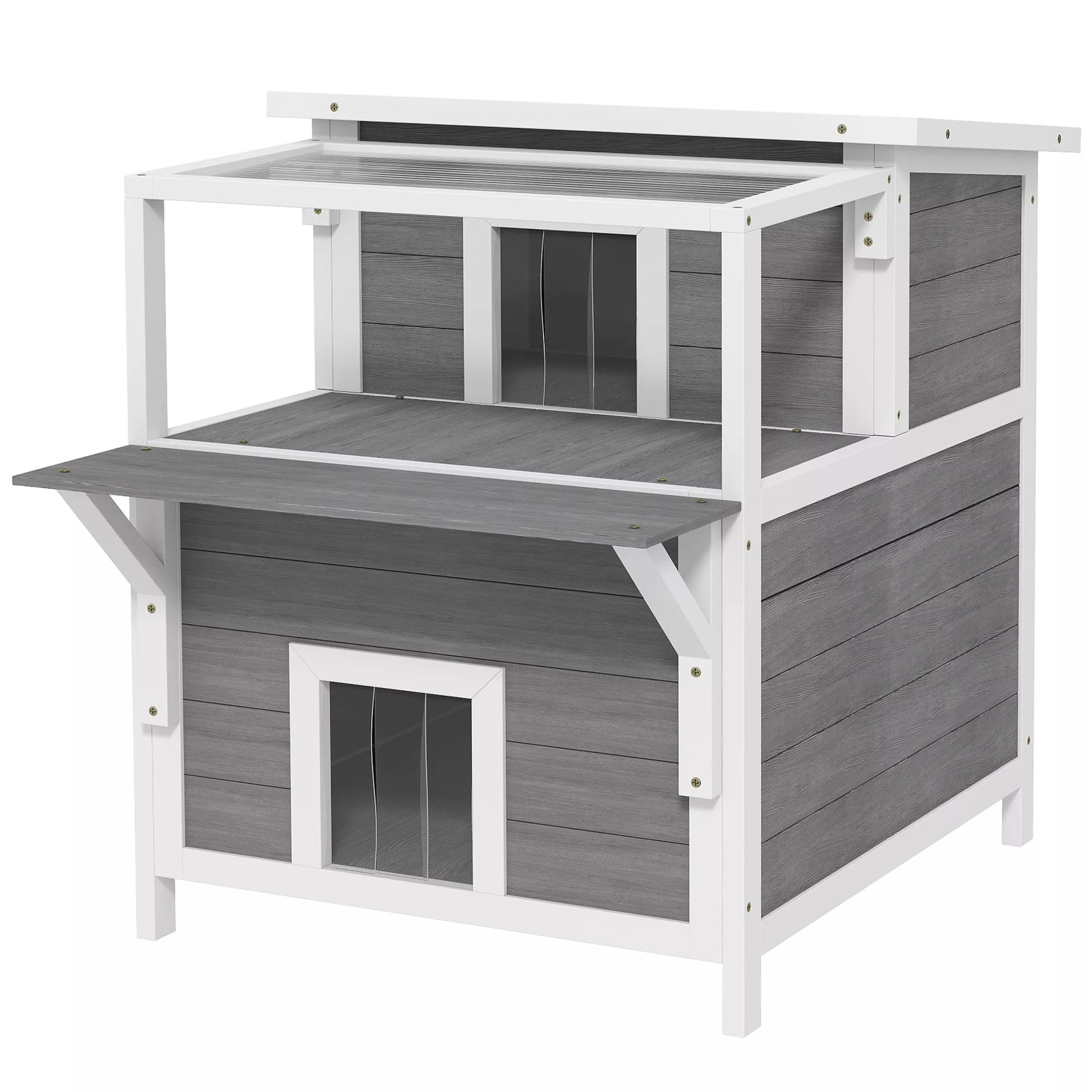 Divstāvu kaķu māja ar balkonu, laikapstākļiem izturīga kaķu būda, aizsardzība pret lietu un sauli, lietošanai iekštelpās un ārā, gaiši pelēka