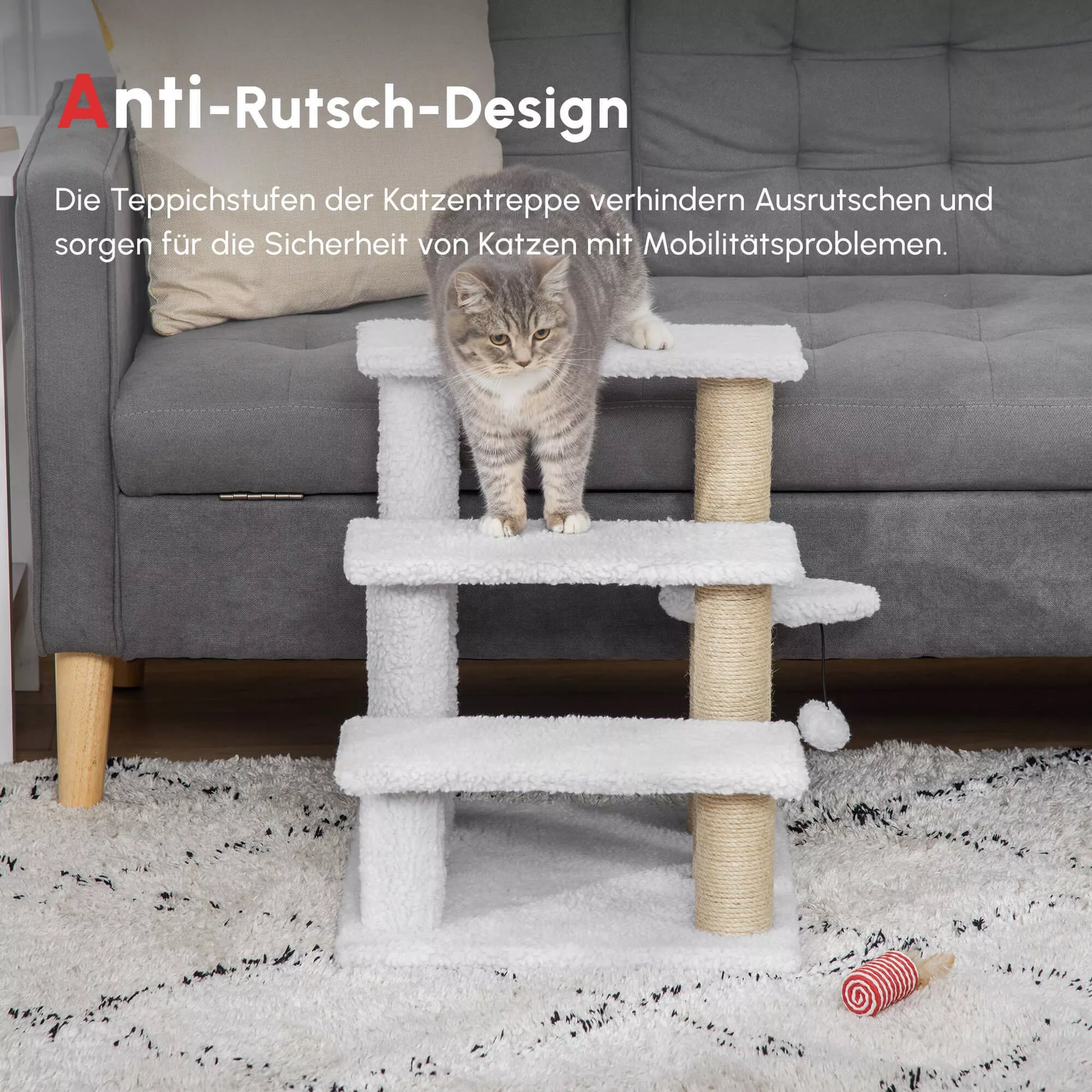 3 pakāpienu mājdzīvnieku kāpnes ar skrāpējamiem stabiem un bumbu, kaķiem līdz 5 kg, suņiem, plīša, džutas, baltas, 45 x 40 x 48 cm