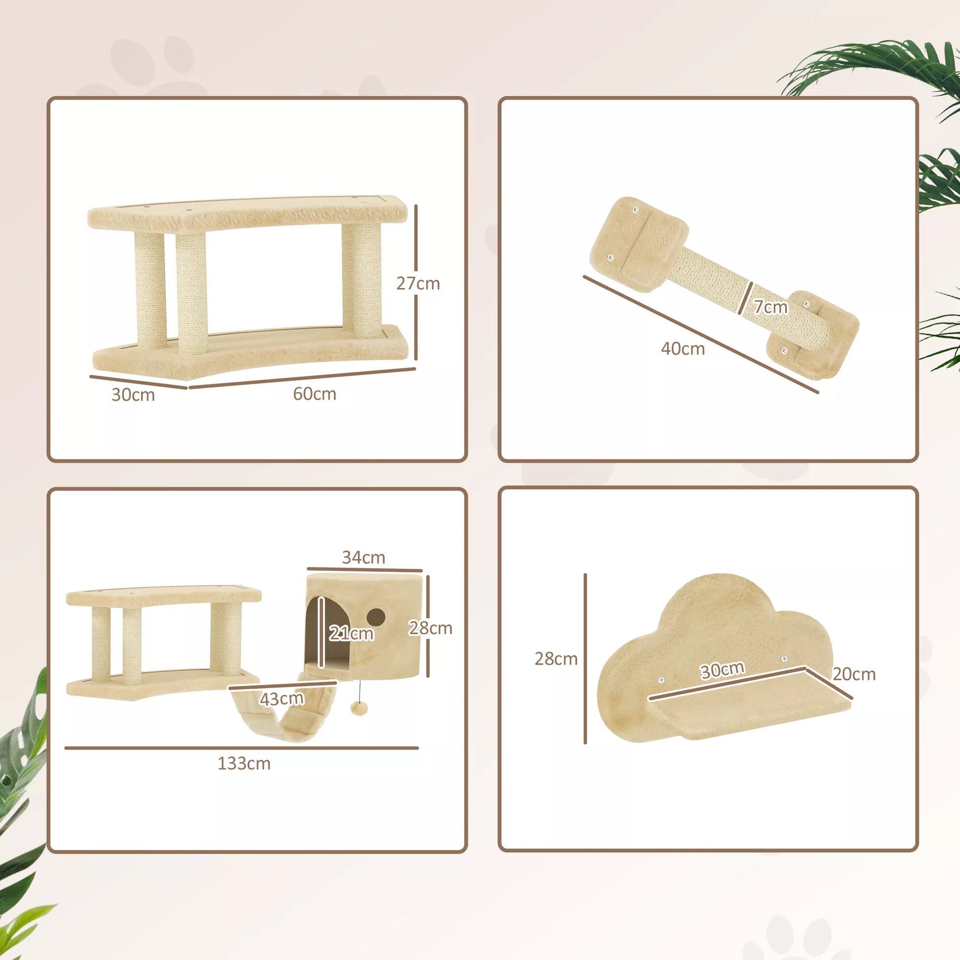 5 daļu kaķu kāpšanas komplekts ar skrāpējamiem stabiem, lēkšanas platformām, kāpnēm, mājiņu, sienas stiprinājumu, bēšs