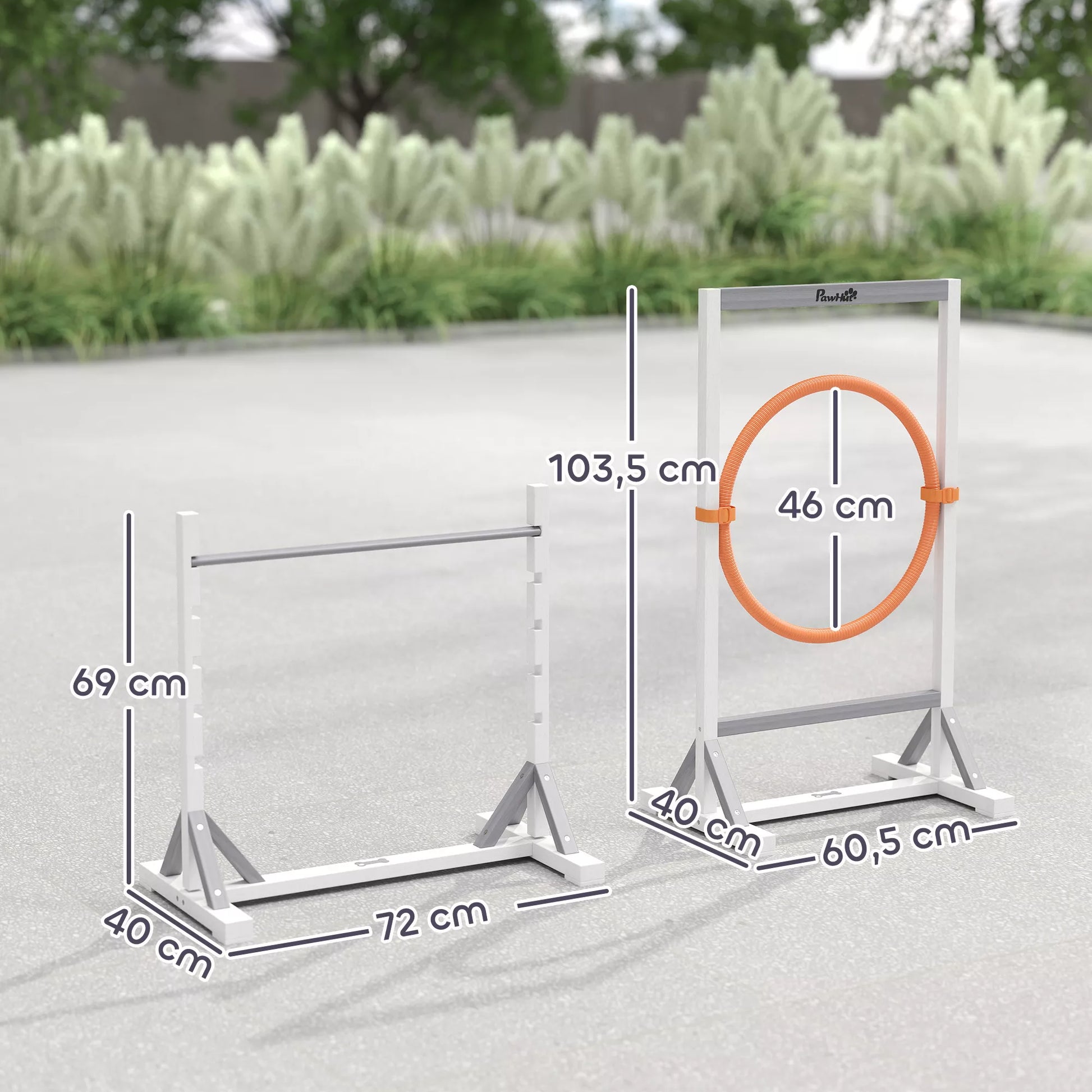 Suņu veiklības komplekts, 4 daļu treniņu aprīkojums ar regulējama augstuma šķēršļiem un stīpu, balts