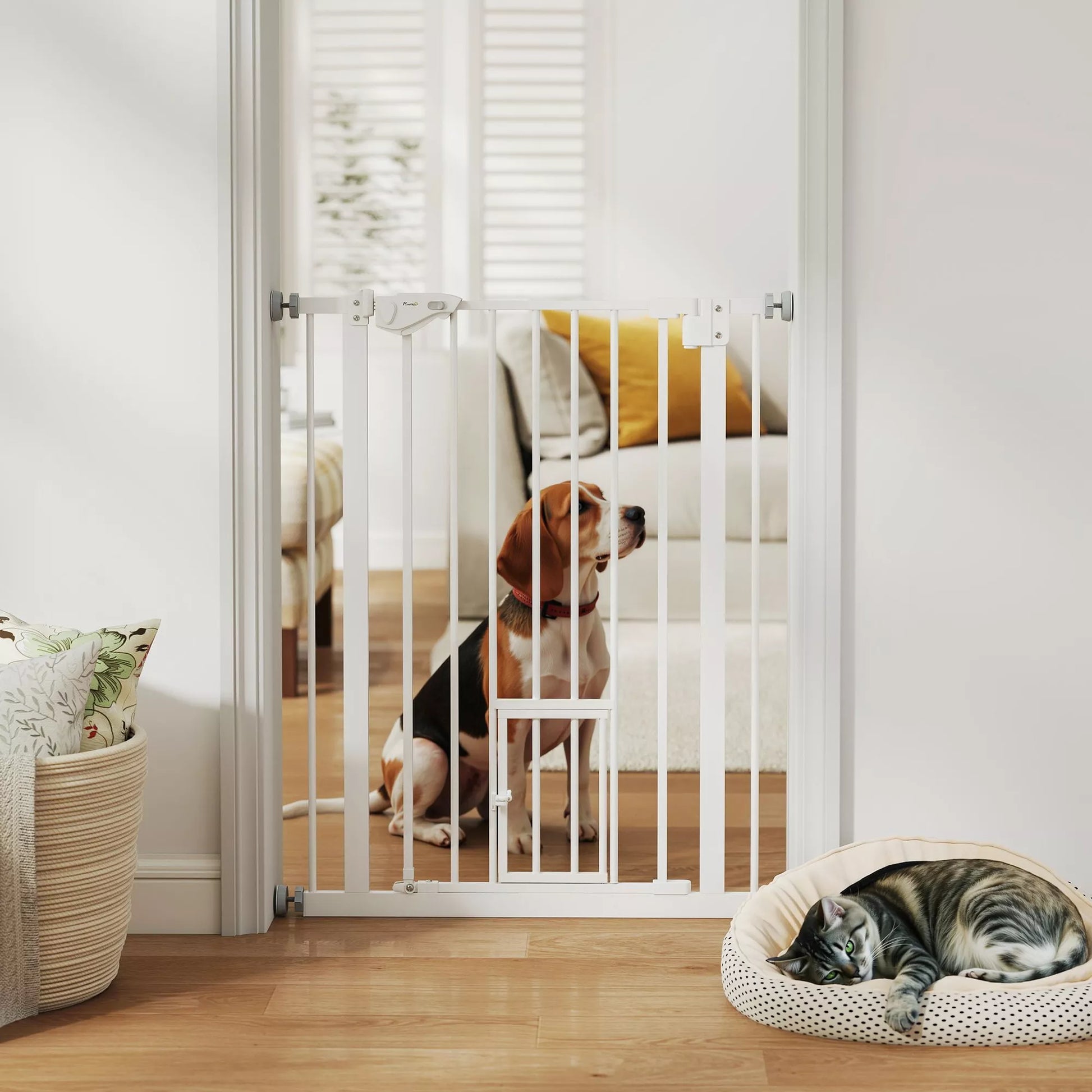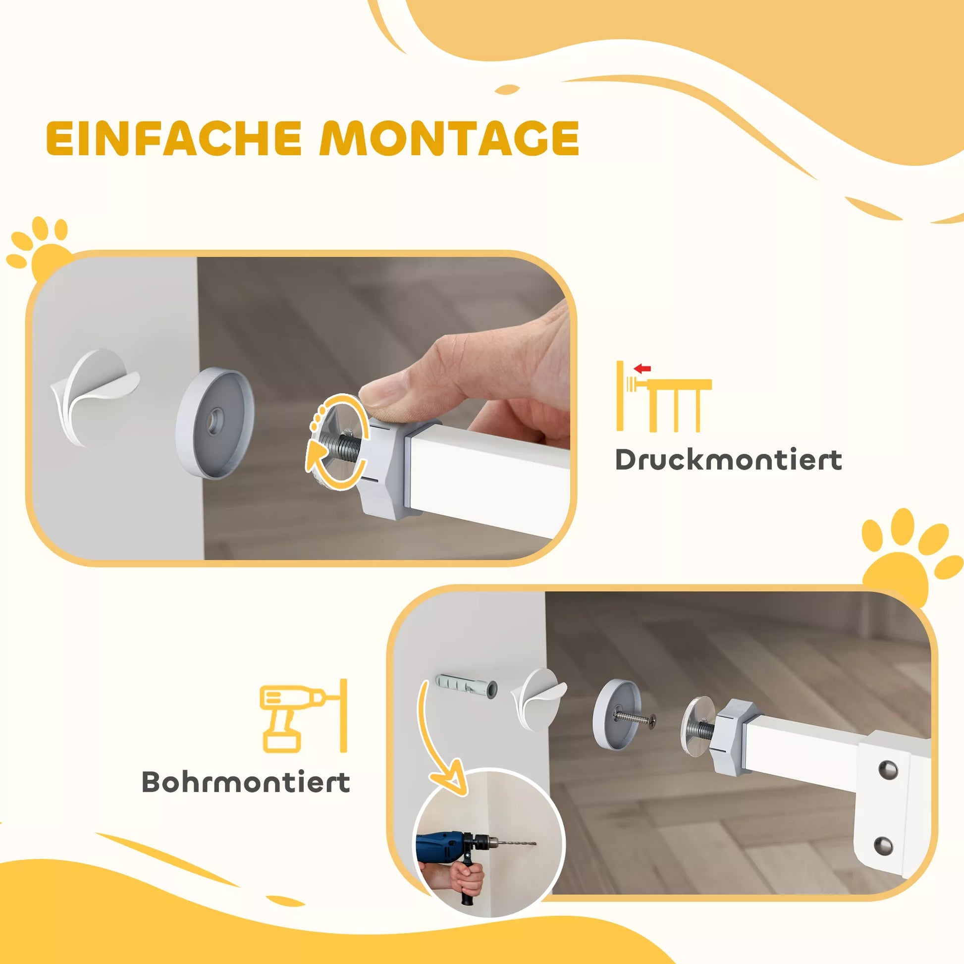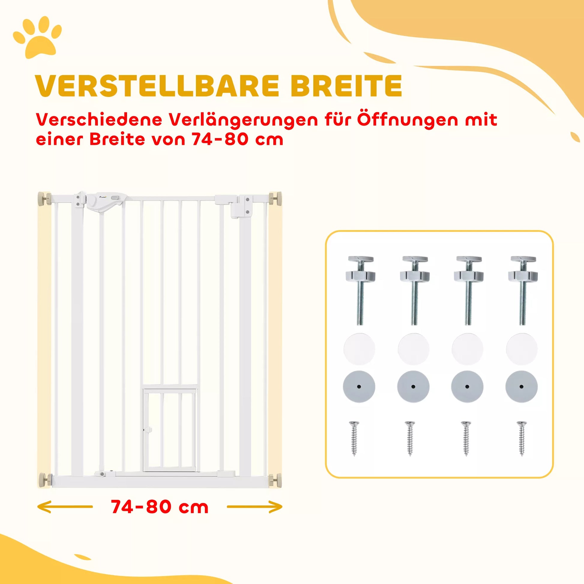 Drošības vārtiņi ar kaķu durvīm, uzstādīšana bez urbšanas, regulējams platums 74-80 cm, atveras ar vienu roku, metāla, balti
