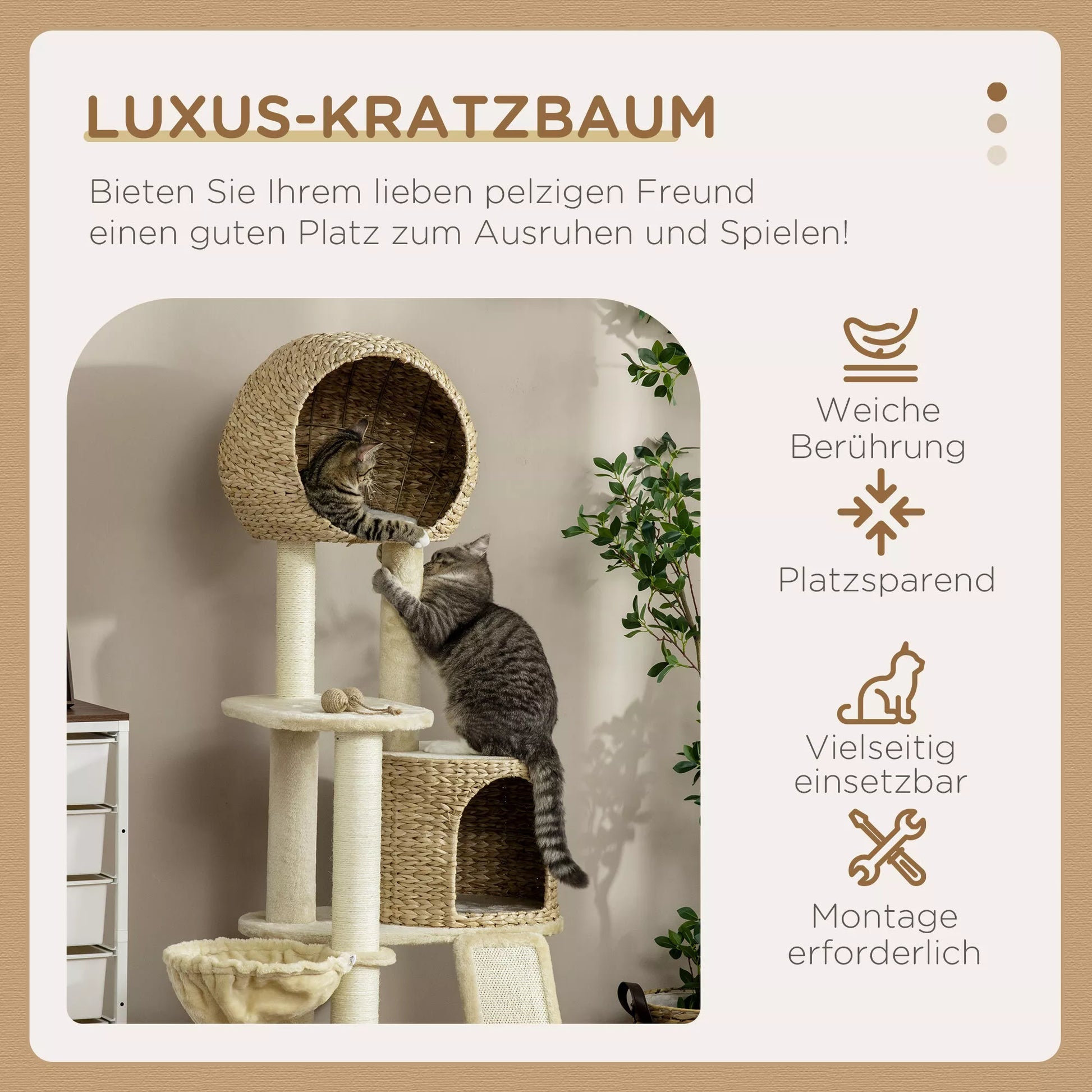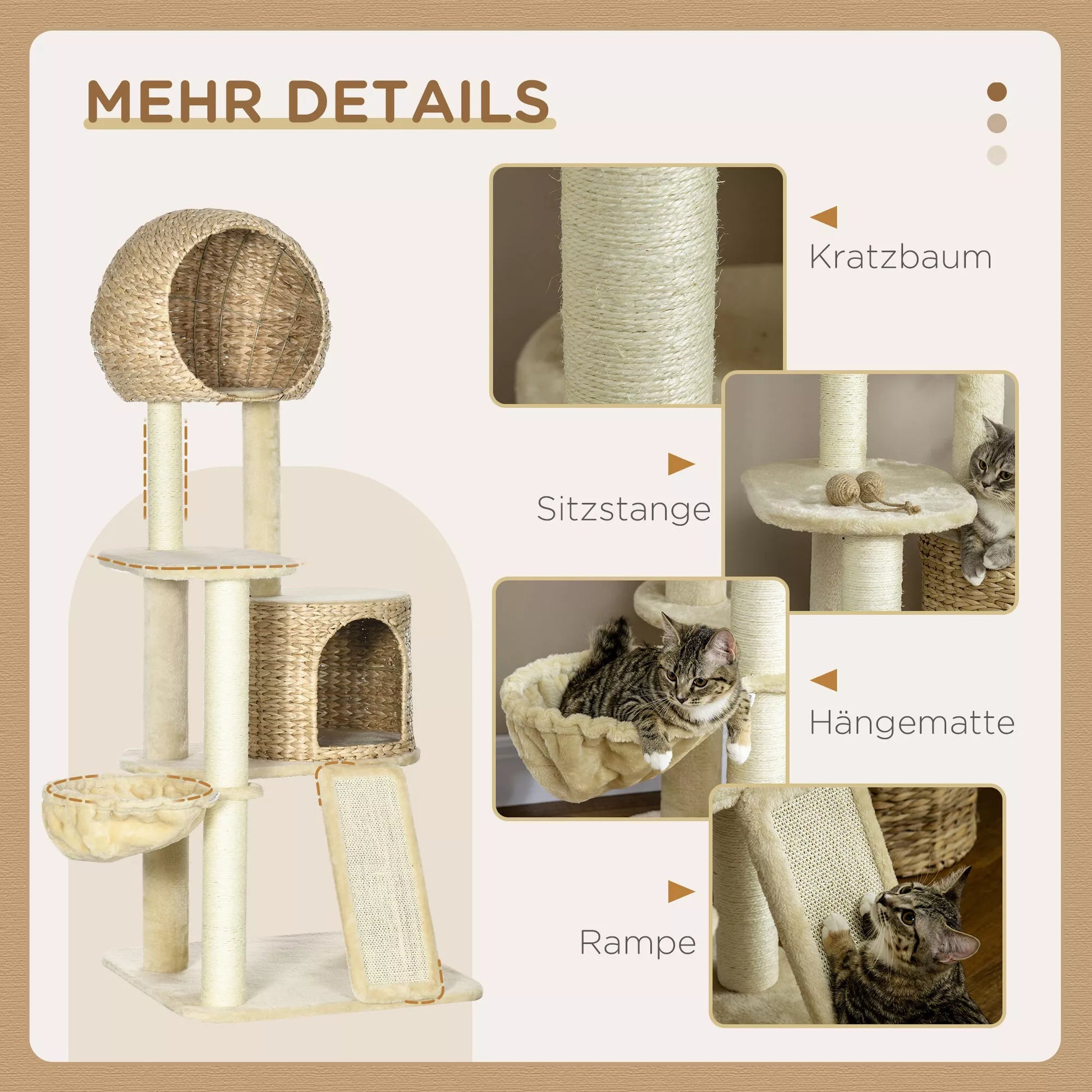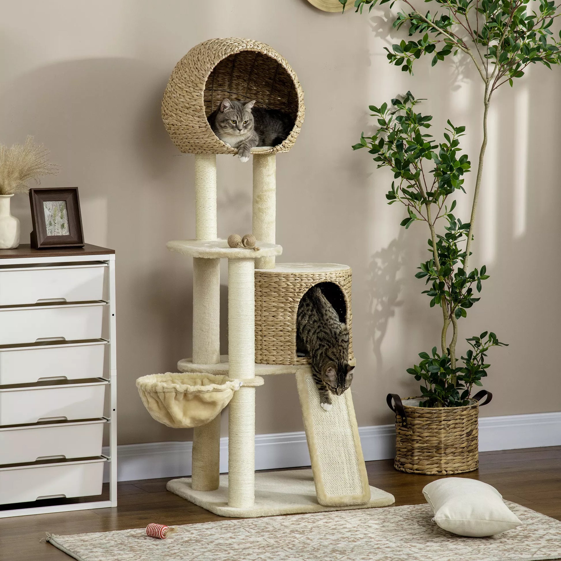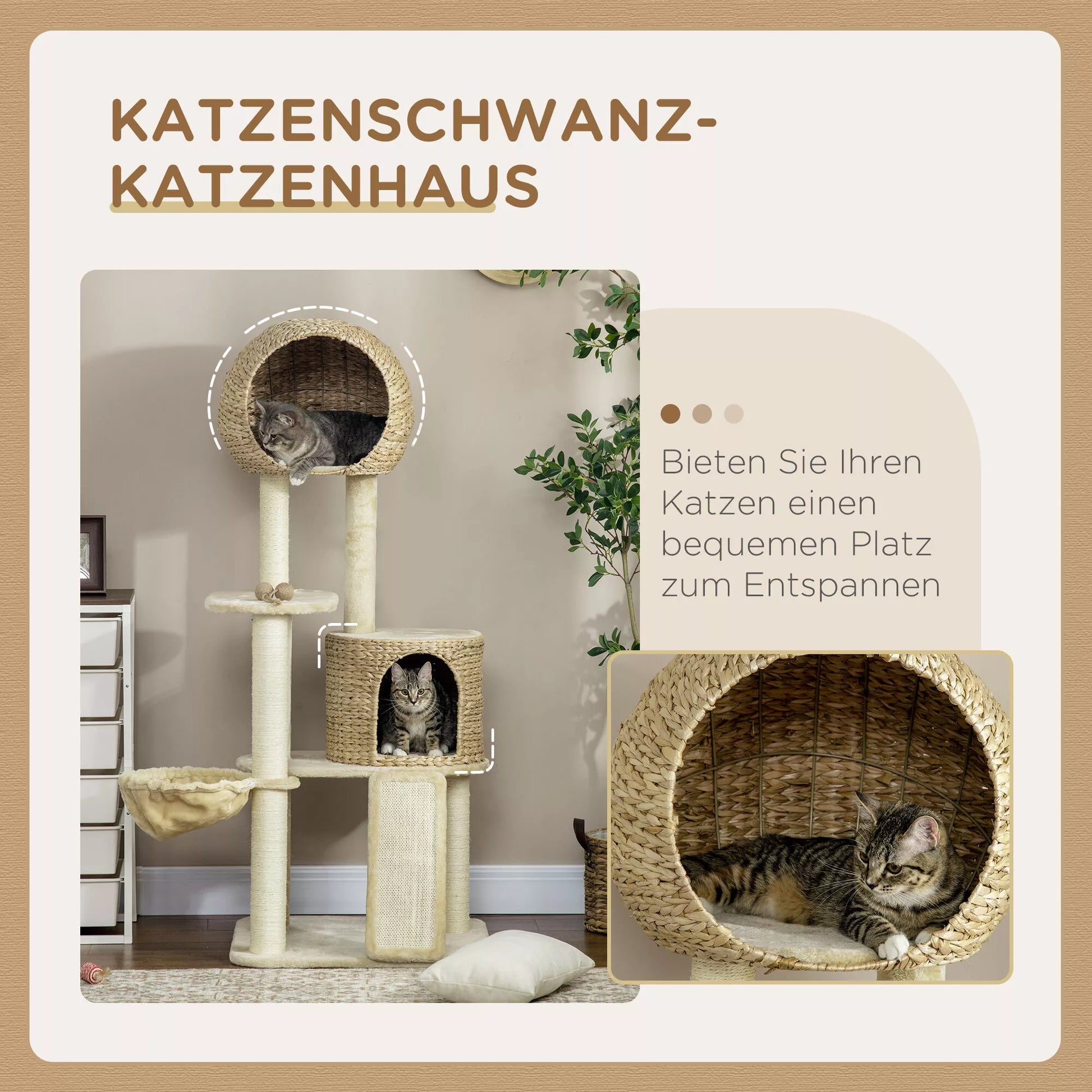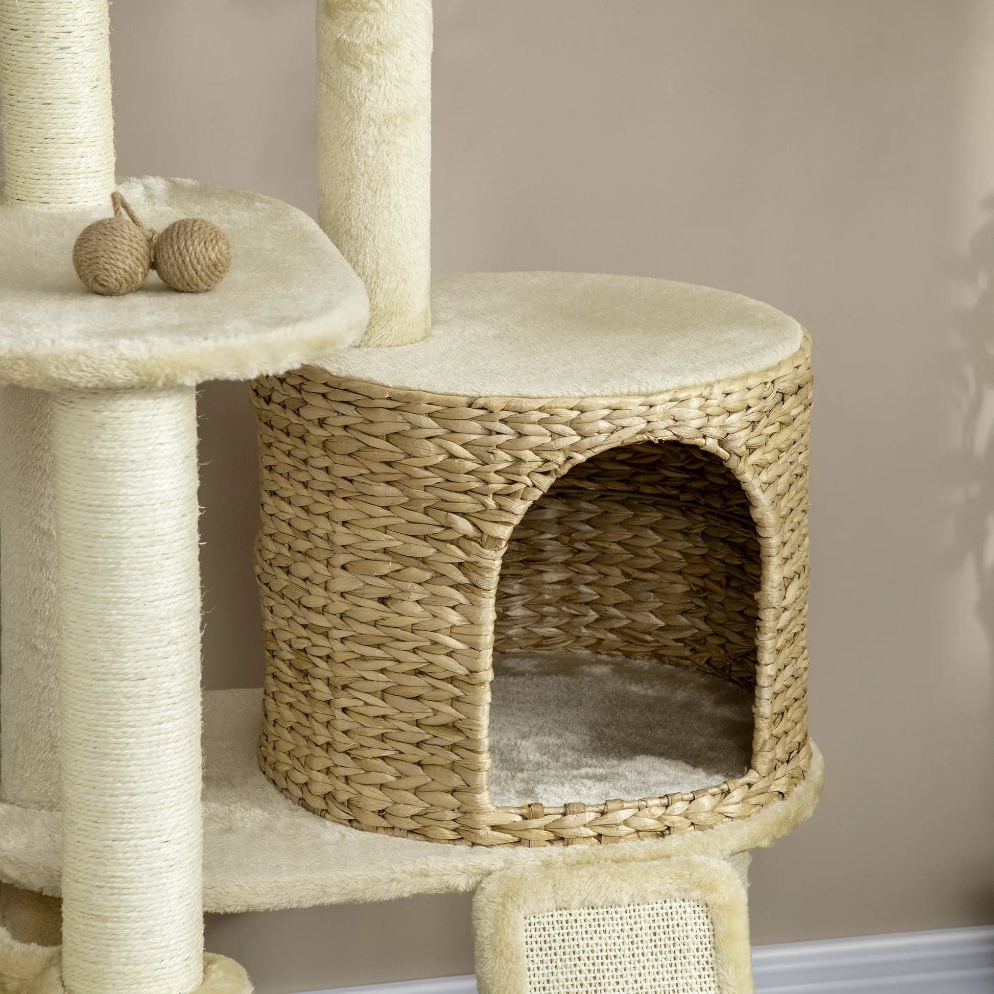 Asināšanas stabs ar kaķu mājiņu, vairākas platformas, šūpuļtīkls, skrāpējamais paklājiņš, pret apgāšanos, bēšs, 60 x 60 x 150 cm