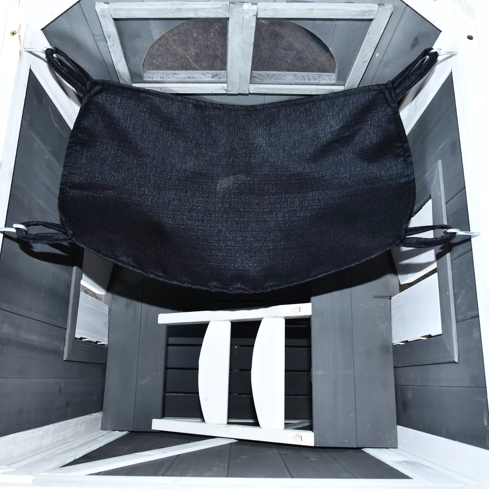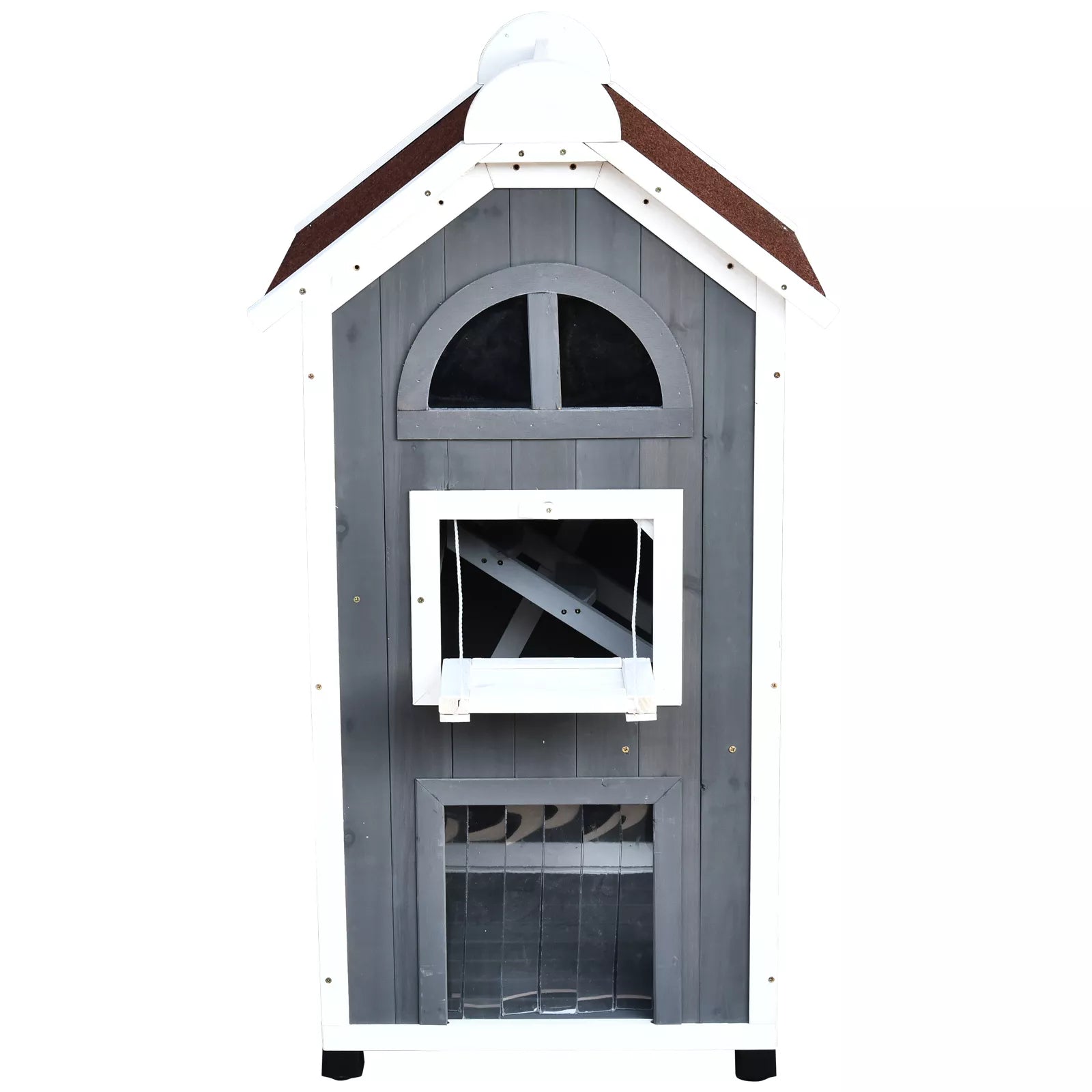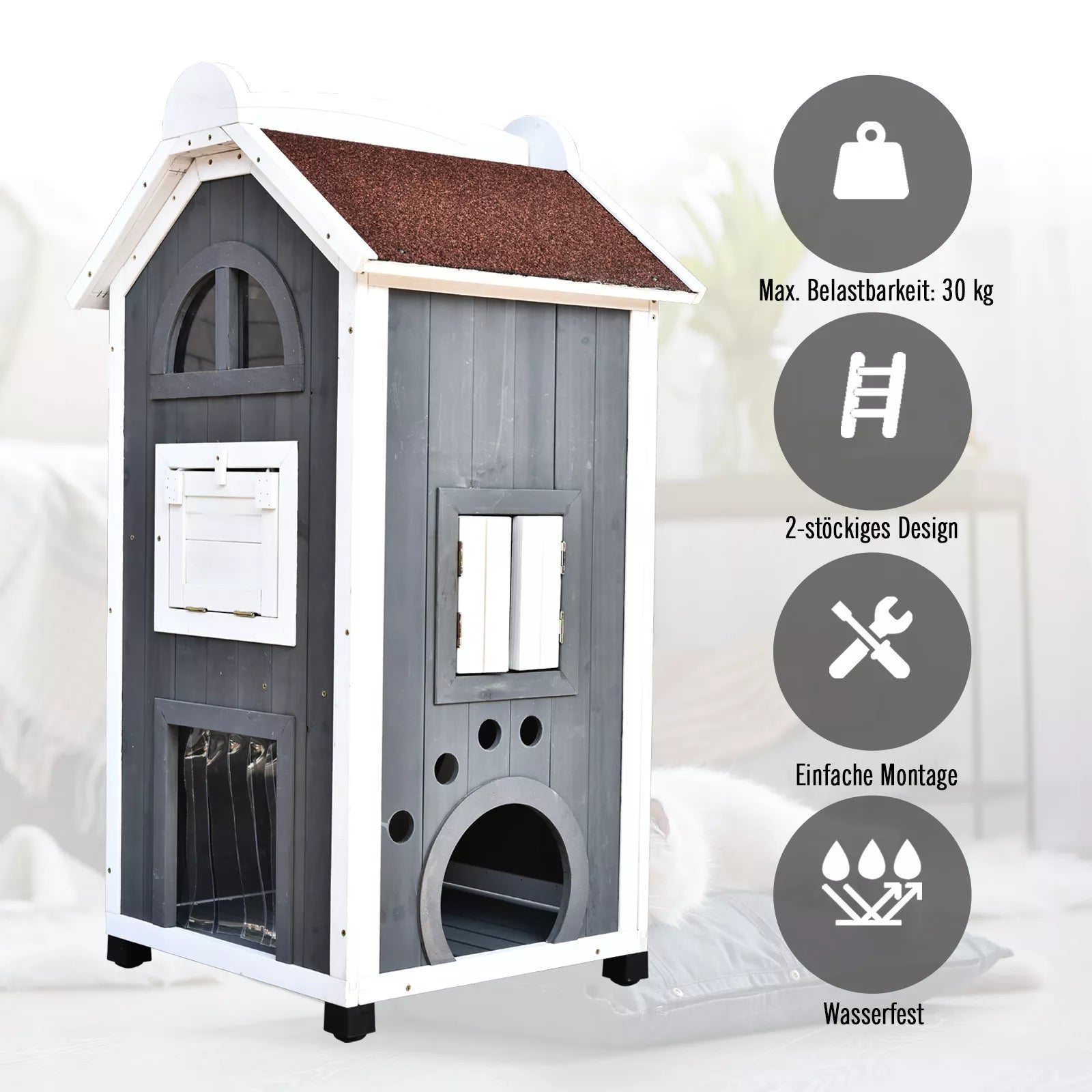 Daudzlīmeņu kaķu māja nepiepildīs visas vēlmes: šeit jūsu mājdzīvnieki var spēlēties, atpūsties un vērot apkārtni. Vairākas ieejas, logs un balkons sniedz labus skatu punktus, un iekšpusē esošais šūpuļtīkls aicina tos gulēt. Kaķu māja ir izgatavota no masīva priedes koka, pārklāta ar asfaltu un laikapstākļiem izturīgu krāsu. Tādā veidā jūsu mājdzīvnieki būs pasargāti no laikapstākļiem pat dārzā. Rūpējieties par saviem mazajiem tīģeriem!