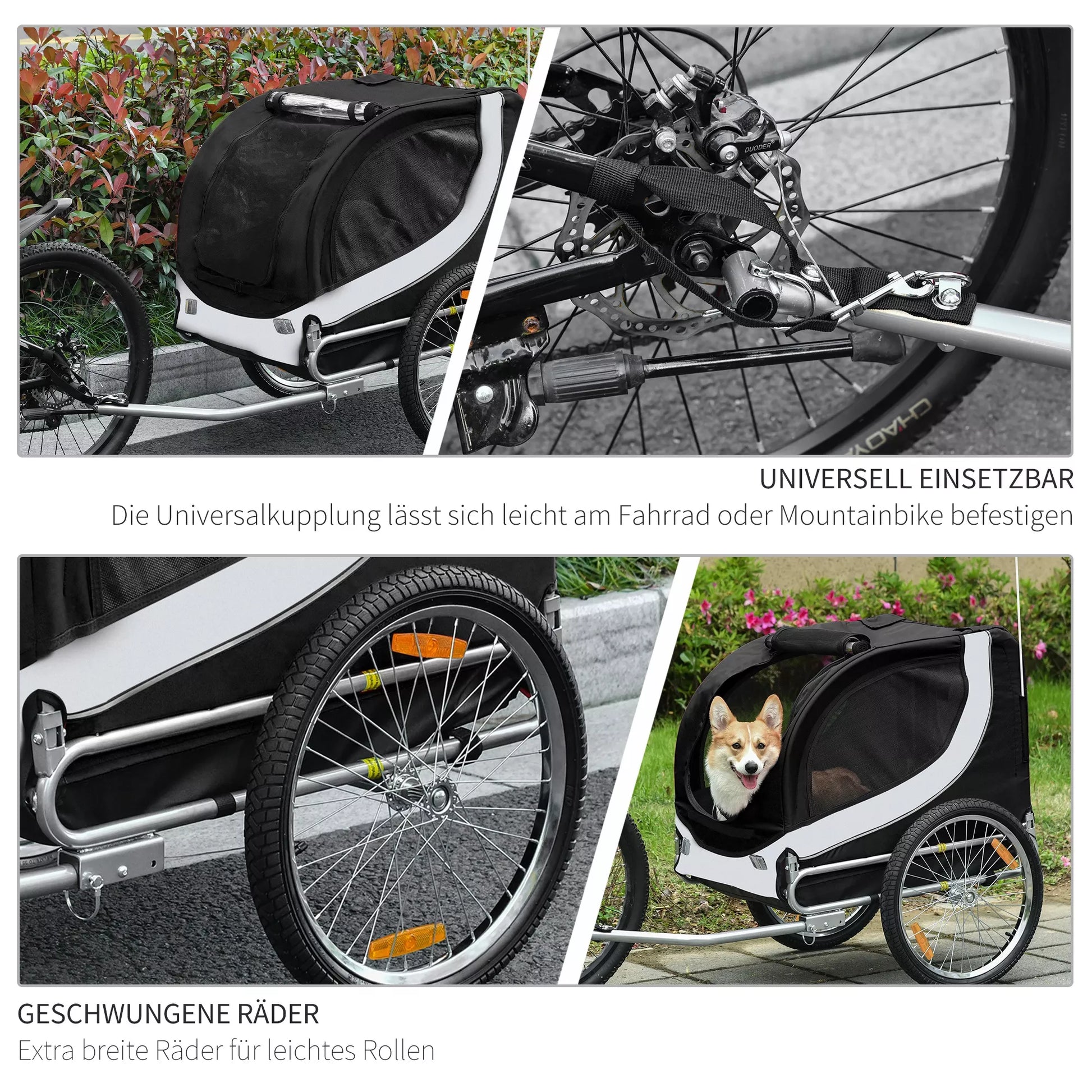 Velosipēda piekabe suņiem līdz 20 kg, sieta logs, sarullējams pārsegs, universāls savienotājs, balta+melna