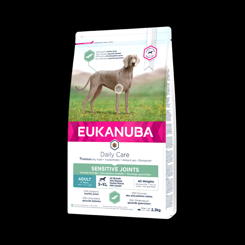 Eukanuba Daily Care sausā suņu barība suņiem ar locītavu problēmām. Sastāvā esošais glikozamīns un hondroitīns palīdz uzturēt veselīgas locītavas un atbalsta aktīvas kustības. Turklāt L-karnitīns palīdz kontrolēt svaru un mazināt locītavu stresu. Īpašā sešstūrainā barības granulu forma apvienojumā ar unikālo DentaDefense formulu palīdz uzturēt zobus tīrus un veselīgus. Eukanuba Daily Care sausā suņu barība suņiem ar jutīgām locītavām satur svaigu vistu, lai uzturētu muskuļu masu. Pielāgots prebiotiķu un cukurbiešu mīkstuma šķiedru maisījums veicina veselīgu gremošanu. Barība ir 100% pilnvērtīga un sabalansēta, un tā ir ideāli piemērota visu šķirņu pieaugušiem suņiem.