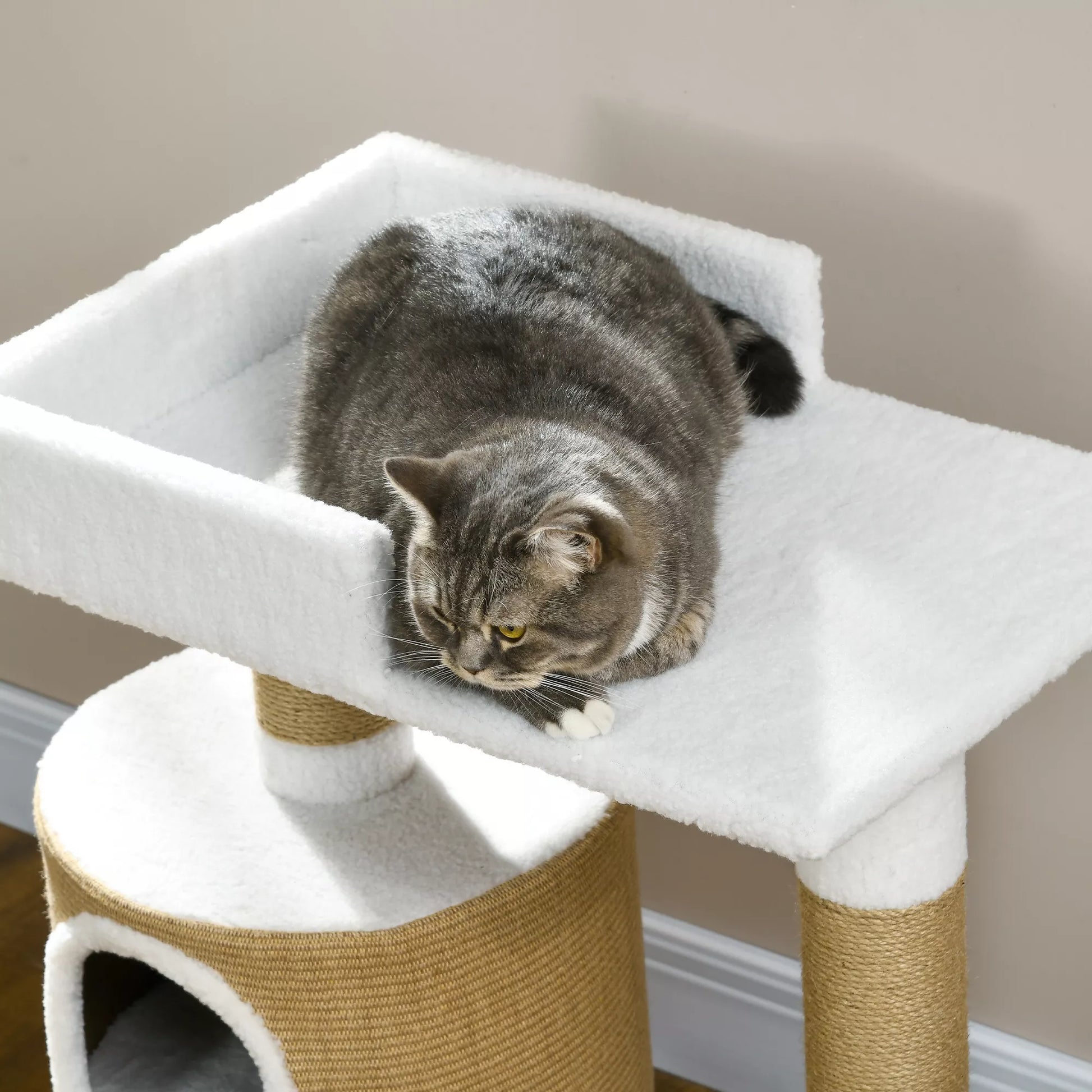 Atpūta un izklaide vienā reizē ar šo kaķu koku. Tajā ir kaķu mājiņa, kaķu gulta un nagu asināšanas stabi — vieta, ko varat izmantot gan dienā, gan naktī dažādām aktivitātēm. Šī kāpšanas torņa nagu asināšanas stabi ar džutas virvi ļauj jūsu kaķim asināt nagus un aizsargāt jūsu mēbeles. Oderēts ar mīkstu mākslīgo kašmiru un piedāvā daudz vietas komfortam. Izgatavots no skaidu plātnes un ar stabilu pamatni stabilitātei un drošībai.